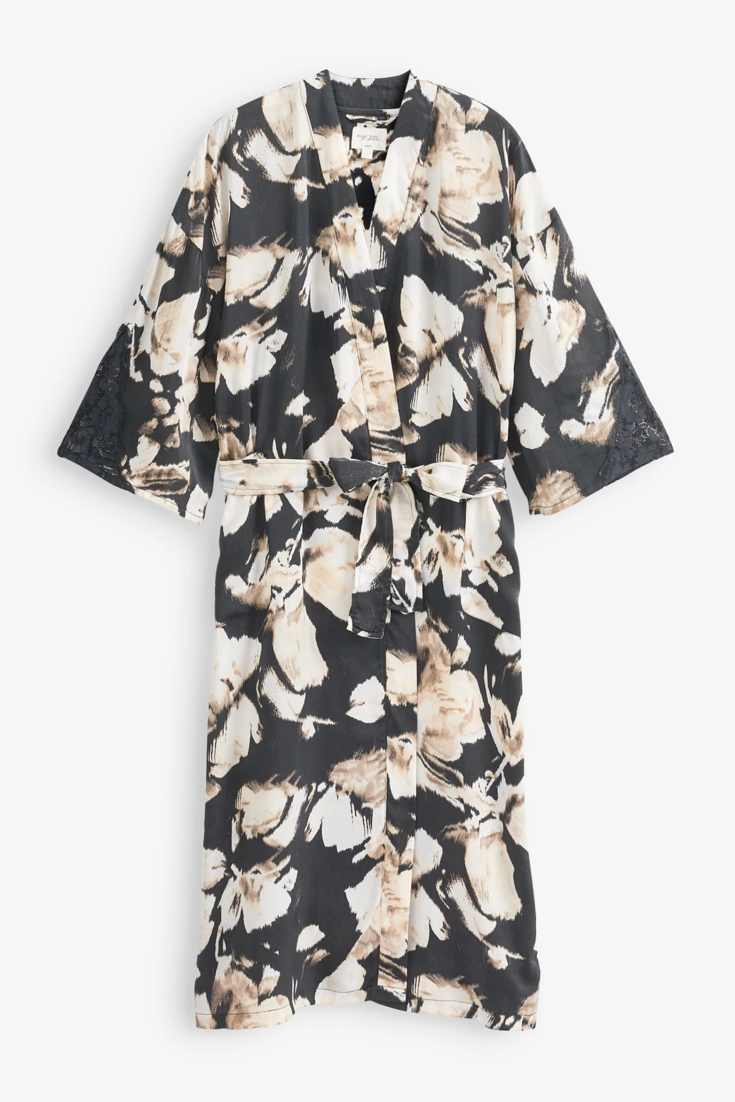 Lightweight satin fabric, waist tie, lace panel on the sleeve cuff, side pockets.