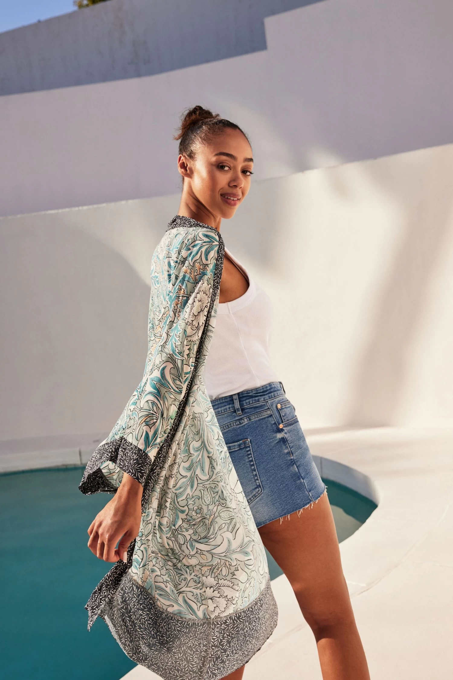 Hello, warm weather. Our blue Morris & Co. floral print kimono is an absolute sunshine staple. Designed in a floaty fabric with the iconic Morris & Co. floral print, style over a simple tee and shorts to elevate your summer styling.