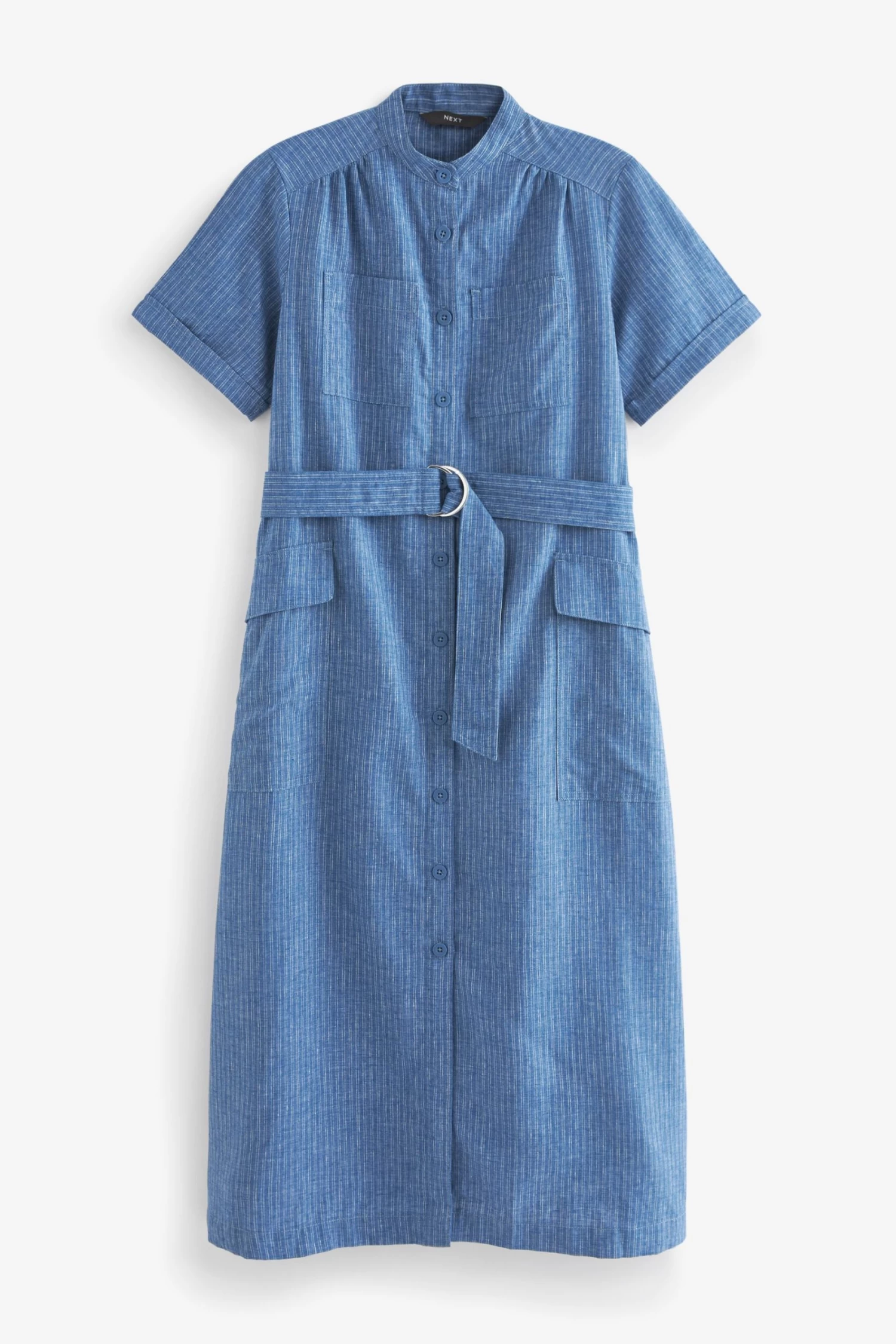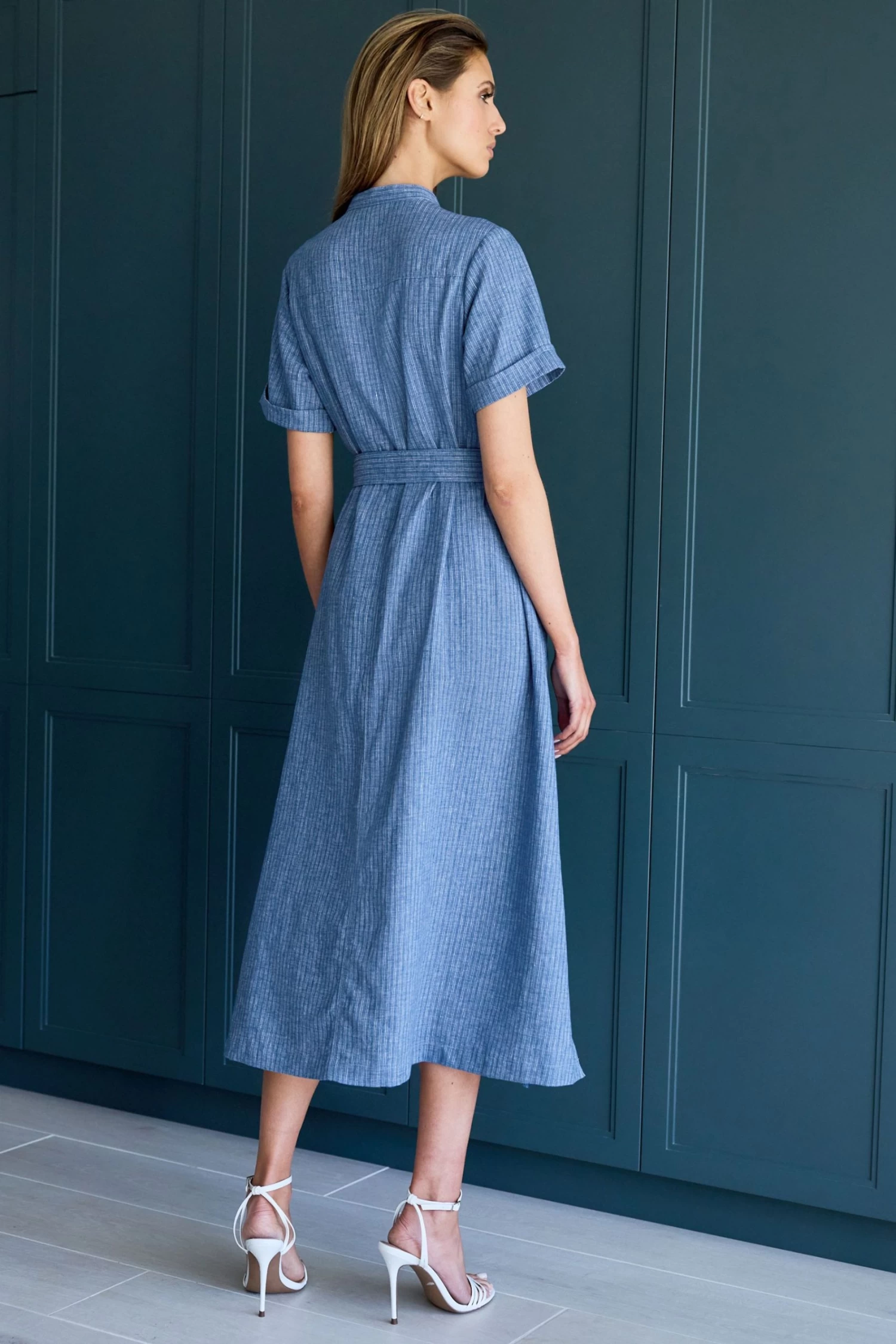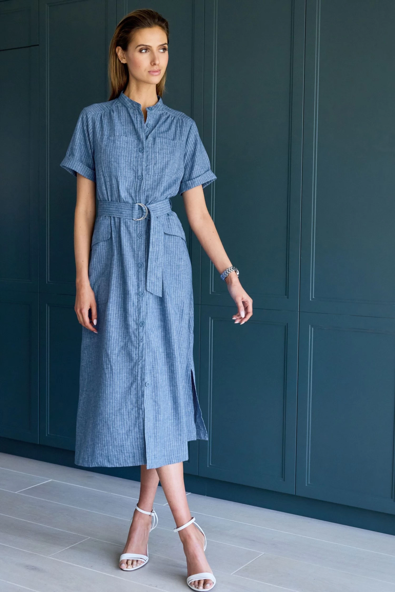 Stylish and sophisticated, this shirt dress is perfect for those days when you want a more dressed up look. Simply throw-on this chic style with sandals for effortless elegance with minimum fuss. Designed in a midi length, this linen blend blue stripe dress has lots of great details which elevate it beyond the everyday. Boasting a grandad collar, button through fastening and a D-ring belt to cinch you in at the waist, it also features turn-up detailing to the short sleeves, pockets and a side split detail at the hem.