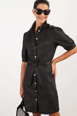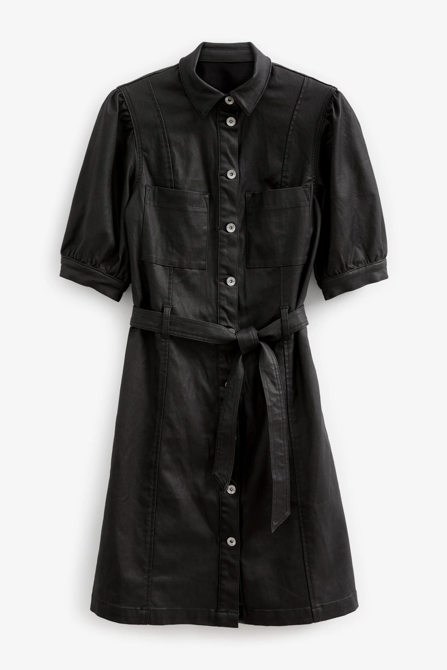 Glam, edgy and sophisticated styles are all rolled into one with this coated denim dress. Designed in a mini-length shirt style with silver button-through fastenings. A versatile choice that looks just as good with trainers, chunky boots, or heels. Double chest pockets Mid-length balloon sleeves Belt to cinch in the waist