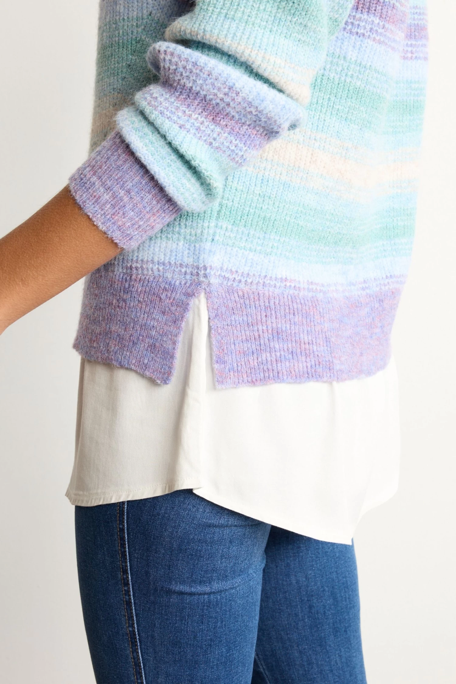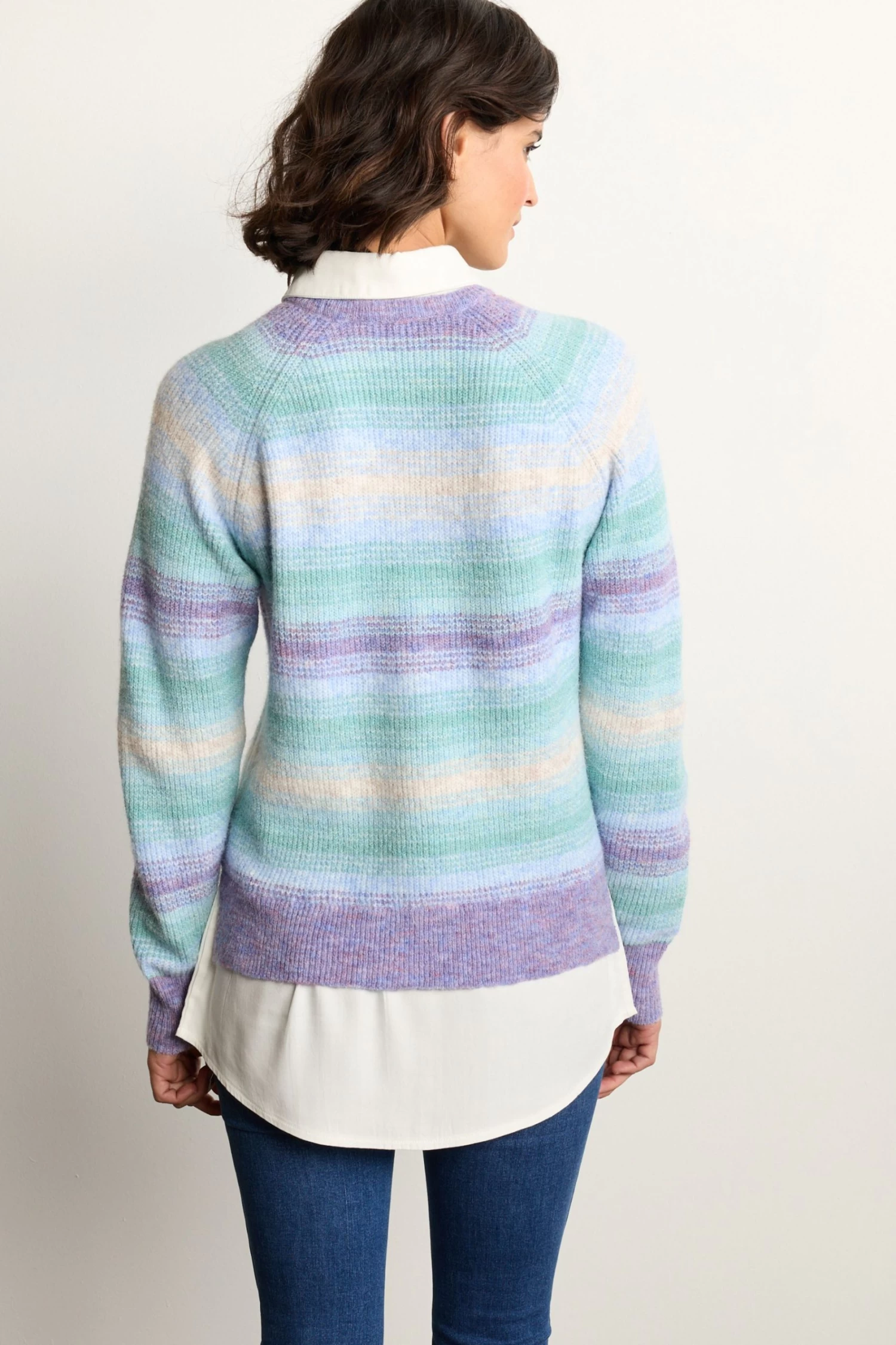 Space dye ombre jumper. White collared shirt layer. Long sleeves. Crew neck.