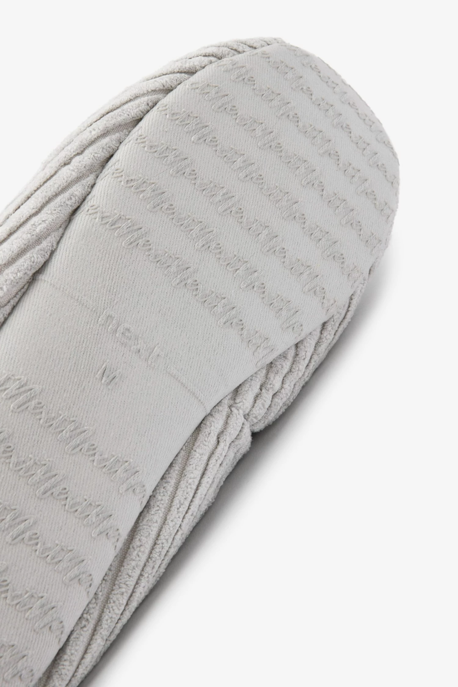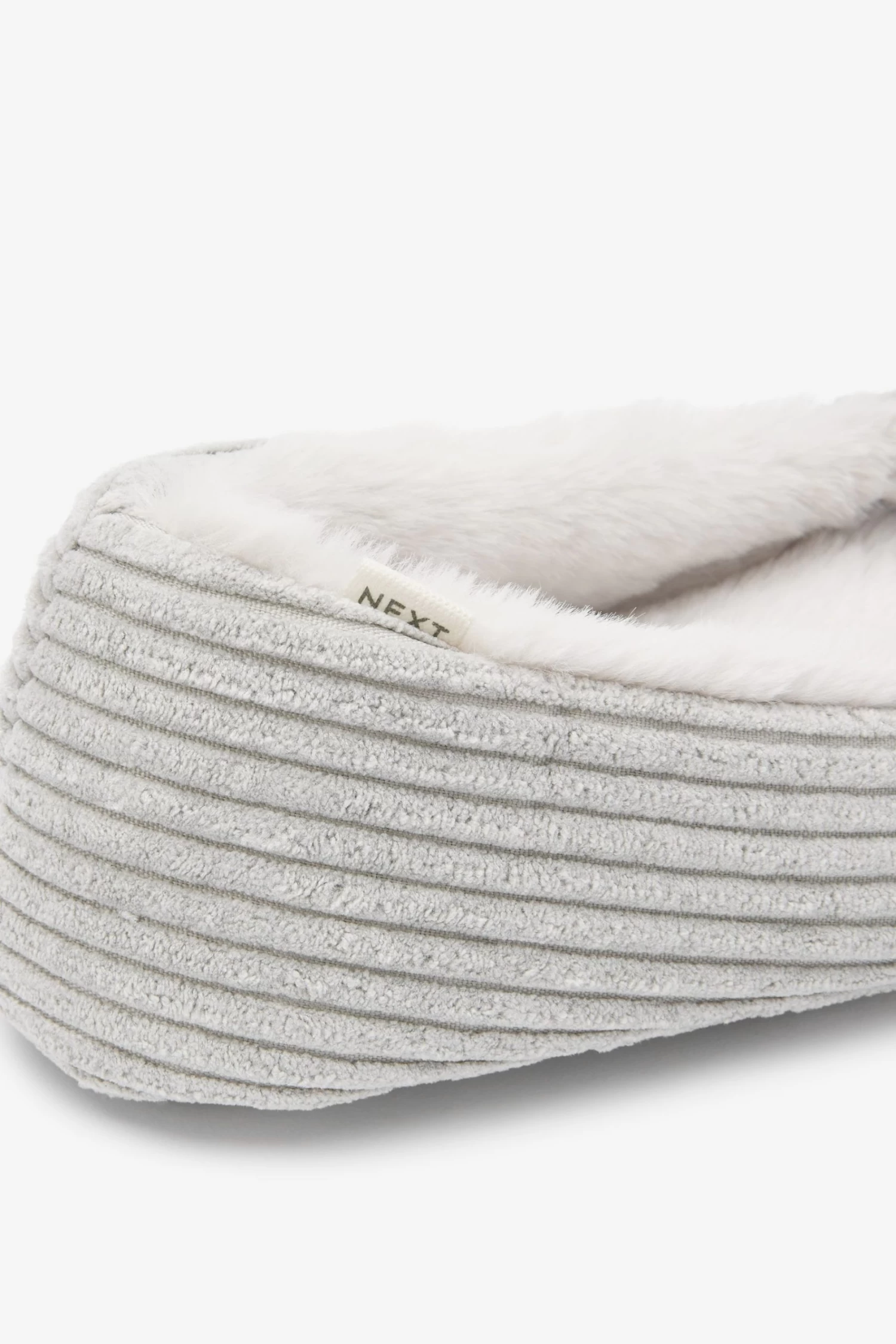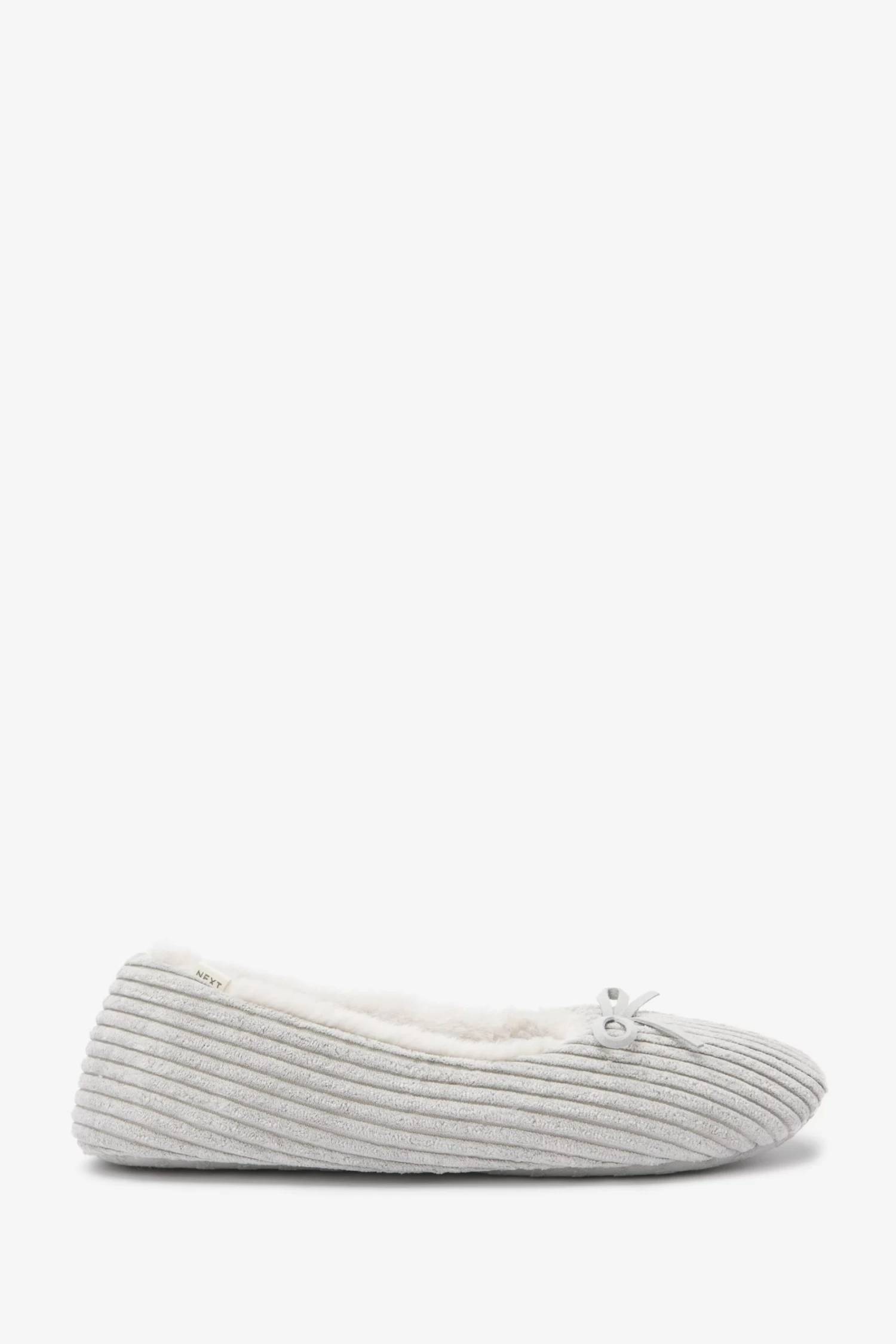 Ballerina Slippers. Faux fur lining. Bow detail. Corduroy fabric outer. Slip-on style. Flat heel.