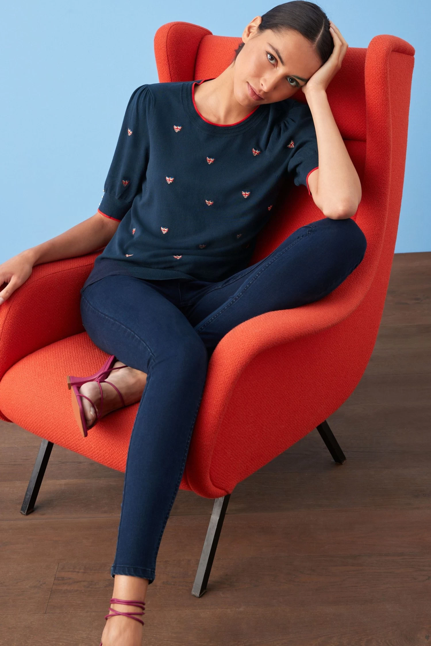 Coronation print. Crew neck. Short sleeves. Gem detail on sleeves. Ribbed trims.