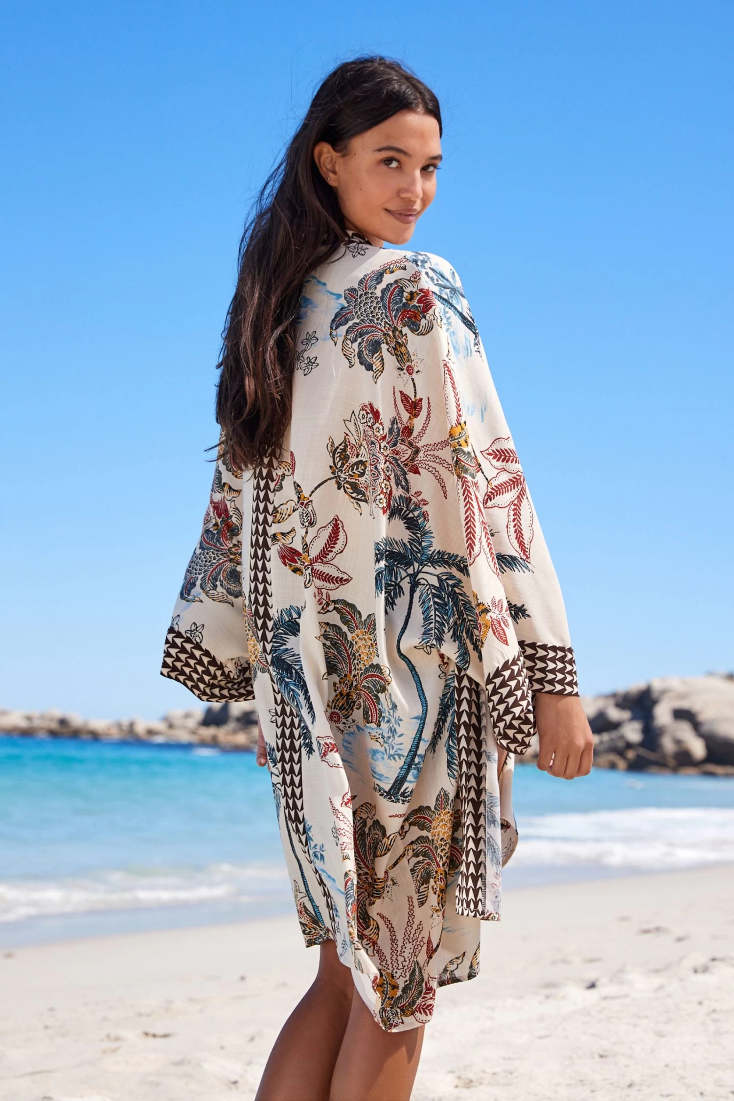 This summery kimono is the perfect beach coverup. With palm all-over print and border detailing. Palm all-over print. Open front. Longline border. Long sleeve.