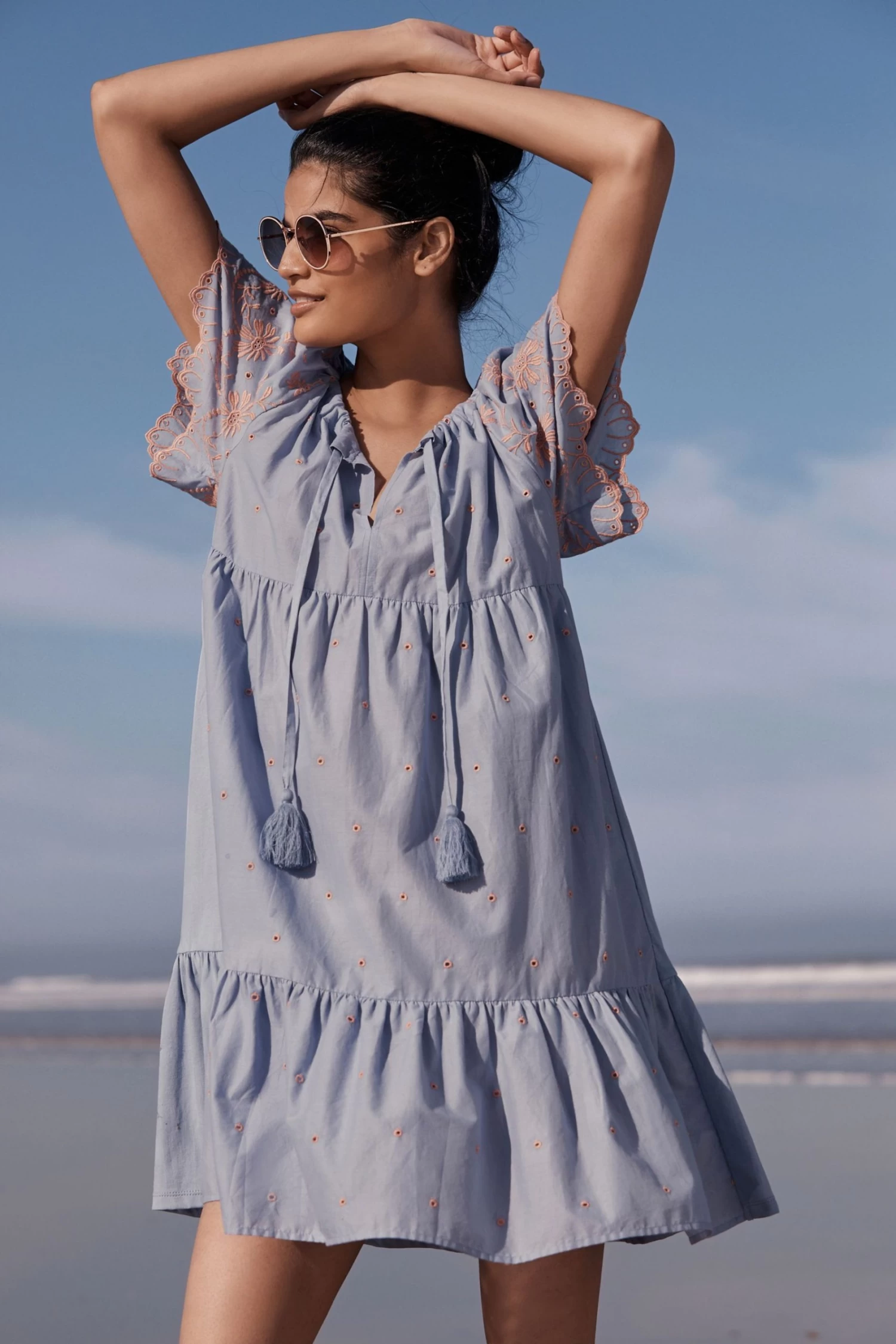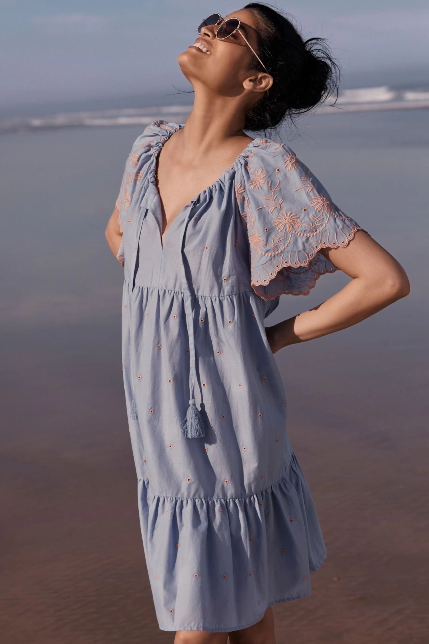 Floral contrast broderie detail. Tie detail neckline. Elegant casual styling. Angel sleeves. Embroidered detail to sleeves. Tiered skirt. Mini length. Cotton rich.