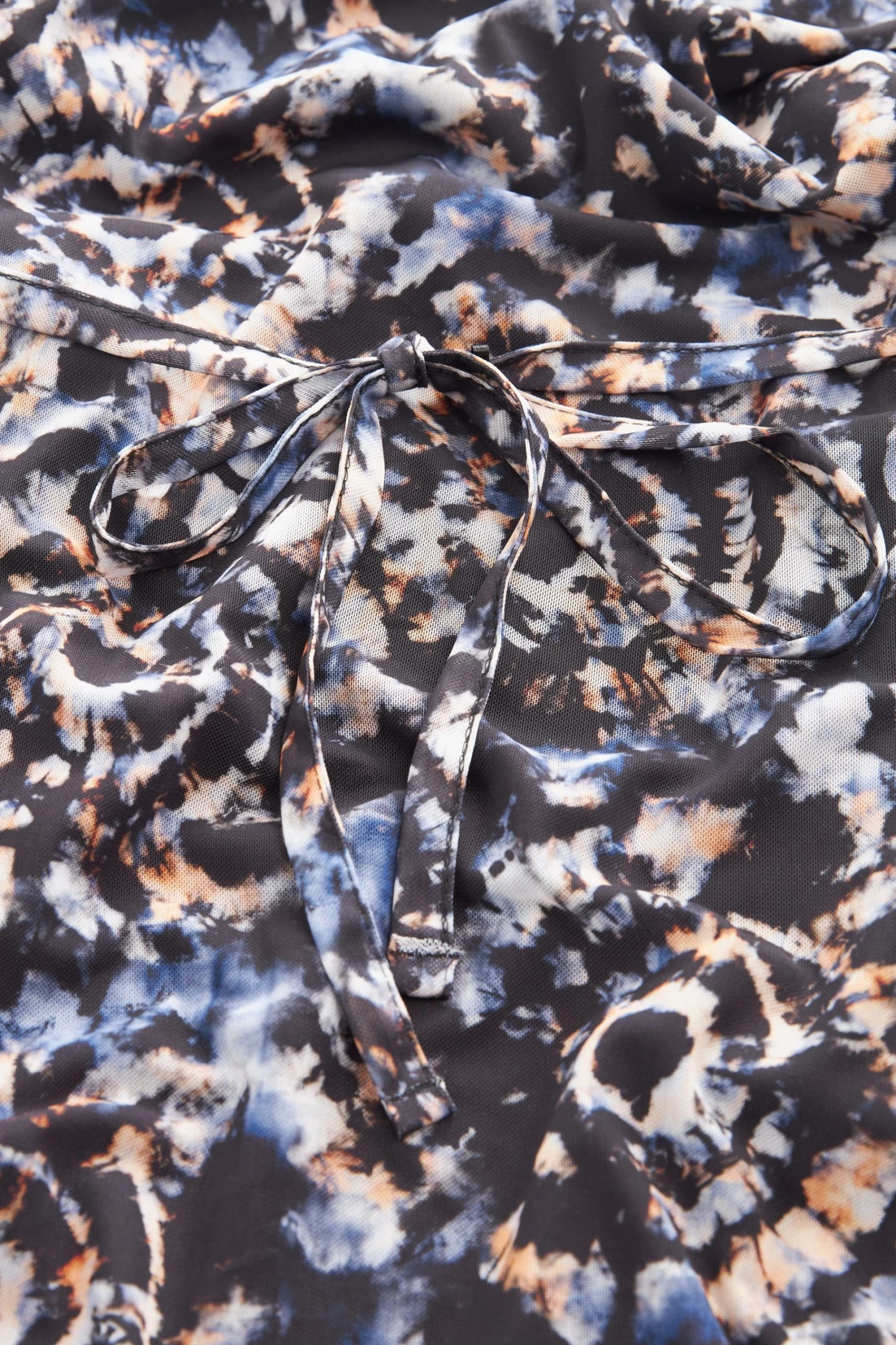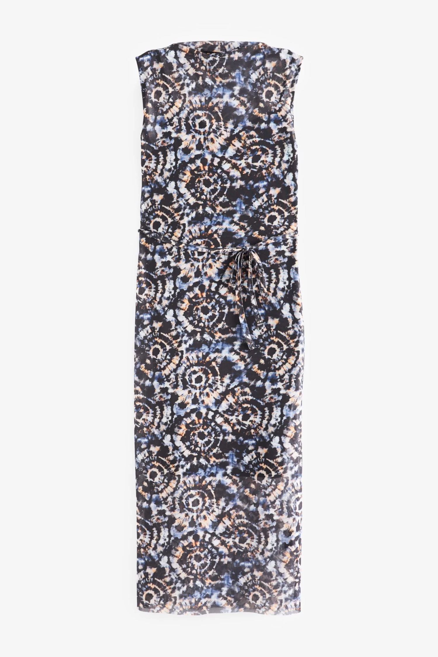 High neck. Tie waist. Fitted silhouette. All-over printed design. Comfy stretch mesh. Soft jersey lining. Midi length. Sleeveless.