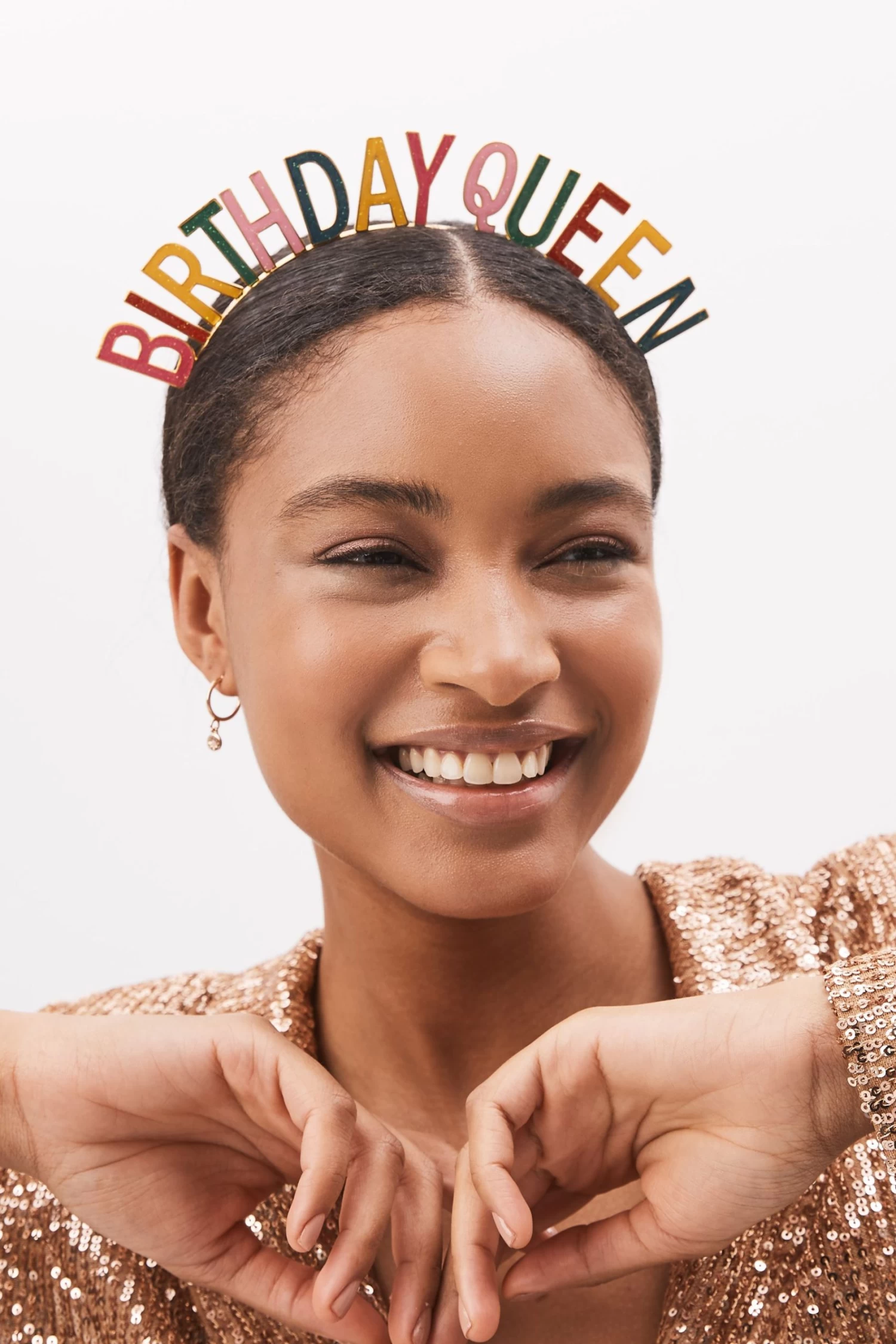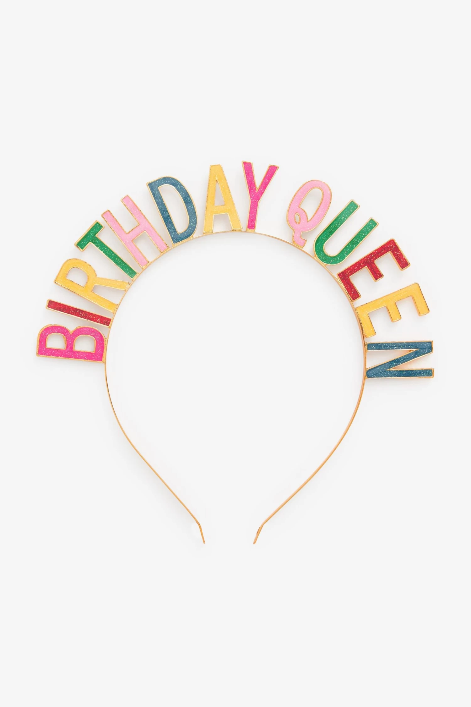 Birthday queen headband in multicolour. One size. Thin band. Gold-tone metal.