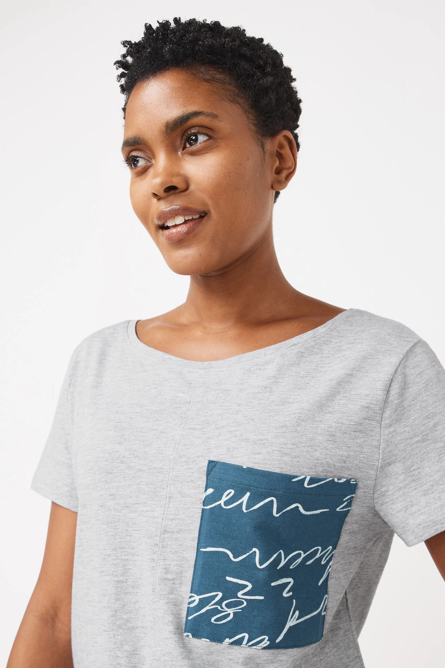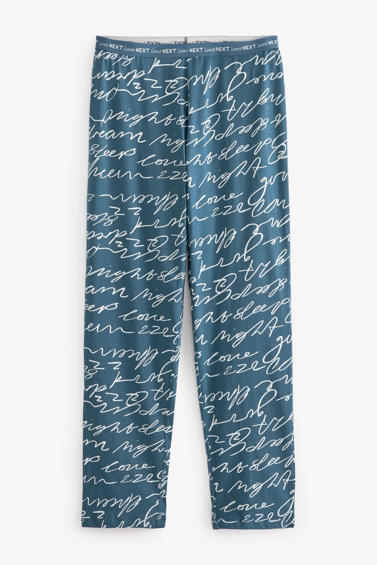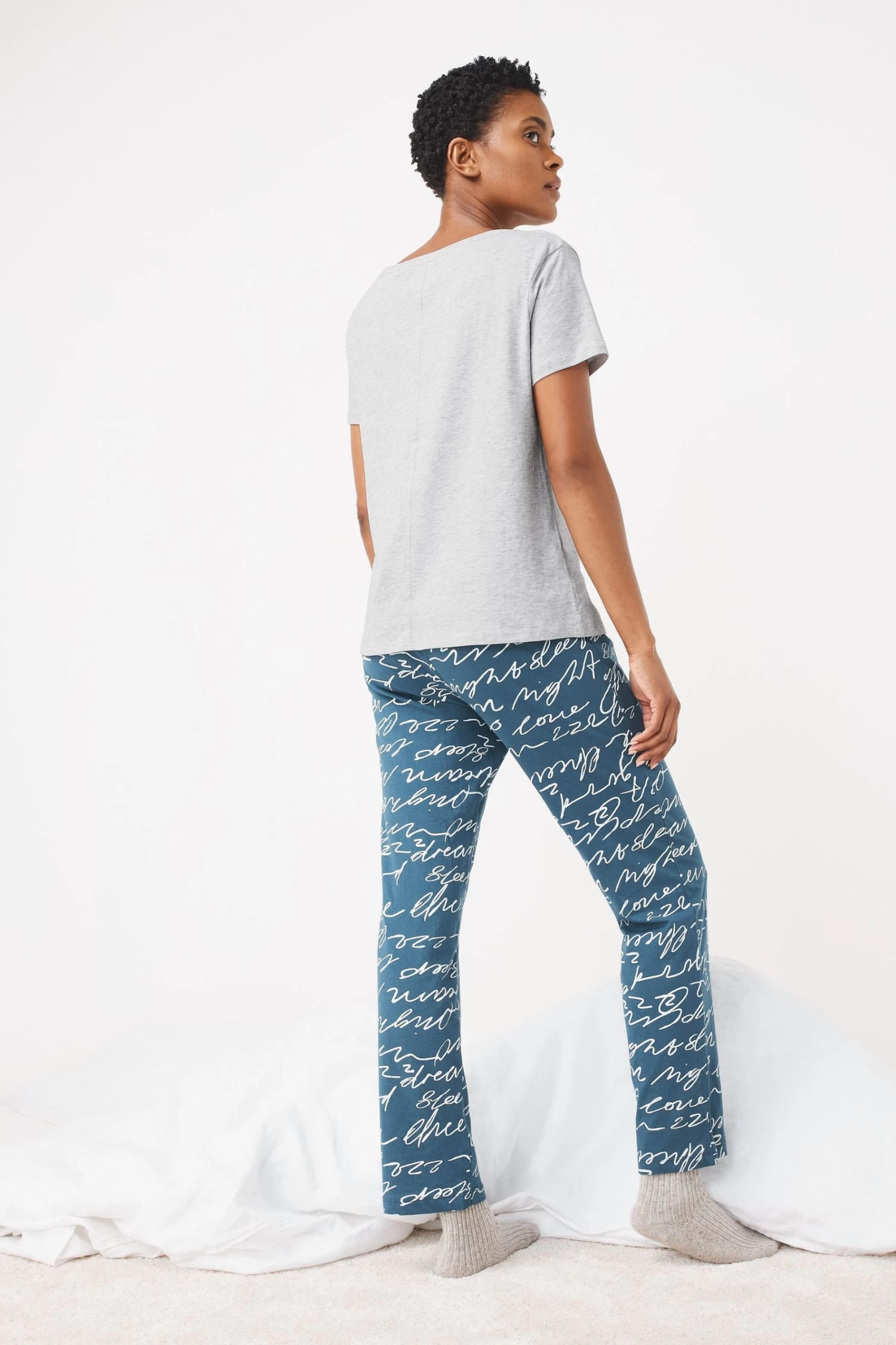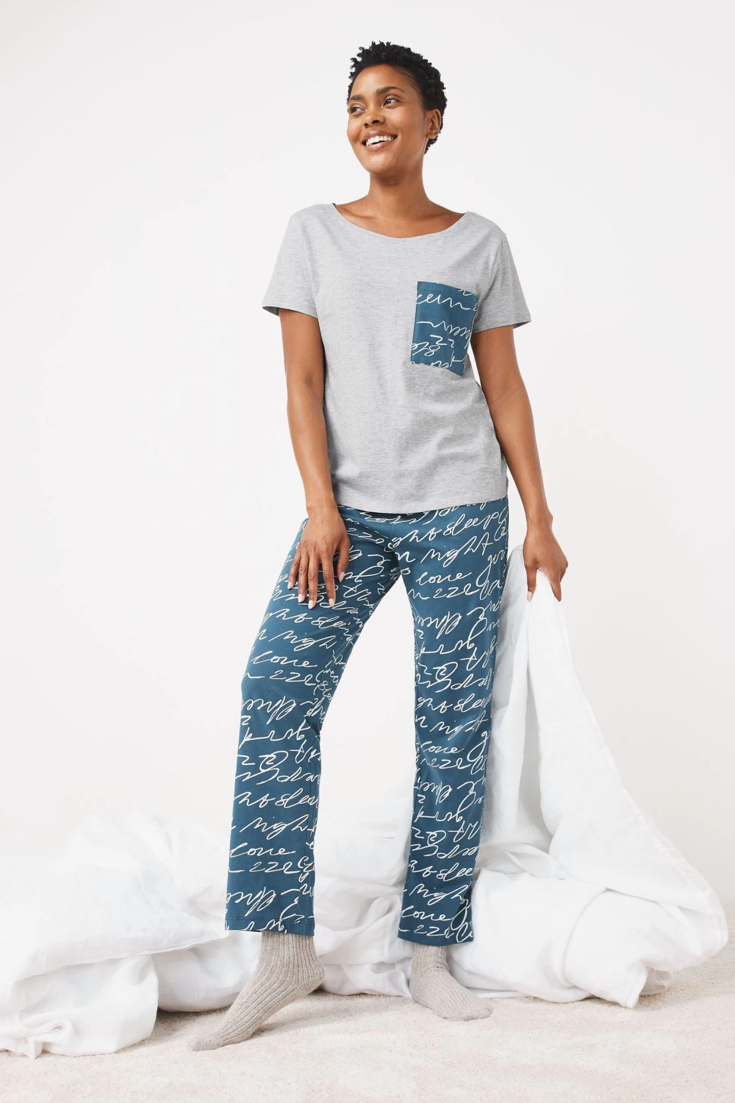 Guaranteed to keep you cosy on those cold nights, snuggle up in style wearing these pyjamas. The two-piece set includes a classic t-shirt top in grey with a front patch pocket and comes with a matching pair of trousers that is decorated all over in a blue and white script. Made from soft and breathable cotton, these pyjamas offer a loose fit that will keep you comfortable throughout the night.