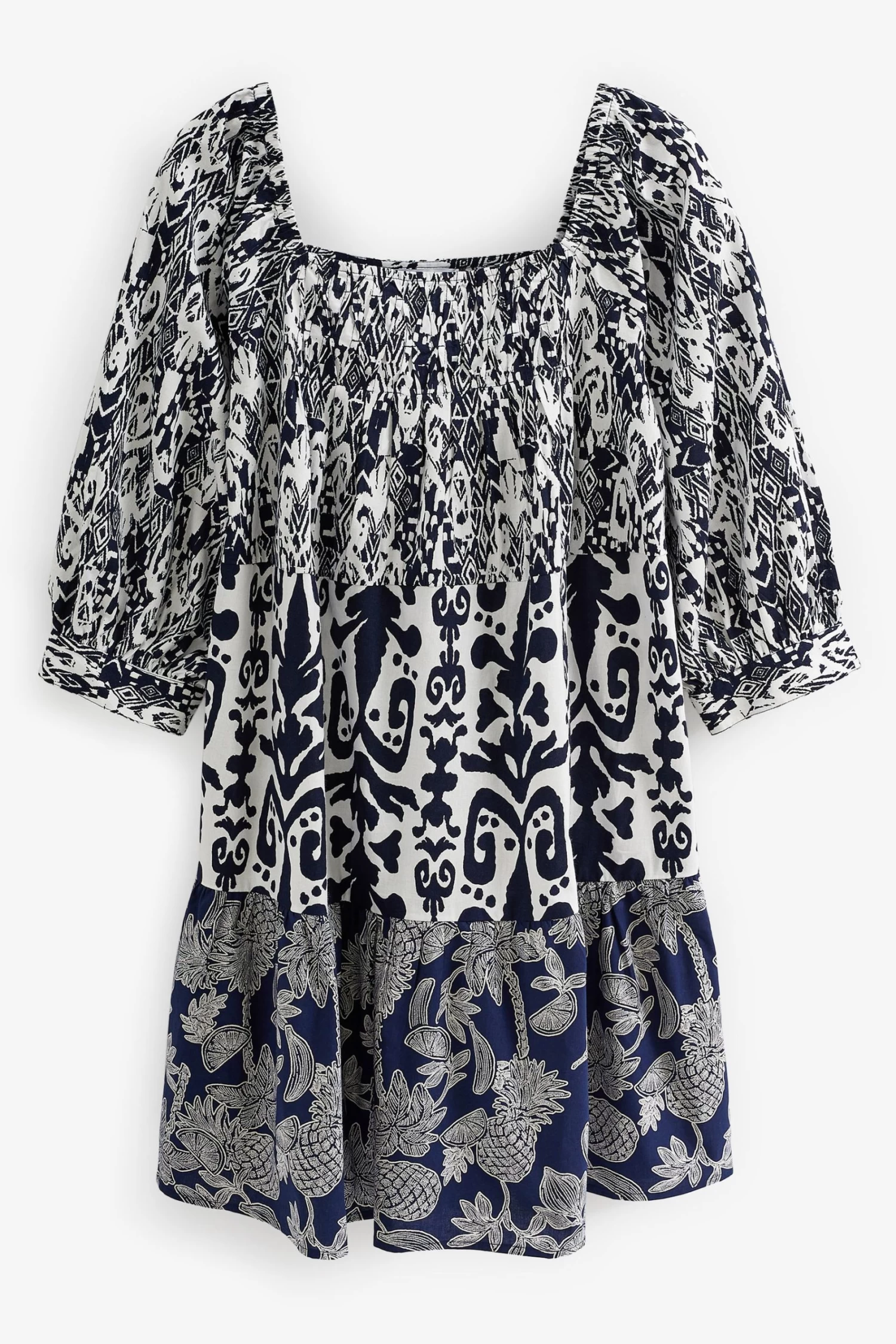 Tiered mini dress, Woodland Weeds print, Square neck, Inverted box pleat design, Off-the-shoulder style, Three-quarter puff sleeves.