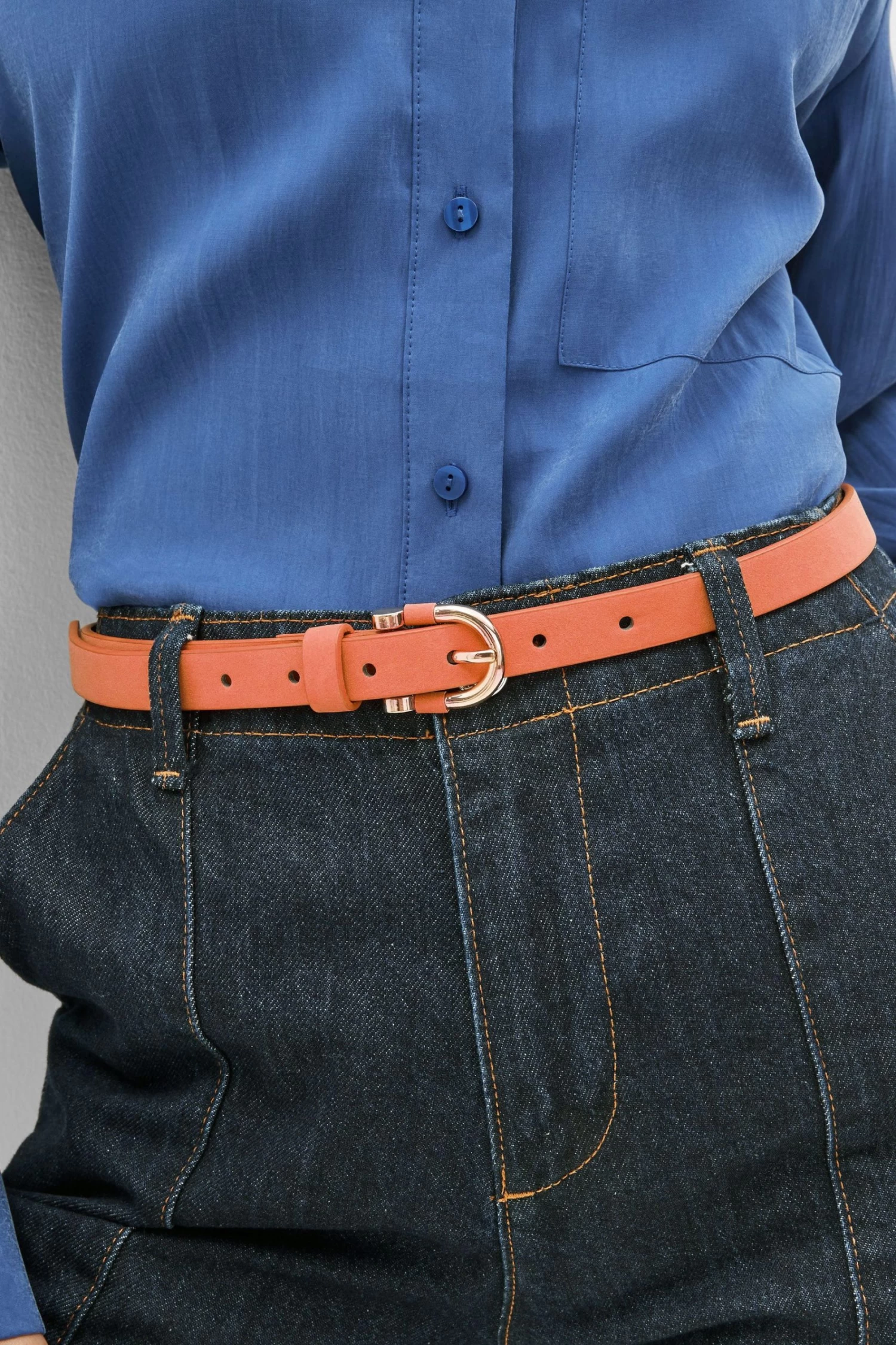 Skinny belt. Buckle cover detail. Gold hardware. Available in multiple sizes.
