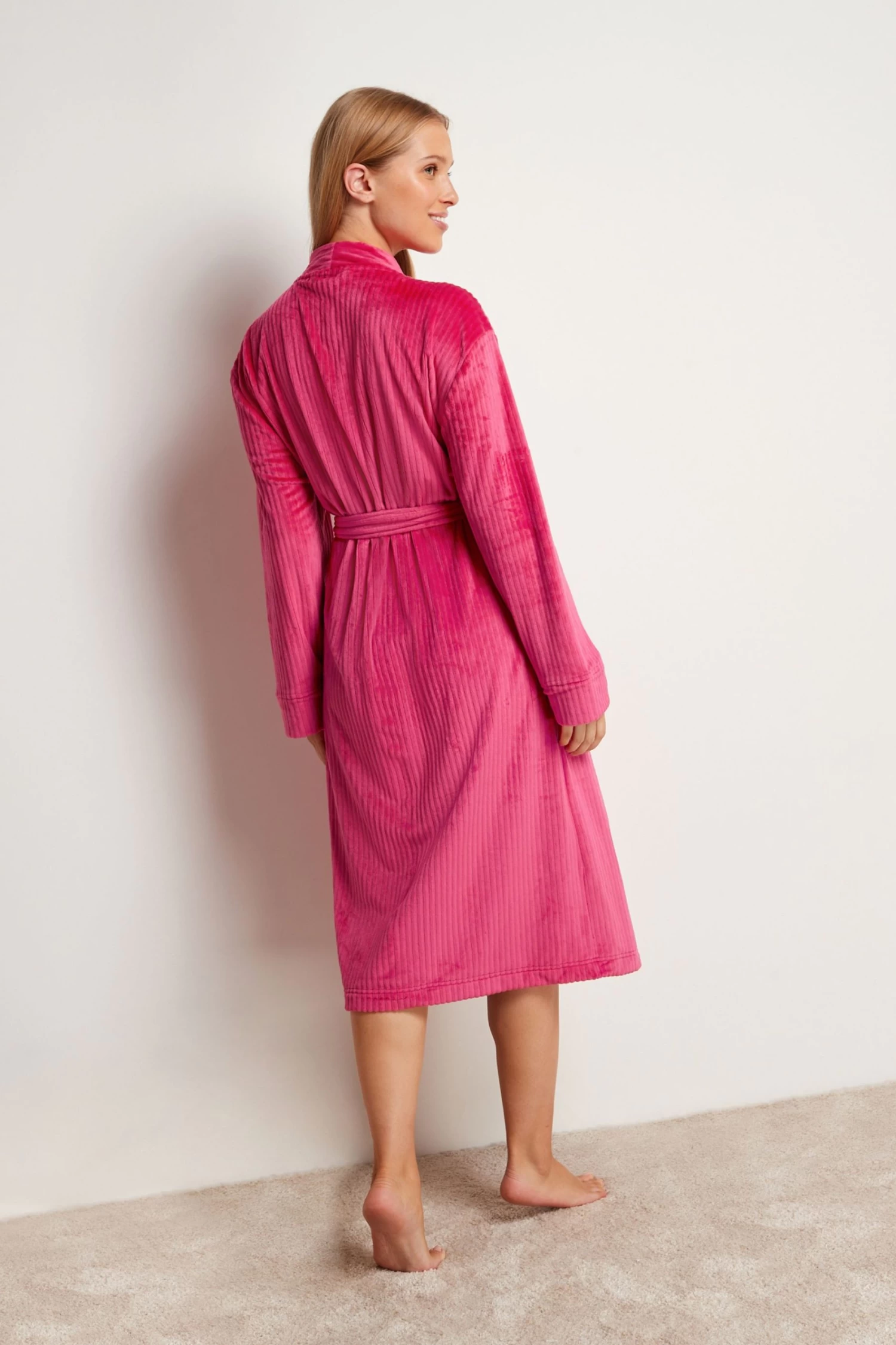 Dressing gown. Ribbed fabric. Open front style. Self-fabric tie belt. Long sleeves. Large front pockets. Long length.