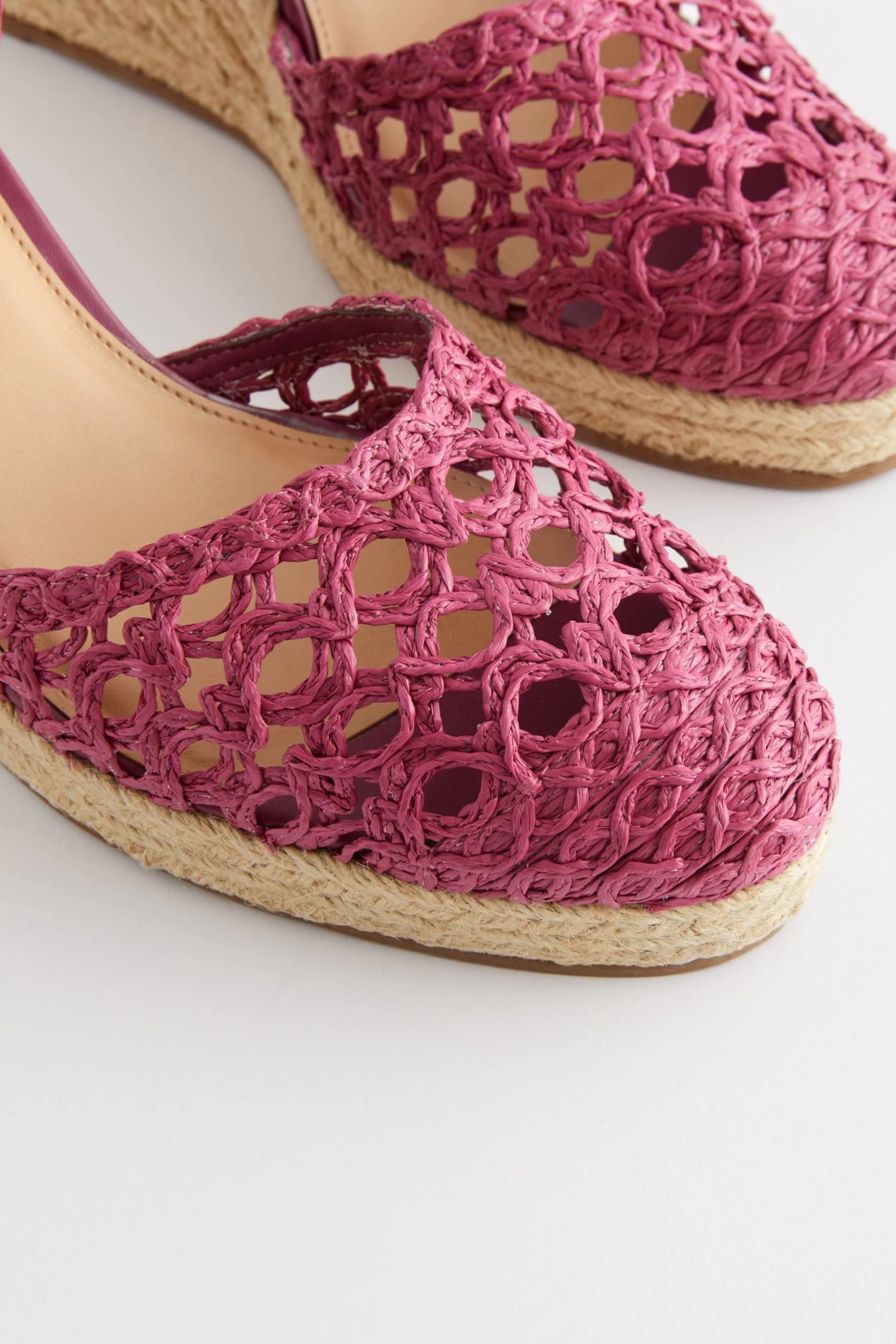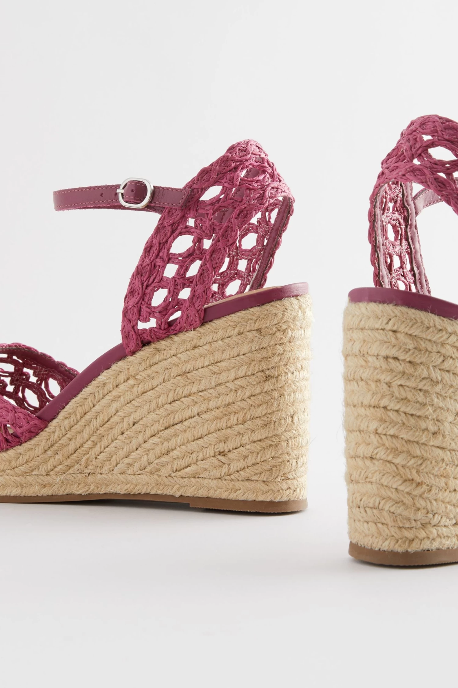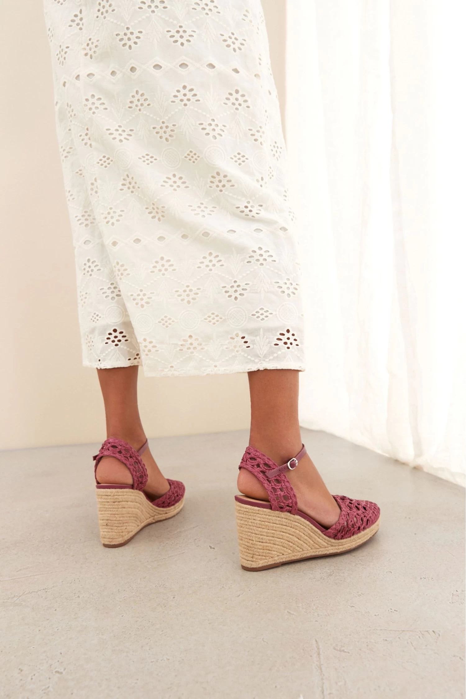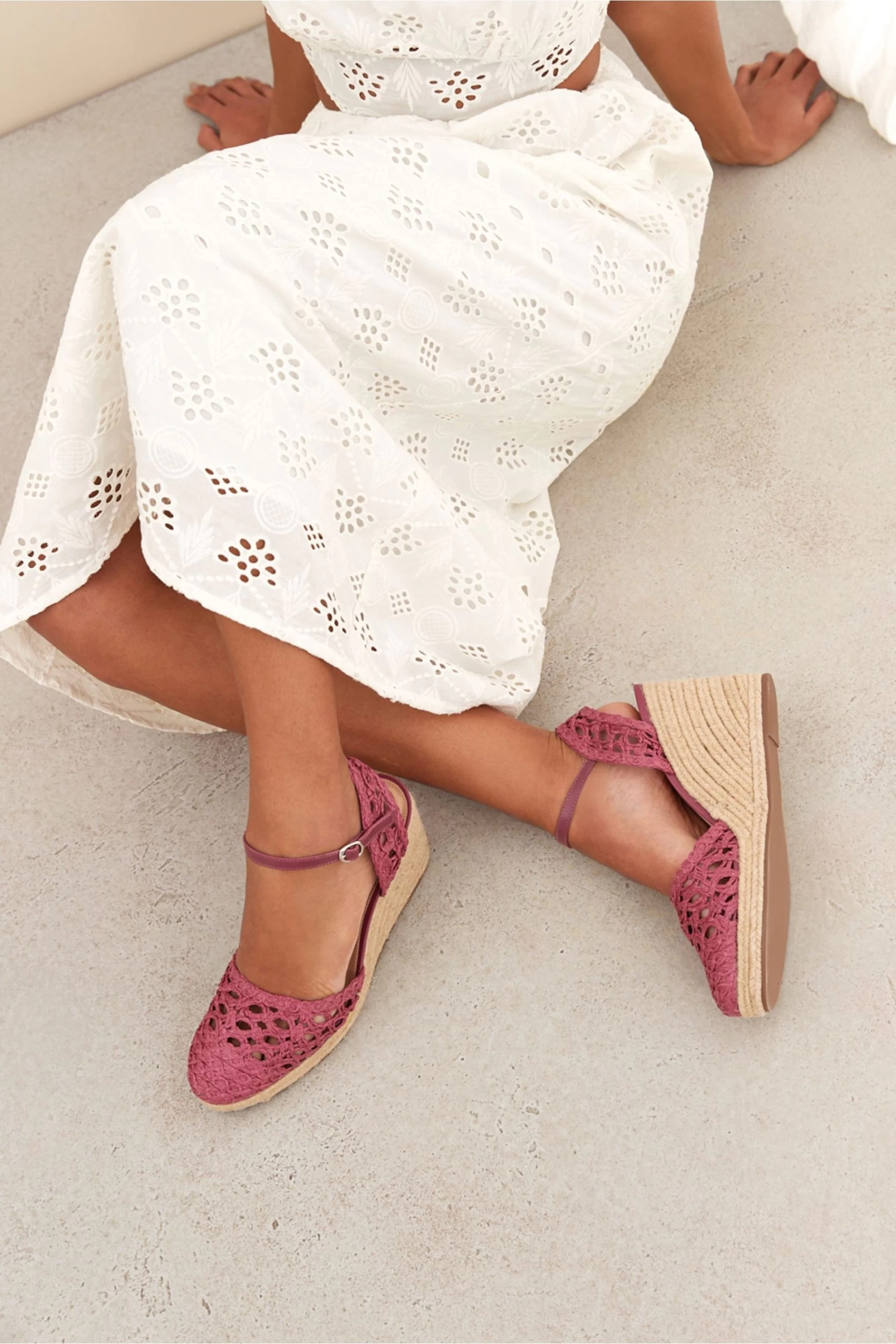 Macrame design. Ankle strap. Wedge heel. Signature copy. Crochet knit. Closed toe. Forever Comfort memory foam padding.