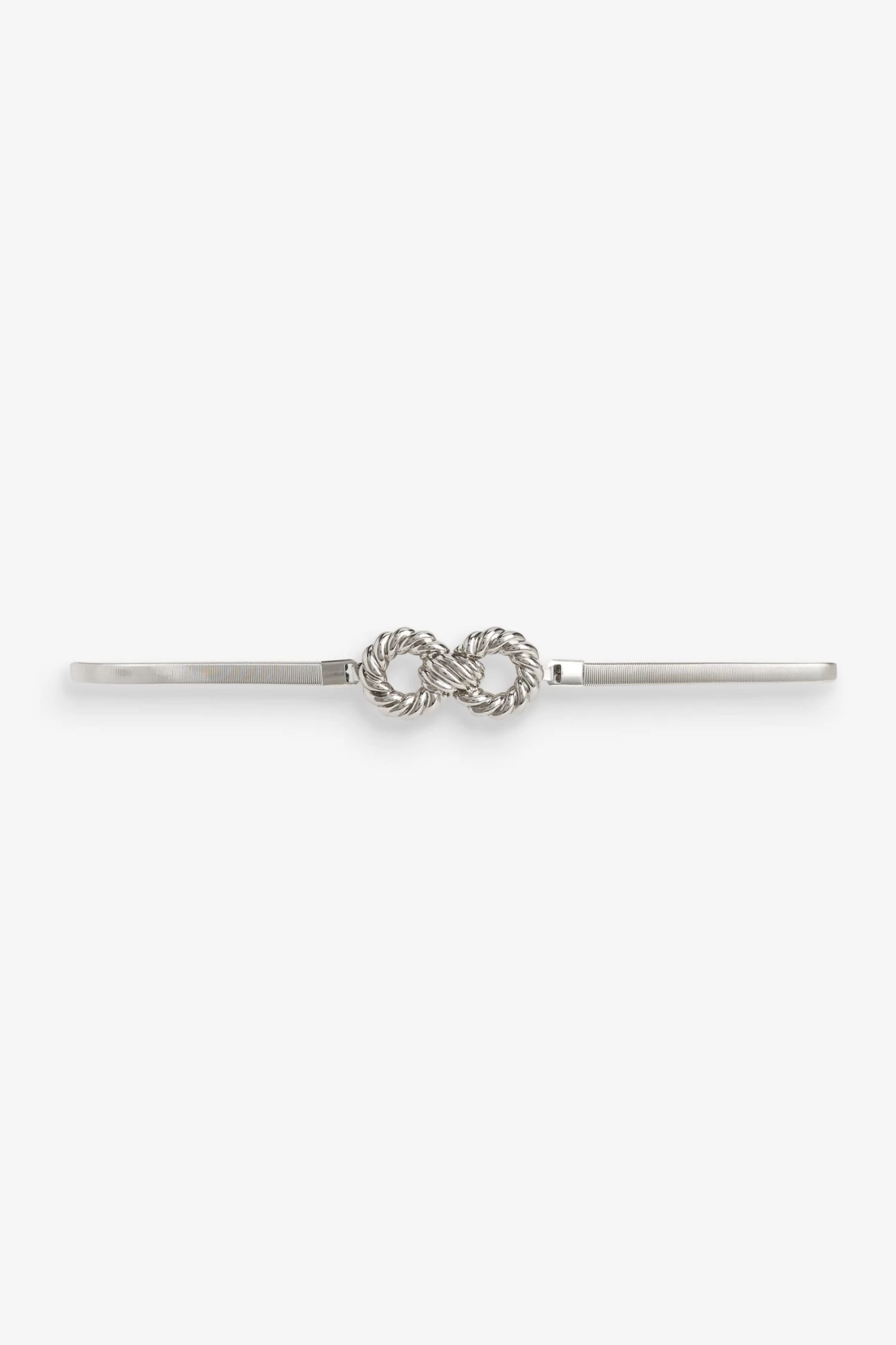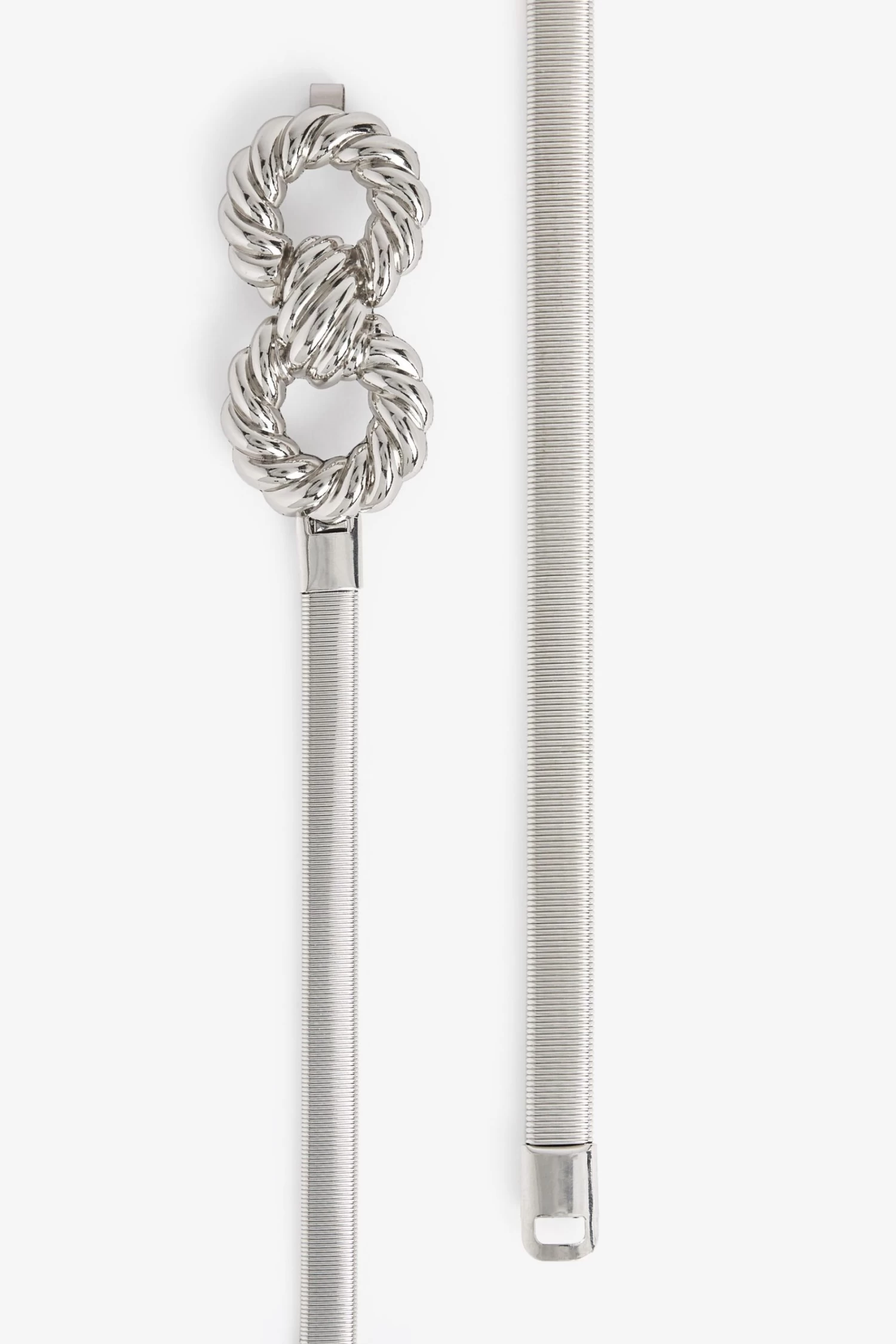 Skinny size. Stretchable. Chain belt. Fused twisted circles buckle detail.