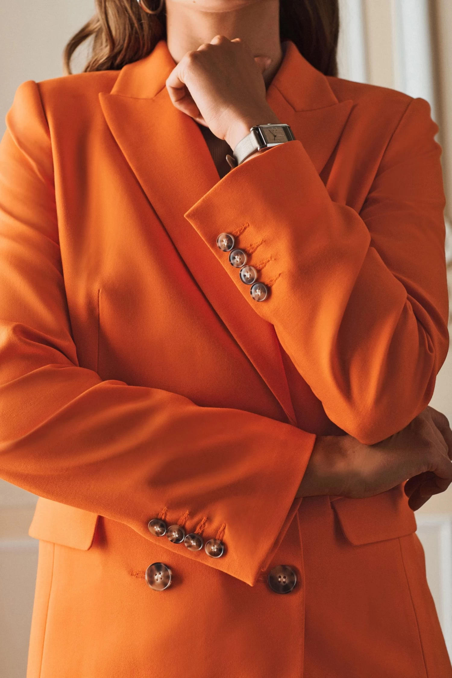 Our orange double breasted textured blazer is a tailored piece that will take you way beyond the office and into your everyday wardrobe staples. Made from a stunning textured fabric with sharp lapels, front flap pockets and mock horn button detail to cuffs for a modern yet refined finish. Our cleverly designed seams ensure the perfect fit. Complete the look with matching tailored trousers or style with a breton tee and relaxed denim for a fresh weekend feel.