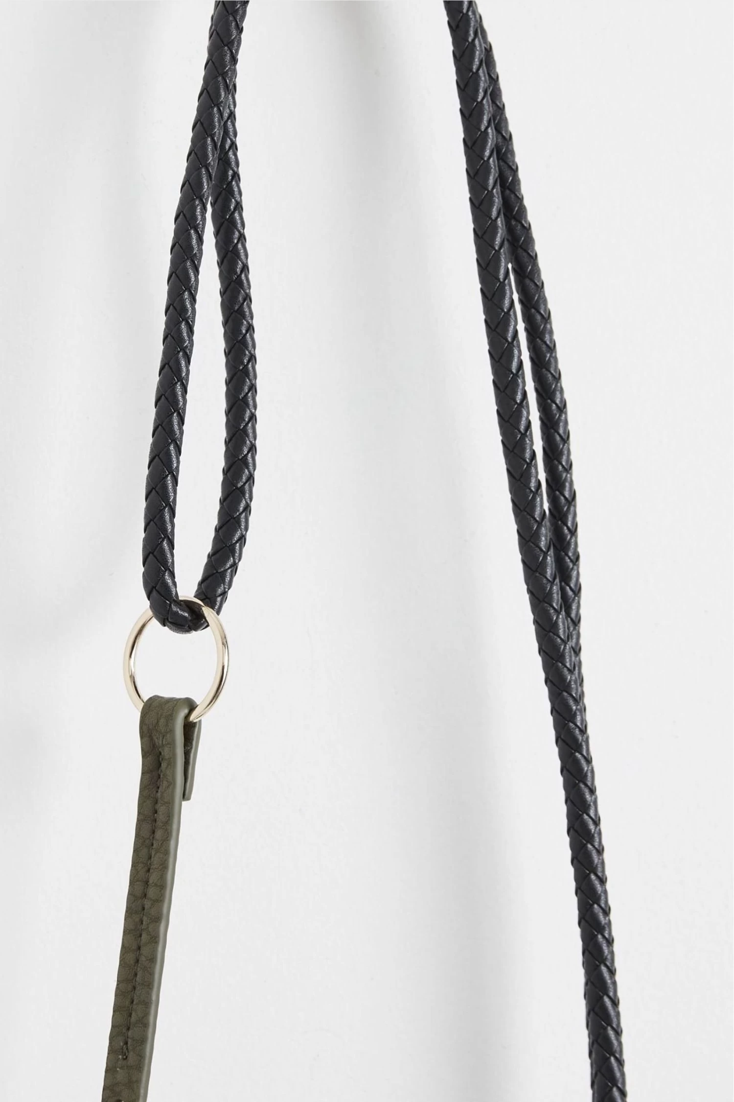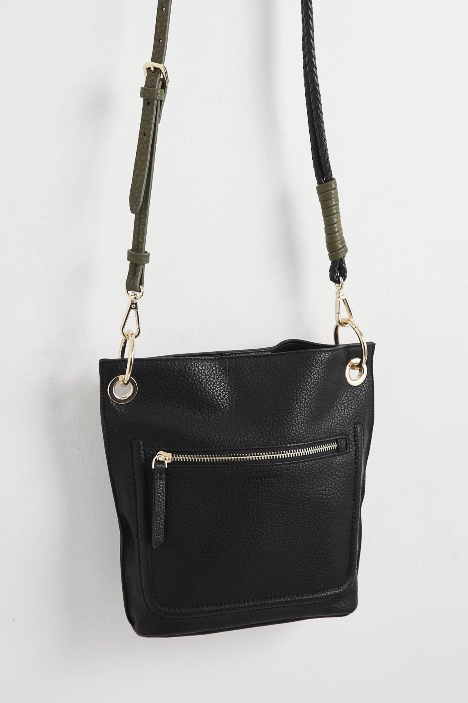 In an elongated profile, this black bag features a main compartment for your larger necessities and an outer slip pocket to keep your smaller essentials handy. Featuring a detachable crossbody strap in a plaited design, it has a green section with an adjustable buckle and is complete with golden hardware.