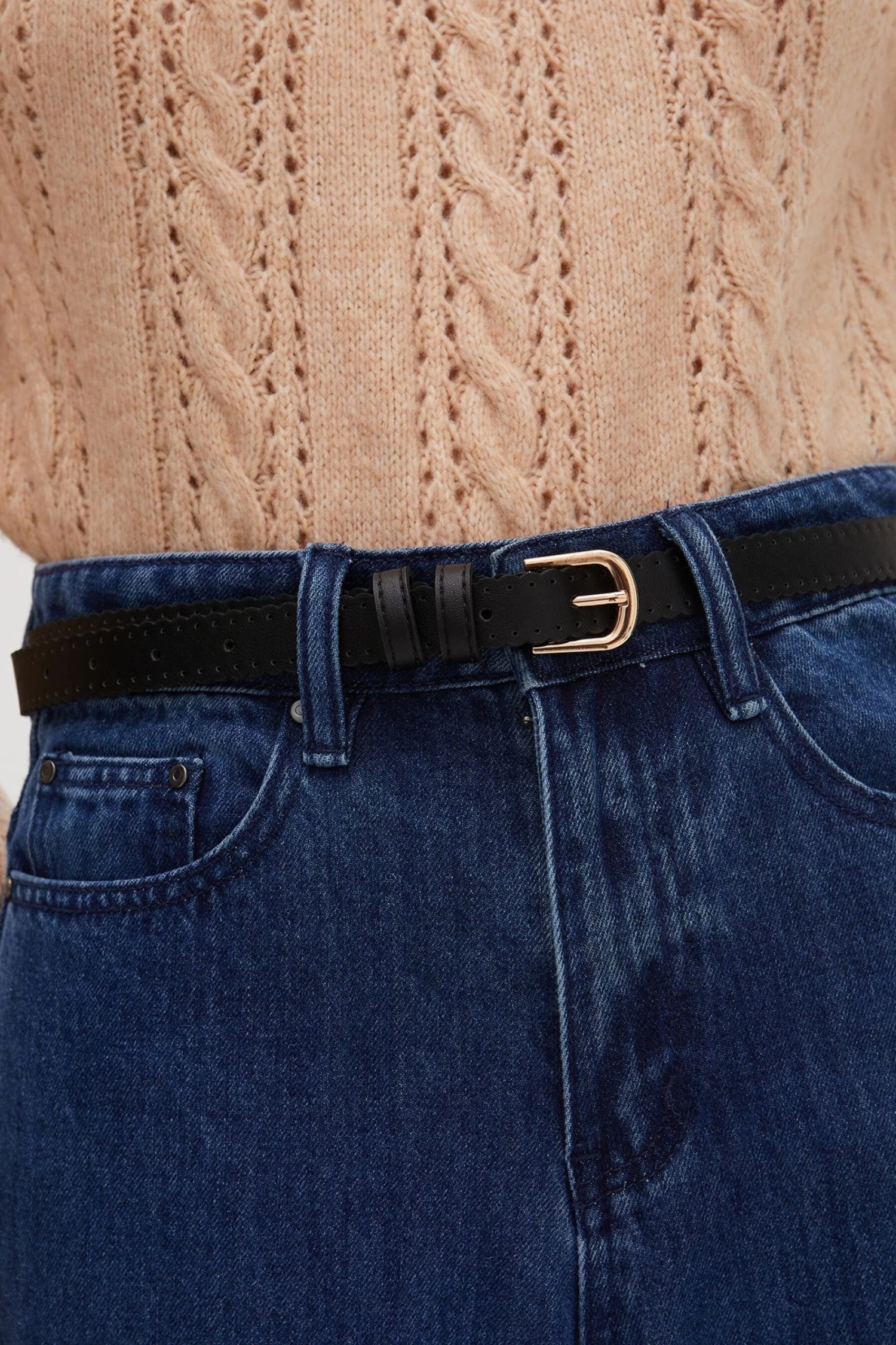 With scalloped edging, this black belt features cut out detailing and is complete with a sleek oval metal buckle.