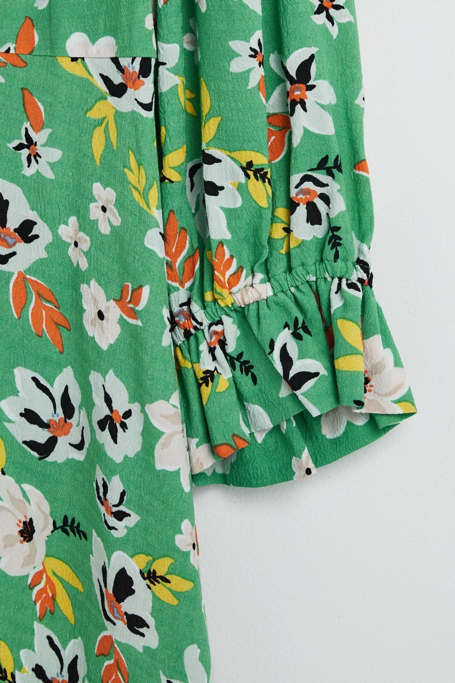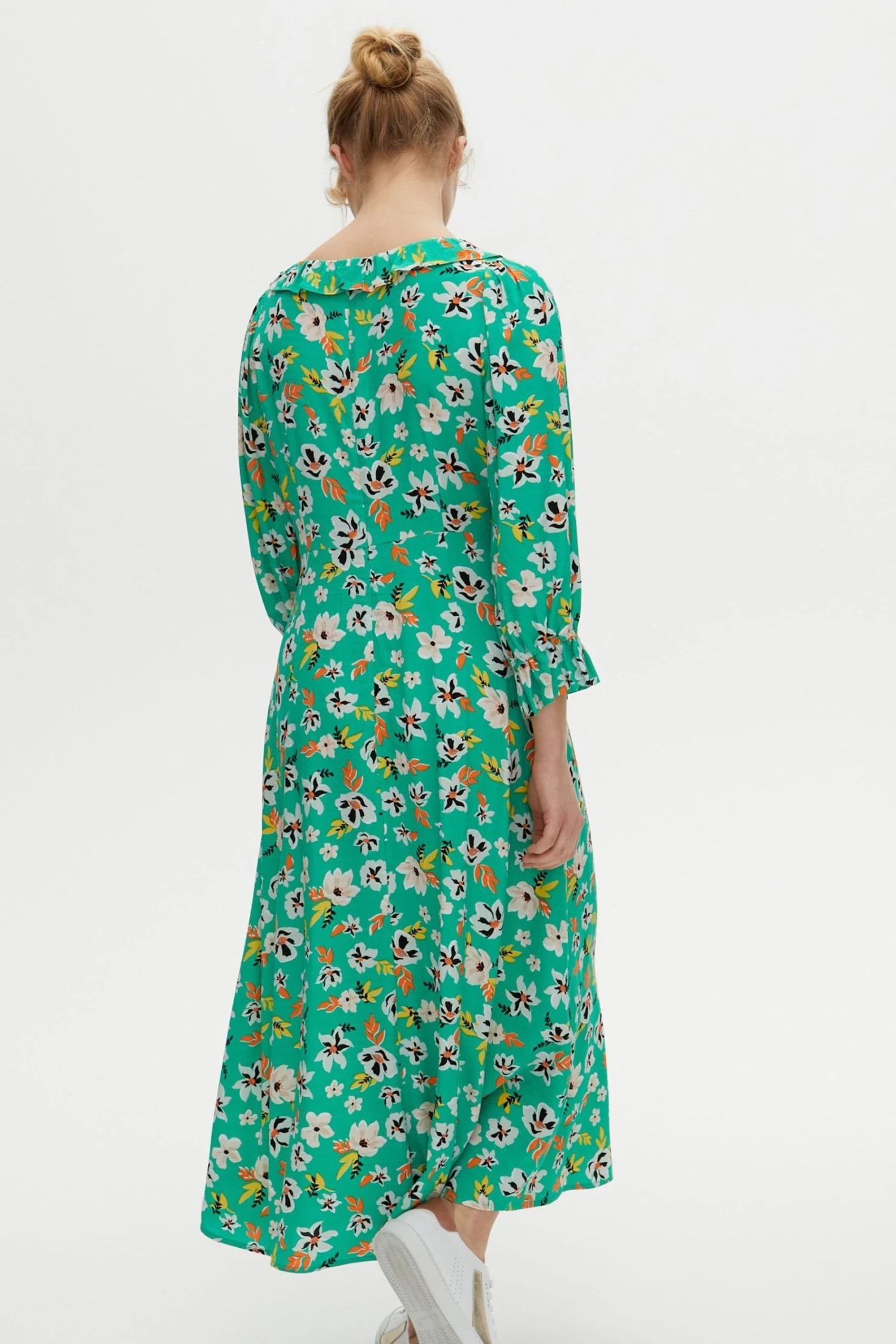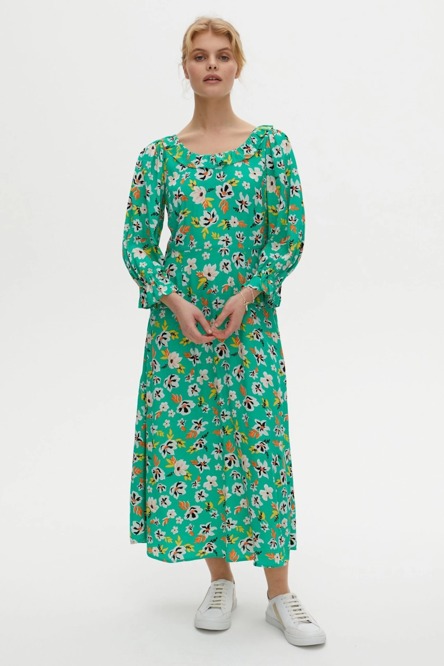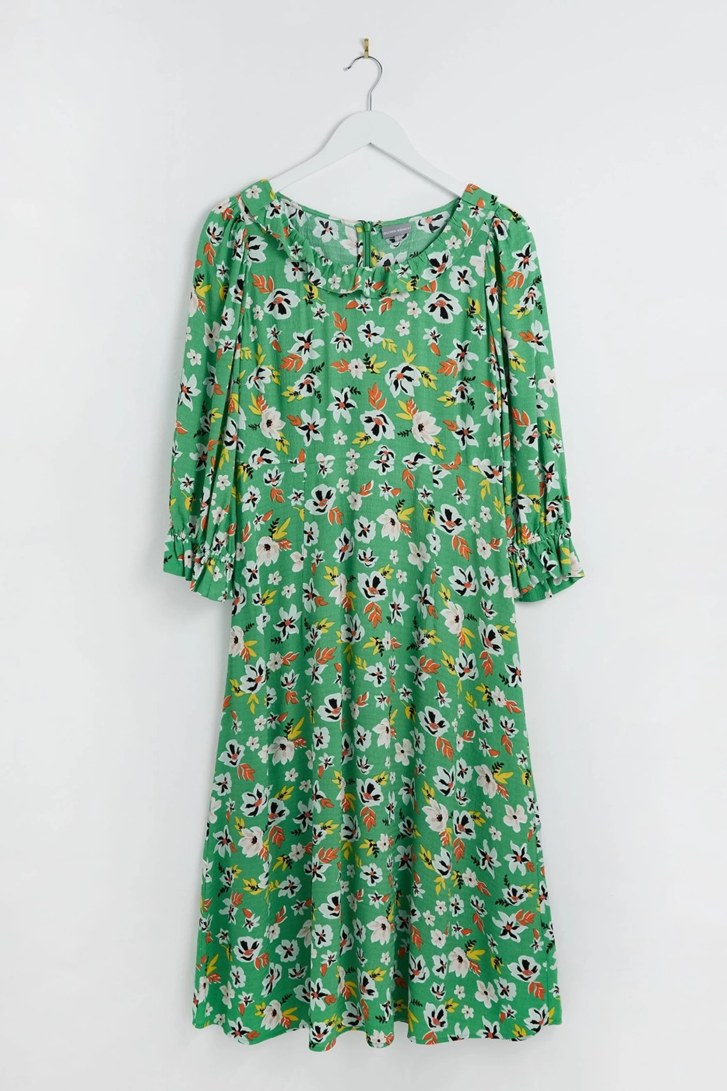 In a spring dream of floral decoration, this green midi dress is printed with white, orange, yellow flowers. A soft round neckline is lined with a simple frill trim, with elasticated cuffs featuring a pleat accent. In an A-line silhouette, this dress is made for your next day trip adventure.