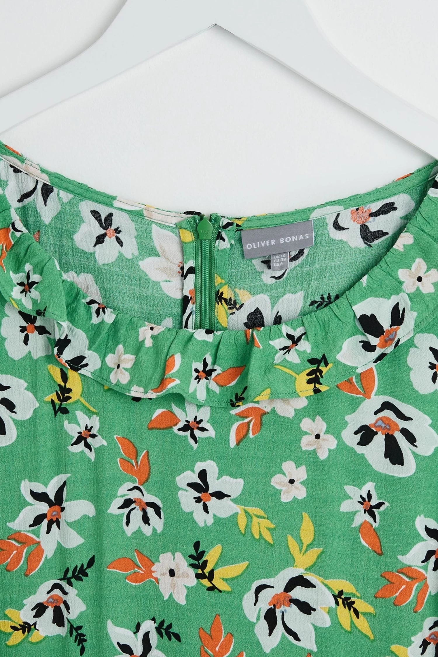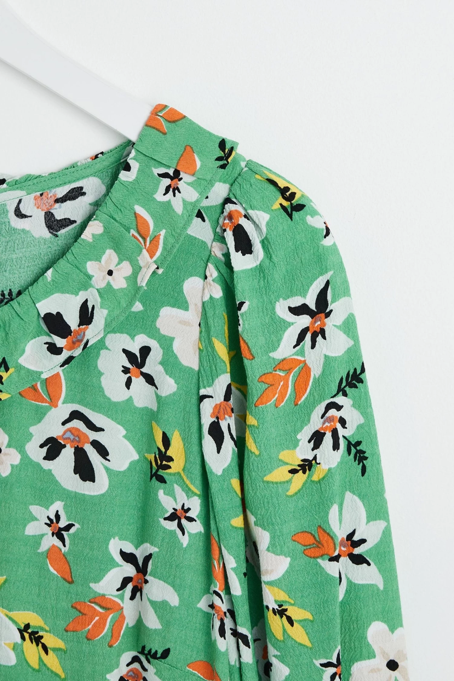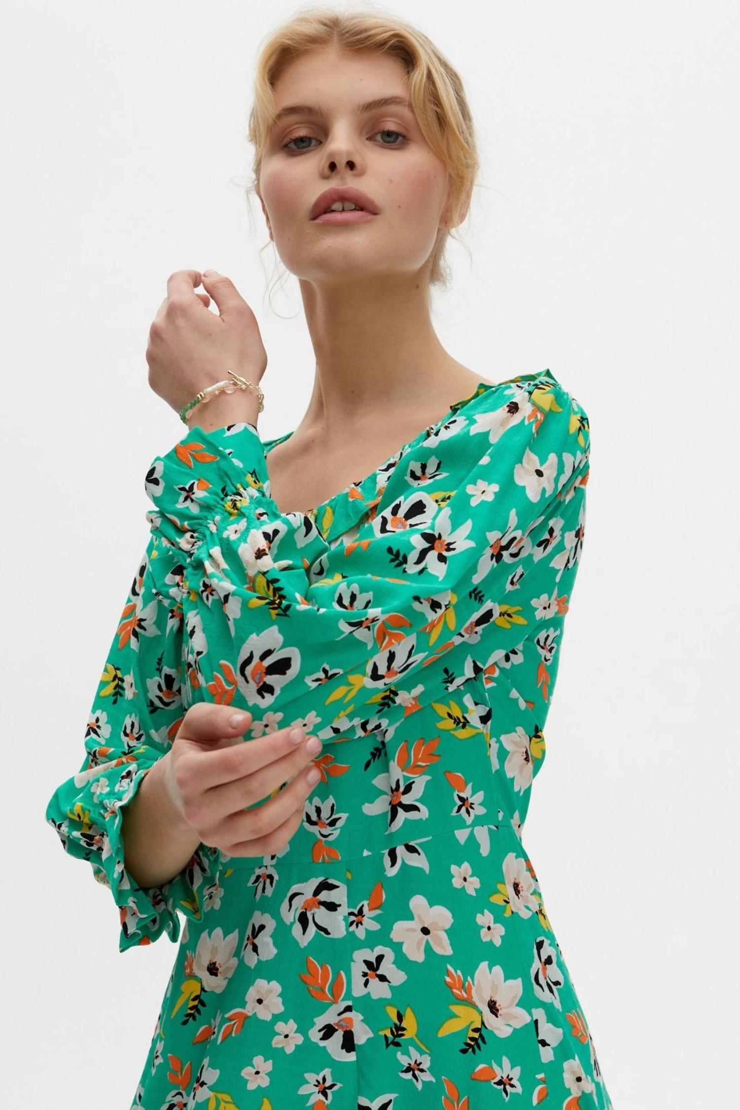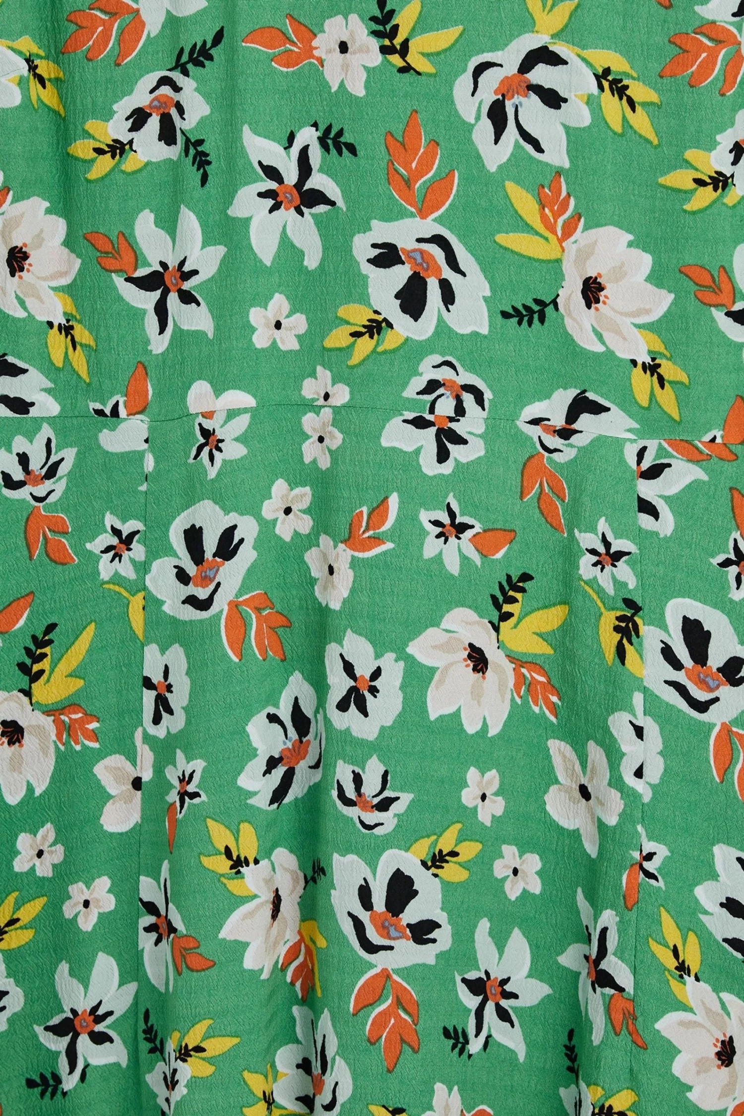 In a spring dream of floral decoration, this green midi dress is printed with white, orange, yellow flowers. A soft round neckline is lined with a simple frill trim, with elasticated cuffs featuring a pleat accent. In an A-line silhouette, this dress is made for your next day trip adventure.