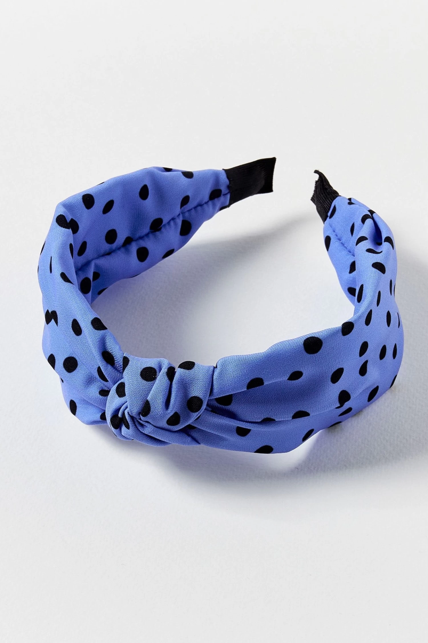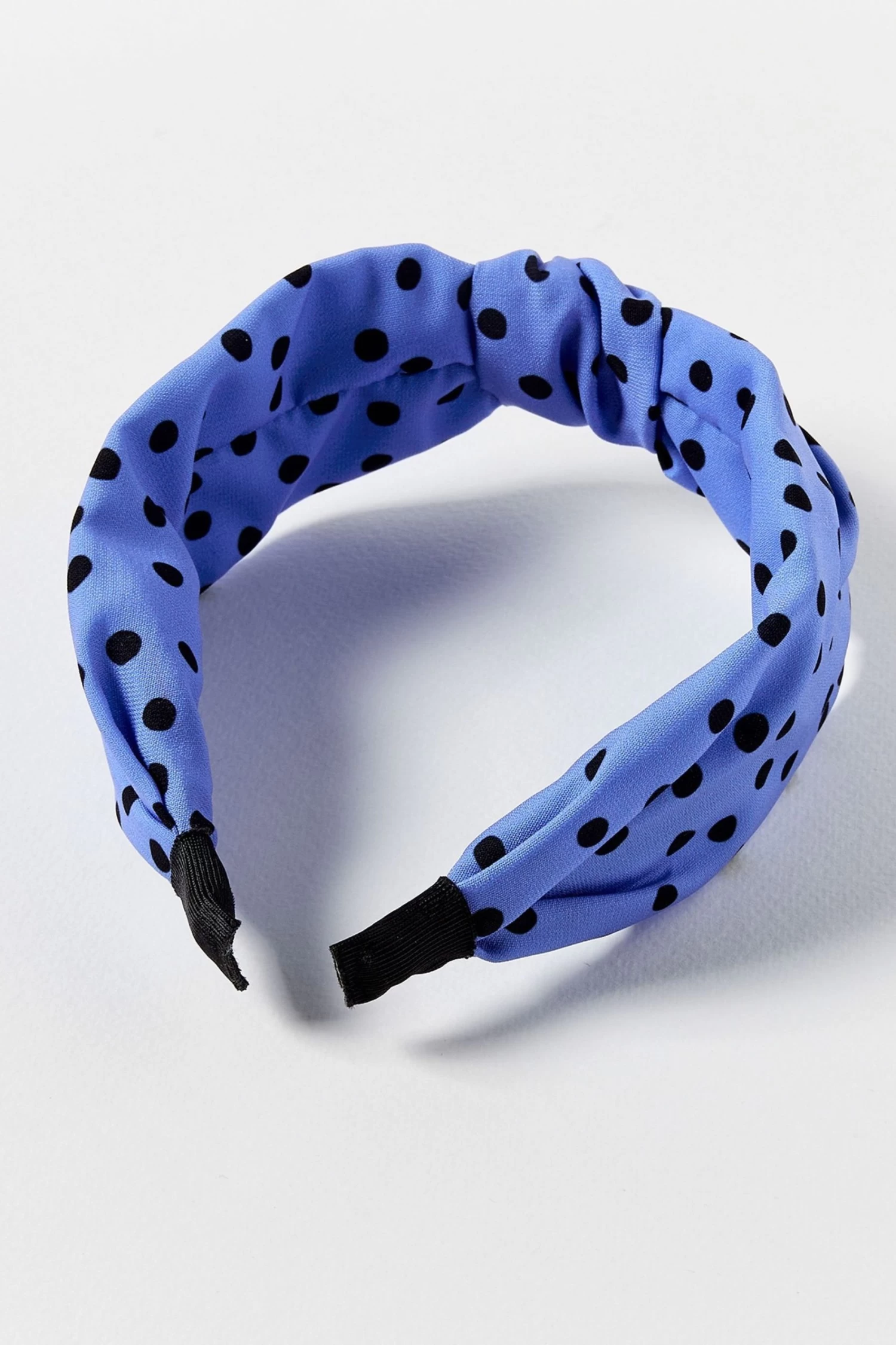 In a knotted profile, this purple headband has a polka dot pattern to bring some sixties edge to your look.