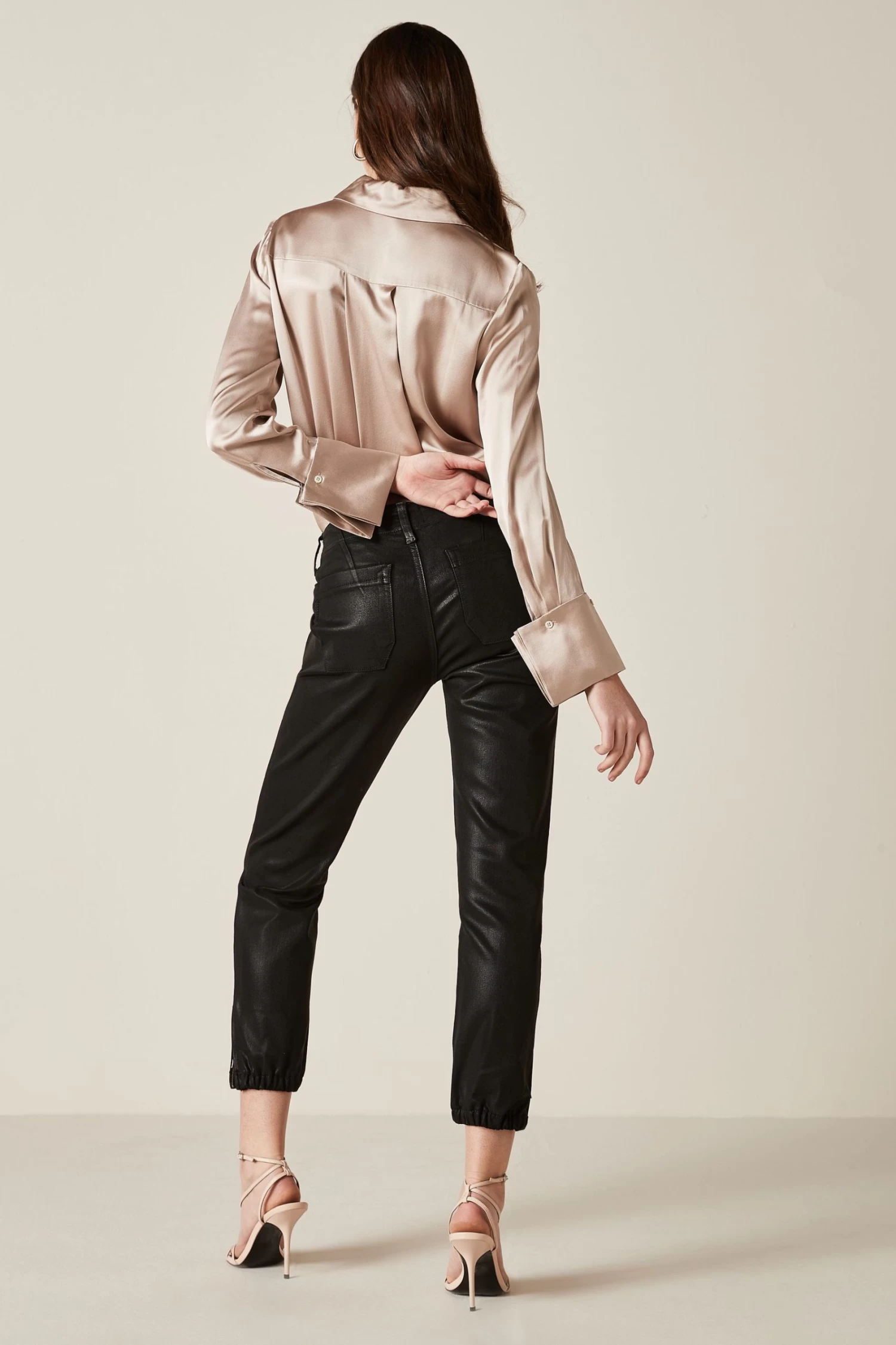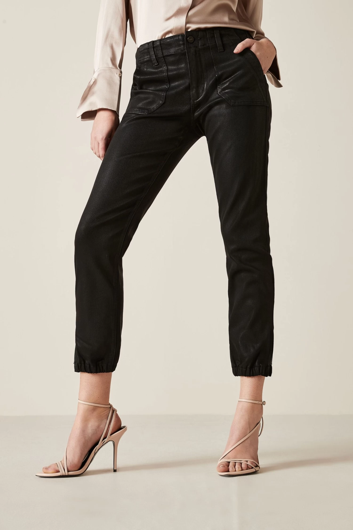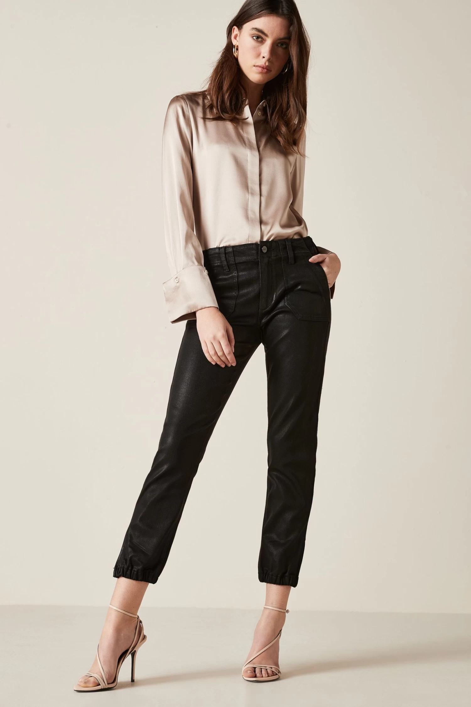 Take a break from your everyday denim with the Mayslie Jogger. Mayslie is your go-to weekend pant because it is super comfortable but still looks polished and put together. This chic style was inspired by the utility trend on the runway and PAIGE put a feminine twist on it with a streamlined silhouette and zipper details. Rise: 9 5/8”. Inseam: 26 1/2”. Leg Opening: 10 1/2″. Zipper Details. Paige Branding. The model is wearing a size 25. Measurements of model: Height 178 cm / 5’8″, Waist 61 cm / 24″, Hips 90 cm / 35.4″.
