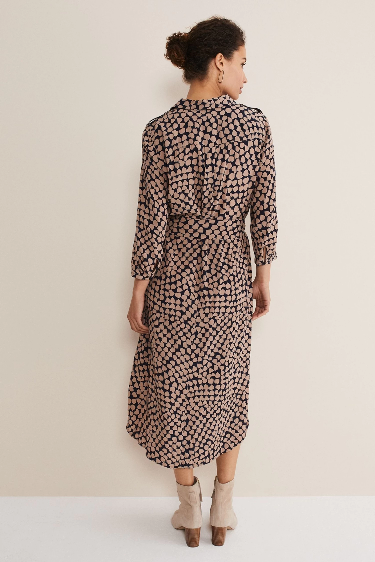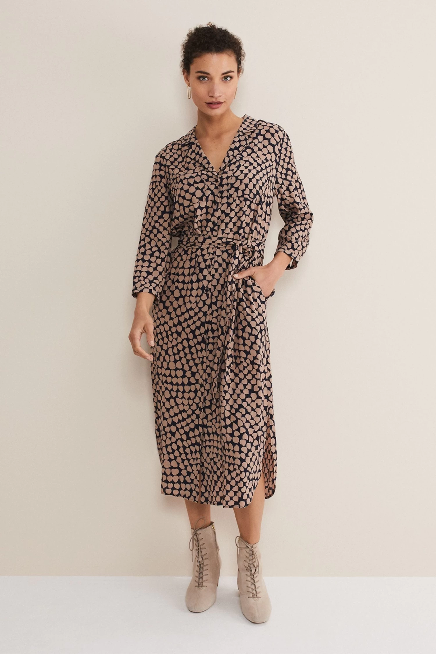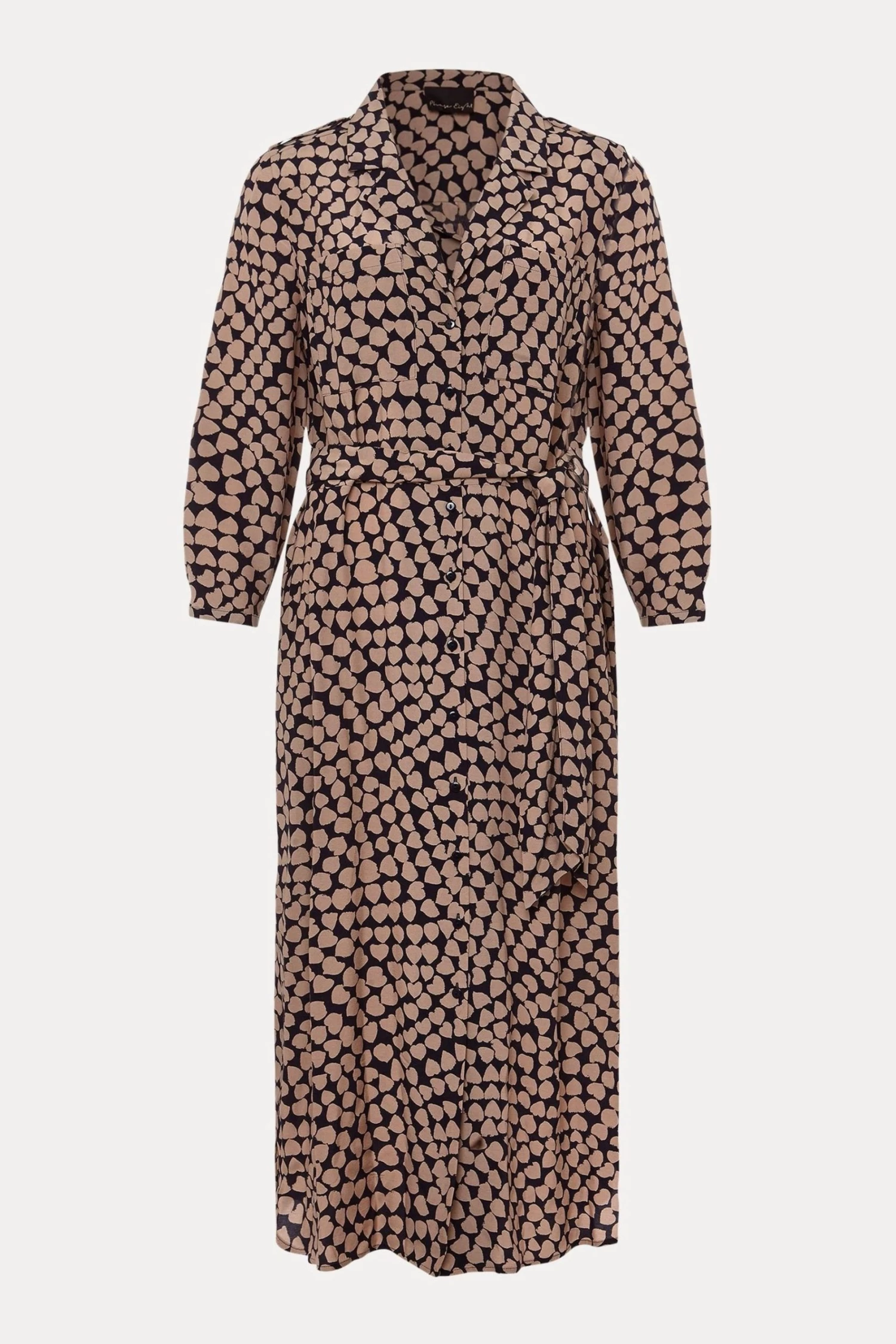 Our stunning heart print in a new dress style. Our Kesia dress is designed with contrast coloured love hearts to a flattering shirt dress silhouette with a self-tie waist belt. We wear ours with boots for the perfect desk-to-dinner look.