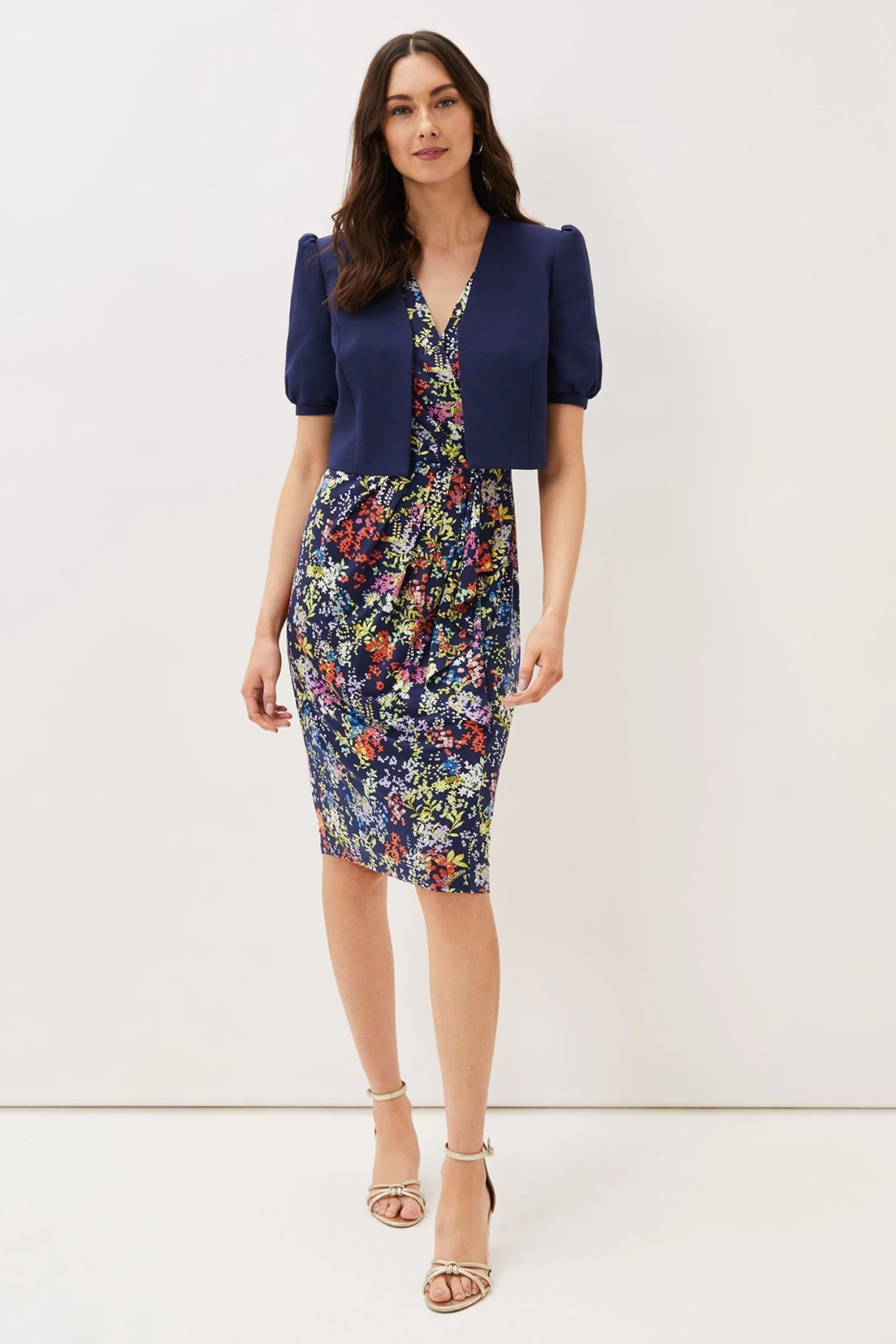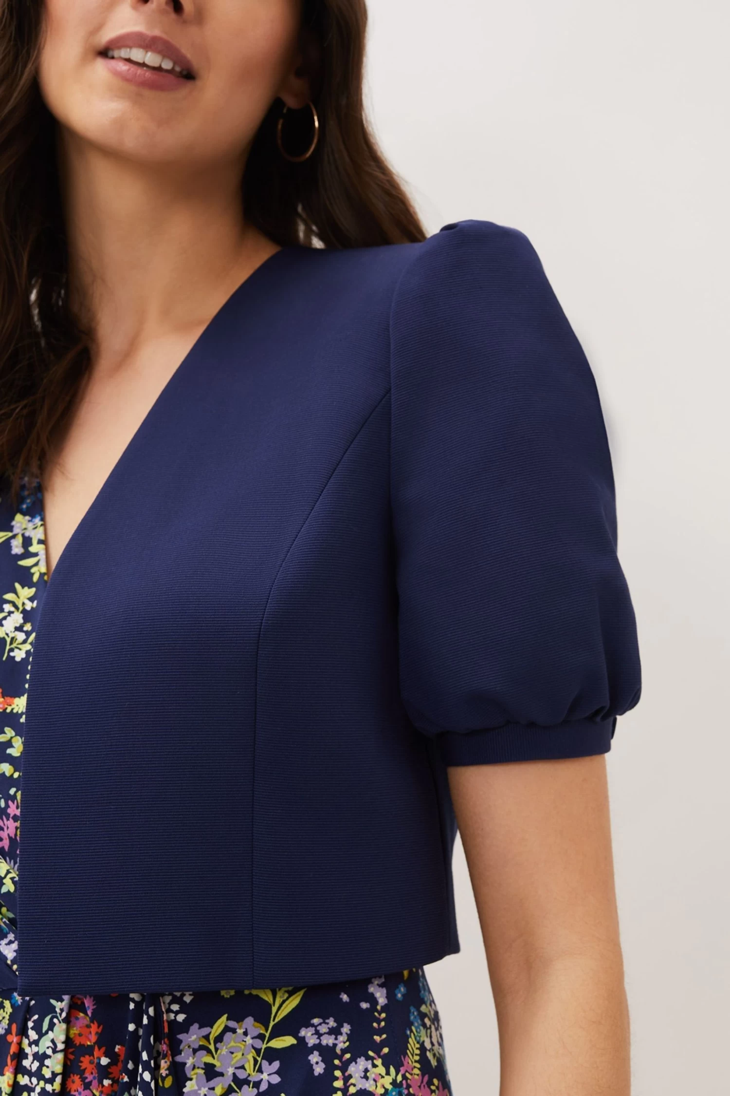 Add the finishing touch to your occasion look with our navy fitted Mabel jacket. Designed with shoulder pads for sophisticated shape, short feminine puffed sleeves, and an edge-to-edge finish for sleek silhouette. This is perfect to pair any of our occasion dresses or jumpsuits for perfect head-to-toe styling.