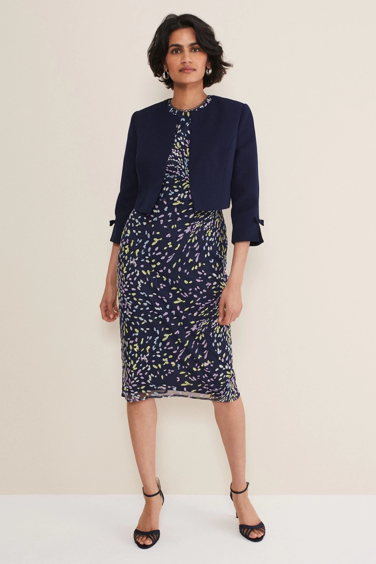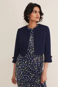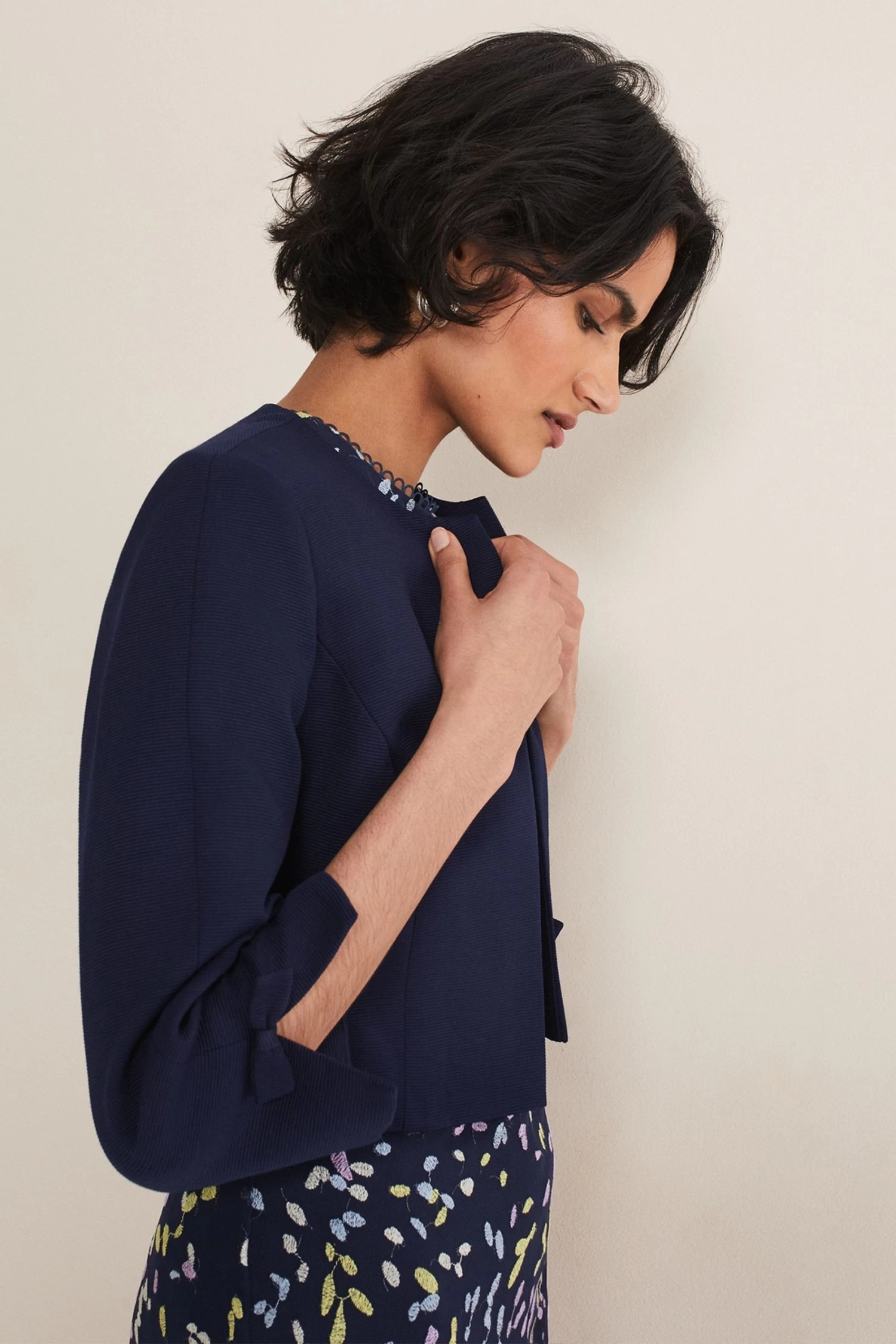 Add the finishing touch to your occasion outfit. Our navy Zoelle jacket is designed with an open front and features bow detail on the sleeves for a feminine finish. Style with heels and a matching clutch bag to bring your final look together. This style is responsibly sourced. This style has been made from recycled polyester, giving materials that would have ended up in landfill a new lease of life.