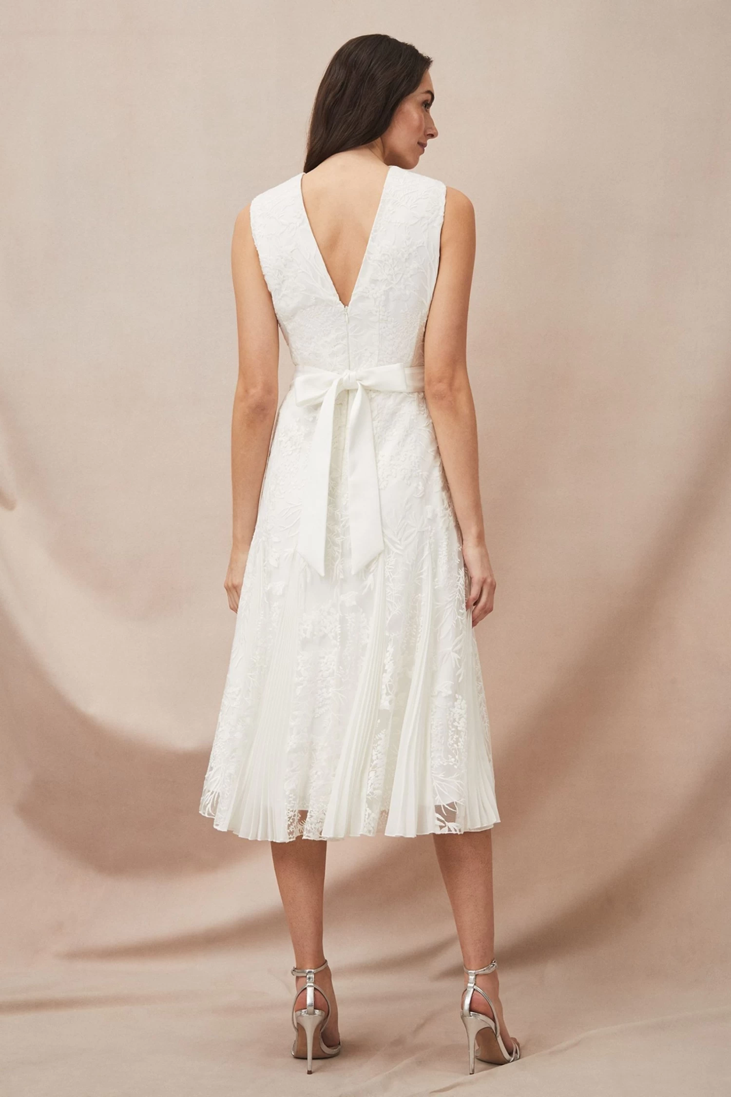 Imagined in intricate lace, our Caterina wedding dress is a feminine style for the modern bride. Cut to a midi-length, this contemporary dress stays true to classic romance with its trailing botanical embroidery and gently flared skirt, presenting pleated chiffon inserts that bring a sense of vintage opulence. A faux-wrap bodice that finishes in a V-neck front and back and a detachable satin-tie belt completes this breath-taking bridal dress.