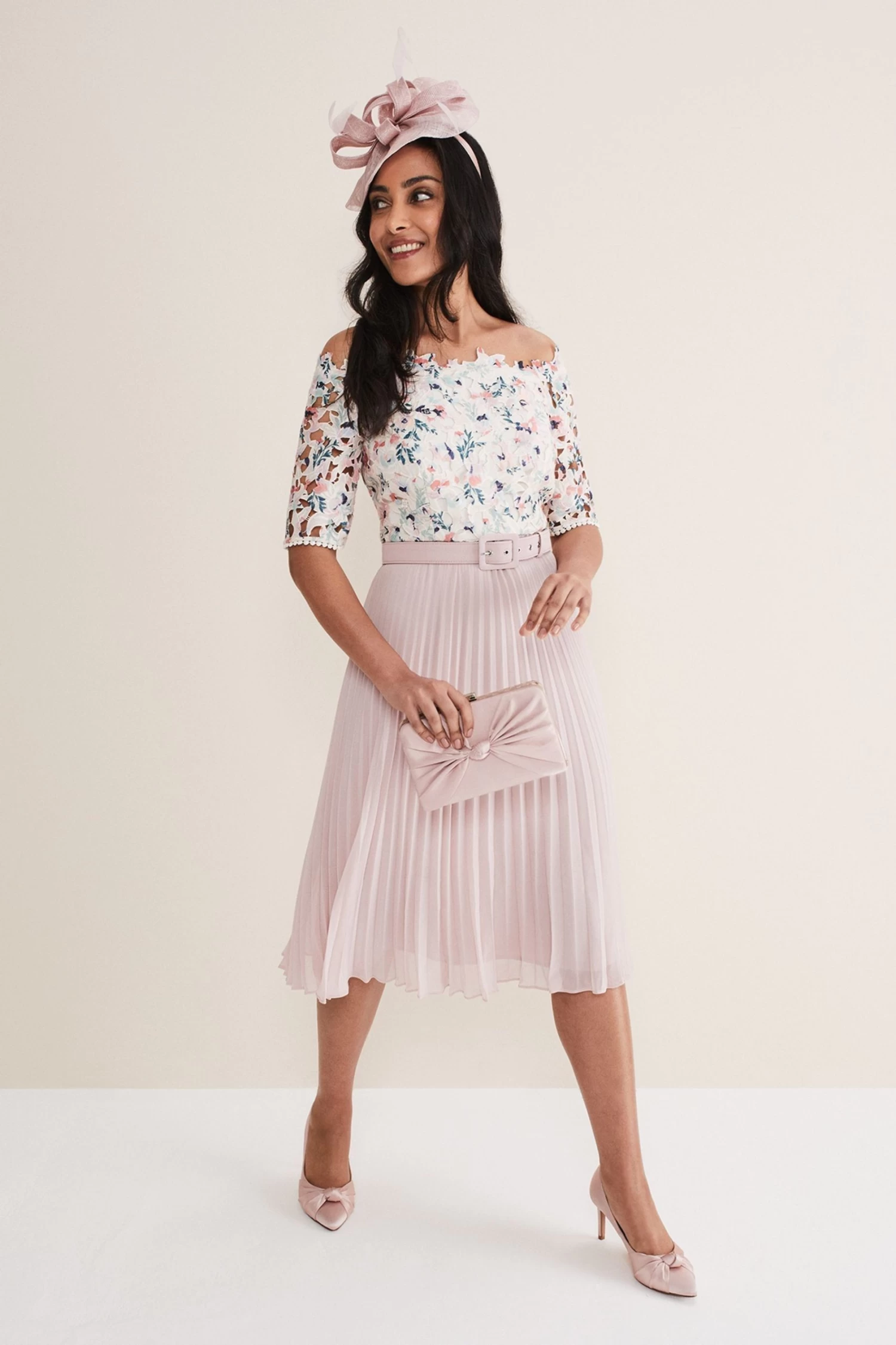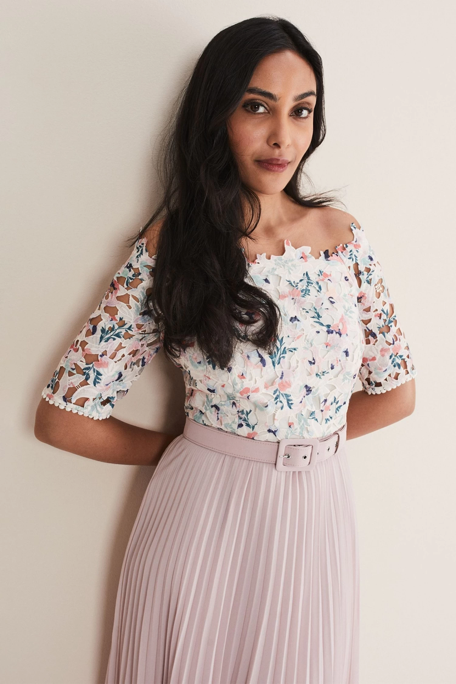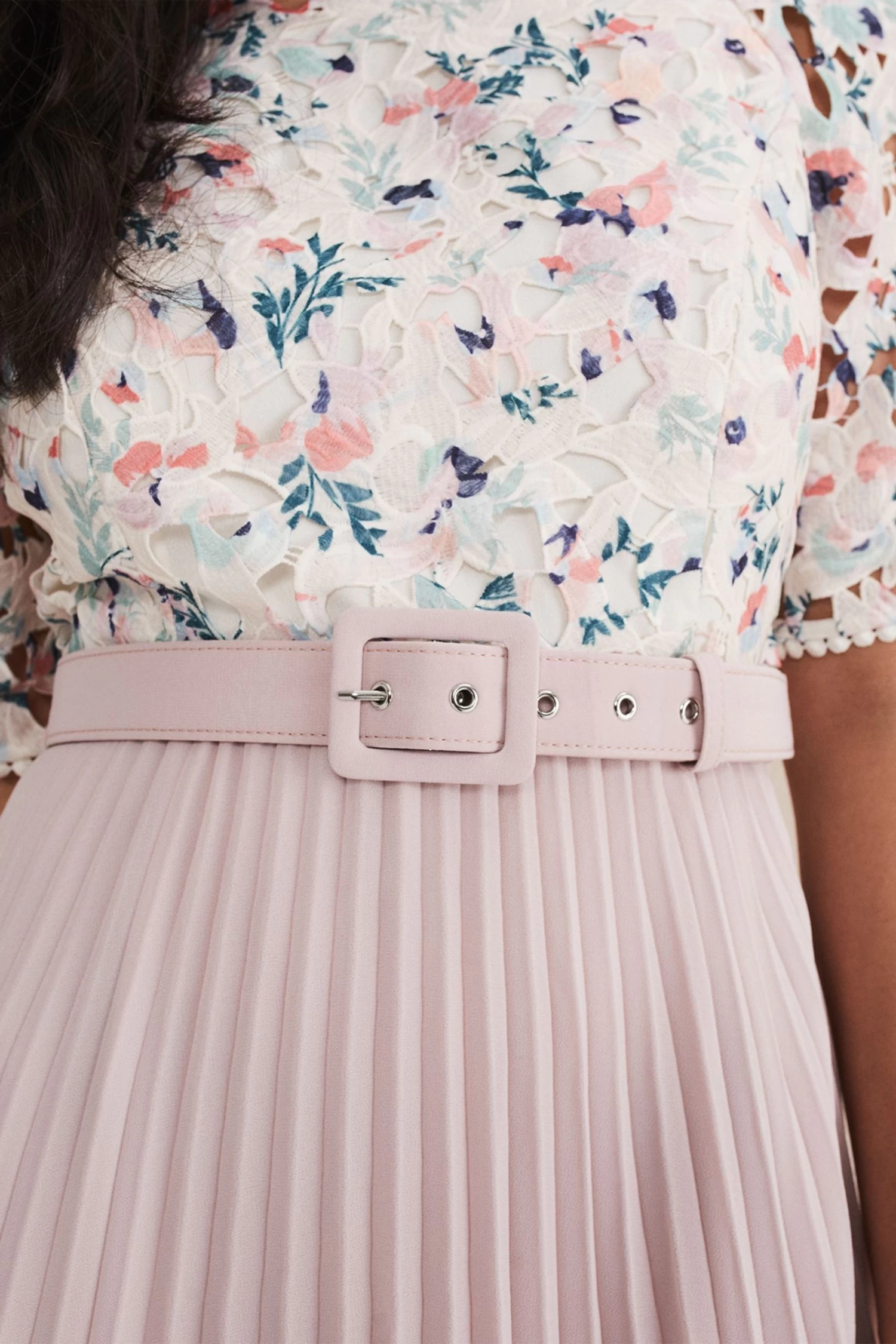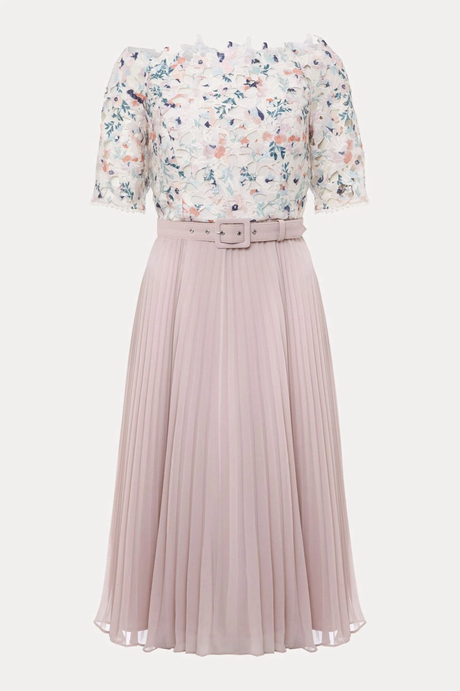 From our Petite Collection. The perfect dress for your next occasion. Our romantic dress is designed with a soft floral print and features intricate lace detail. Style with a light blue clutch and matching heels to bring this look together.