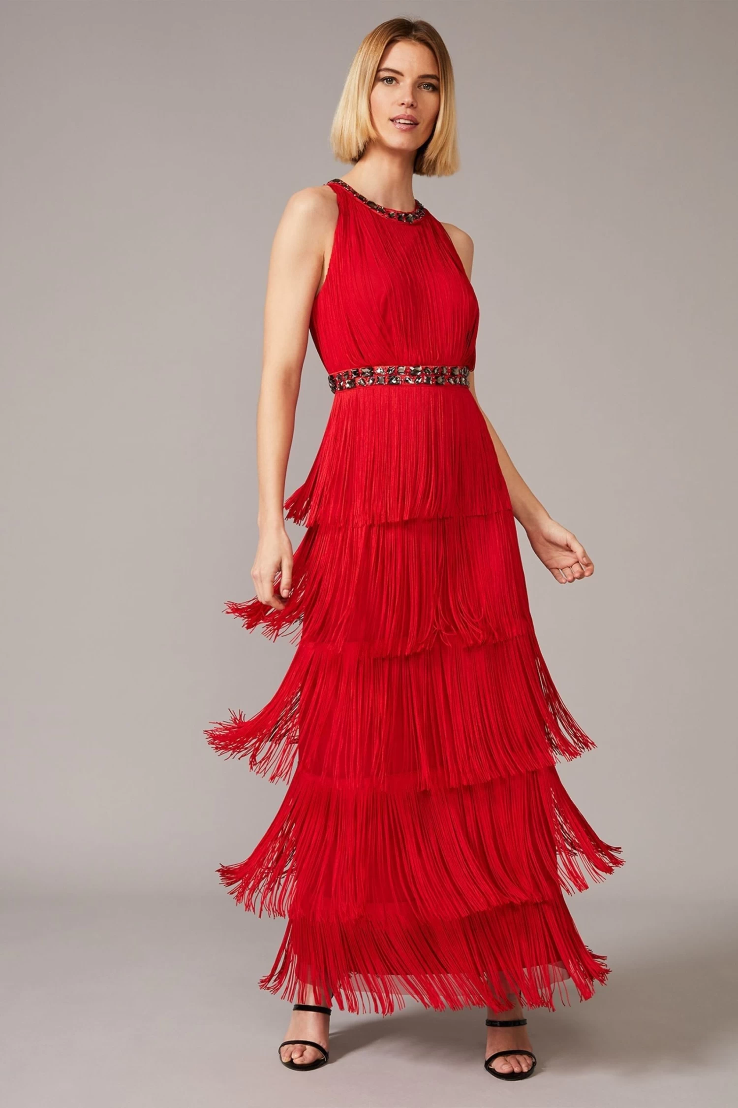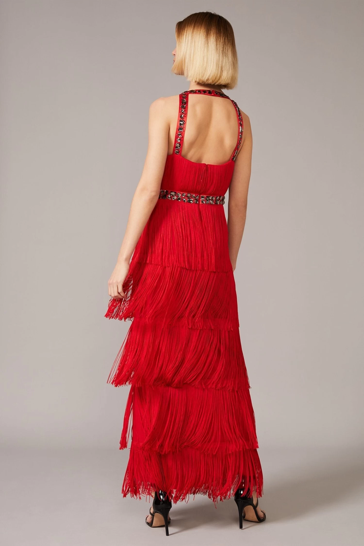 From Collection 8, Phase Eight’s stunning range of premium evening dresses. A dress made for dancing; the Albertina style is designed in a column silhouette with tiered fringing that moves with you. Accented with a black beaded satin neckline, waistband and straps, this style is finished with a dramatic open back. Wear to all your upcoming parties and special events.