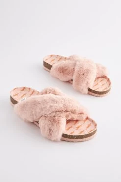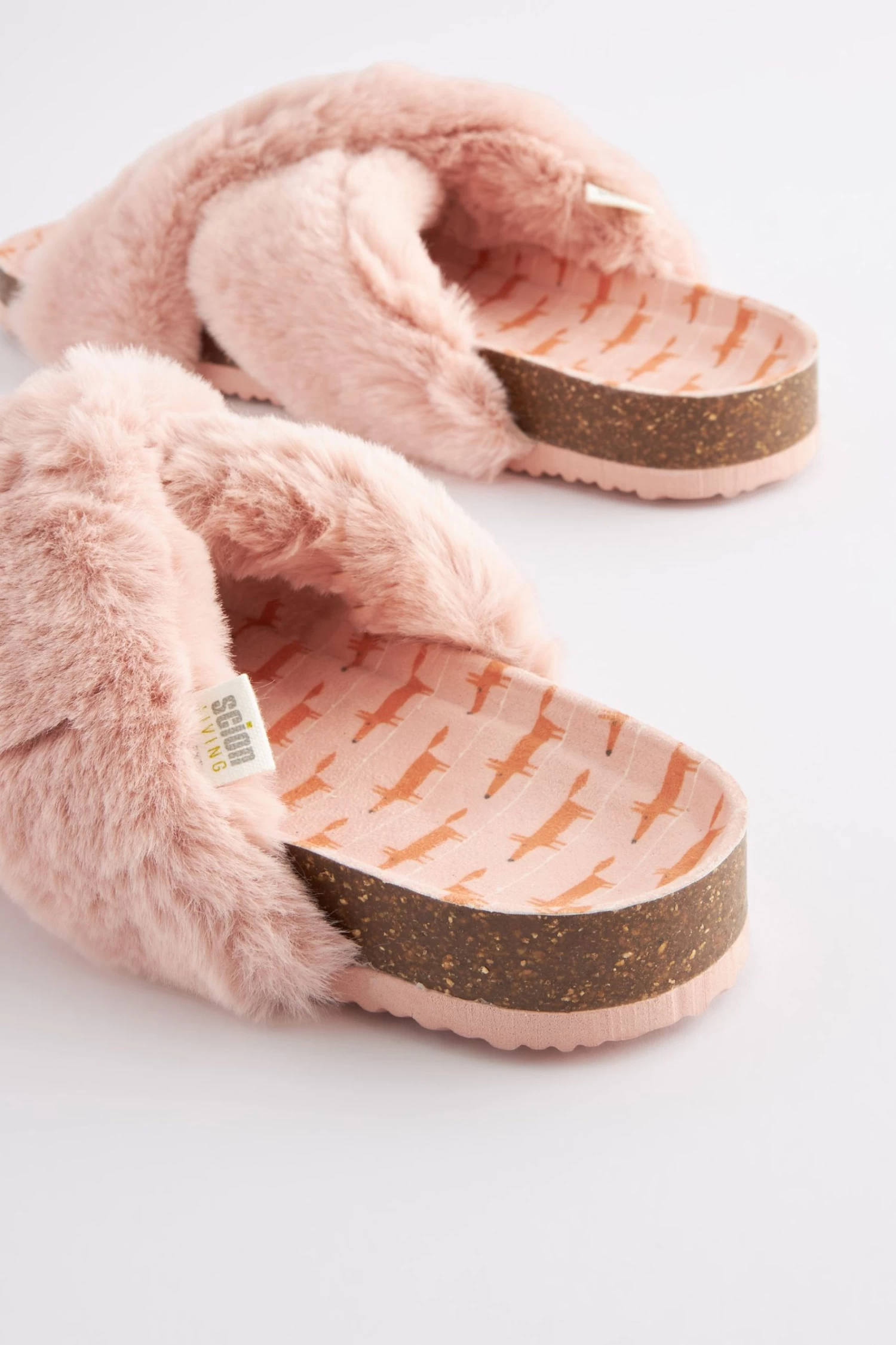 Slip-on style. Textile upper. Faux fur cross straps. Mr fox print.