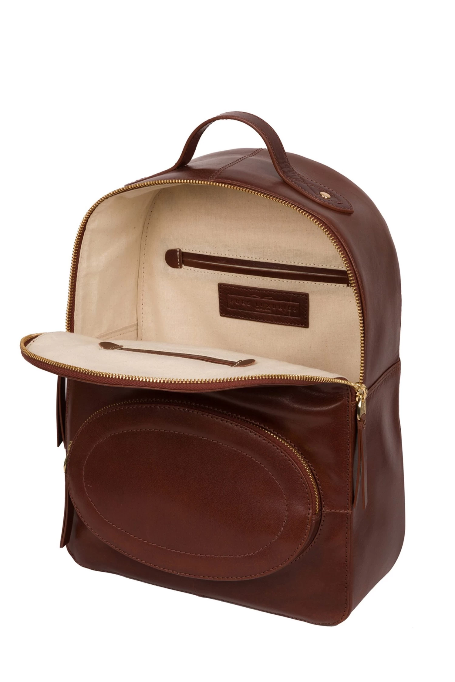 From the Pure Luxuries London Designer Collection, the Christina backpack is handcrafted from luxuriously smooth, vegetable-tanned leather. A zip round top secures the spacious central compartment that is lined with 100% natural and untreated cotton and contains two slip pockets. On-the-go storage is provided by a zipped pocket on the exterior of the bag and comes with adjustable fabric straps and a leather handle. Finished with a simple and elegant Pure Luxuries gold plated metal plaque.