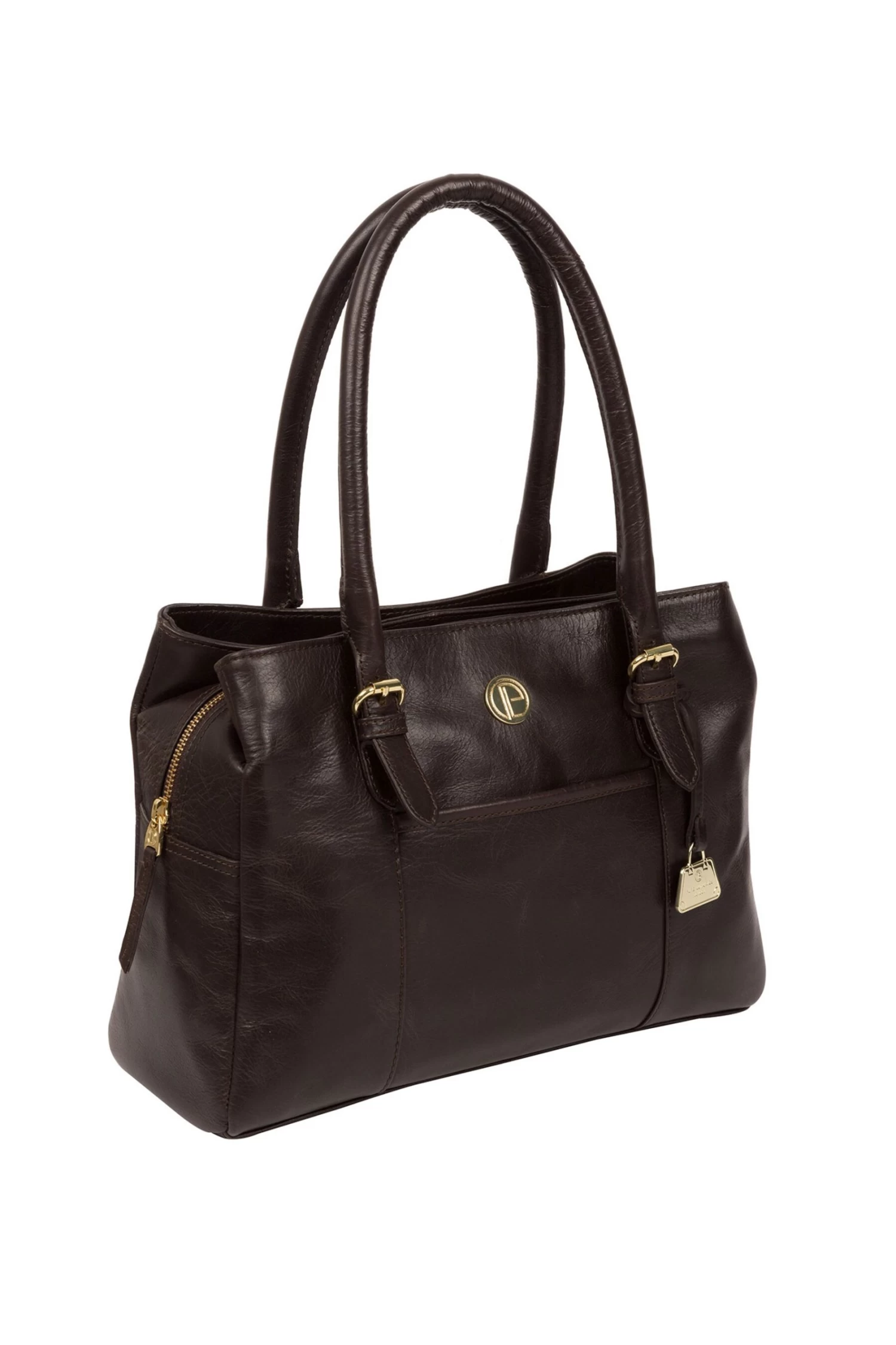 Part of the Pure Luxuries ‘Bloomsbury Collection’ featuring classic designs handcrafted from high quality, natural leather and finished with luxurious gold fittings, the Fleur handbag is a stylish and practical way to stay organised on-the-go. A zipover top secures a natural and untreated 100% cotton lined central compartment, between two full-length pockets secured with magnetic stud closures. Offering ample storage space, additional pockets are provided on the exterior with two slip pockets on the front and reverse. With adjustable matching leather handles for comfortable wear and adorned with the Pure Luxuries ‘Bloomsbury Collection’ gold plaque and charm for a touch of stylish sophistication.
