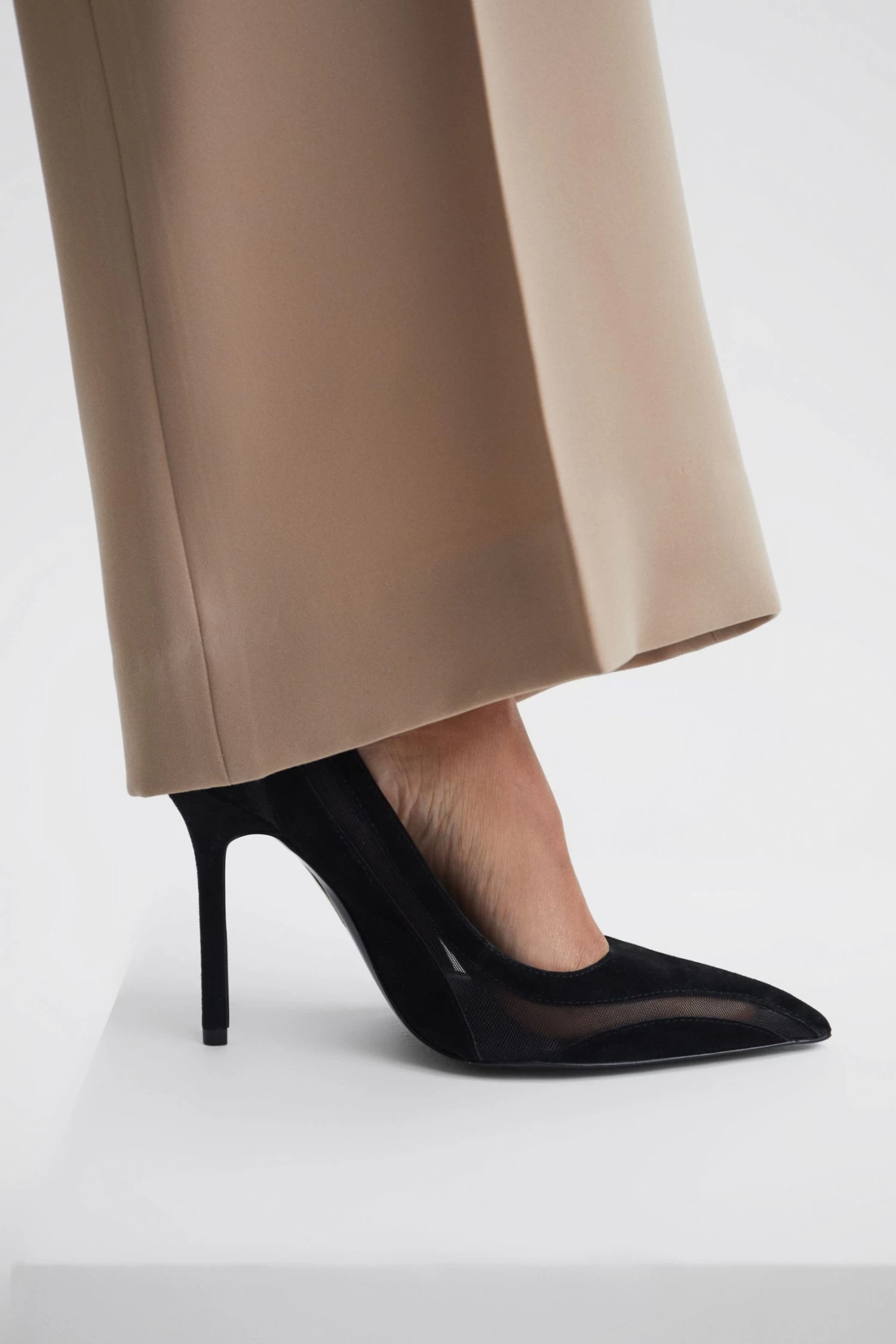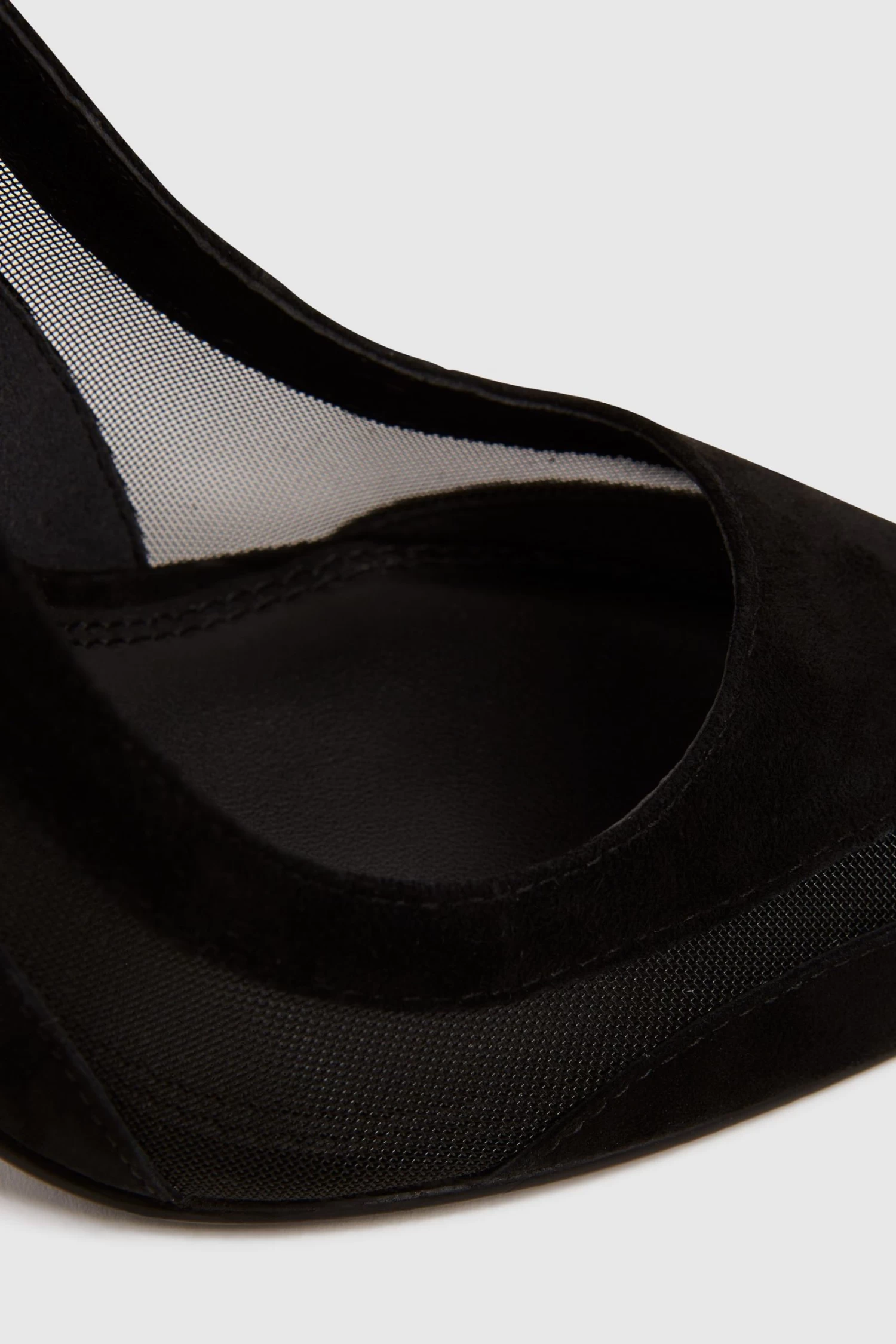 Step into the boardroom in style with the black Dahlia court shoes. They’re crafted from a soft leather upper, and feature sheer panels for an understated look. Pair with workwear for a refined edit. Leather construction. Sheer panel detailing. Point toe. Stiletto heel. The model is wearing a size 6. Measurements of model: Height 5ft 10″ / 178cm.