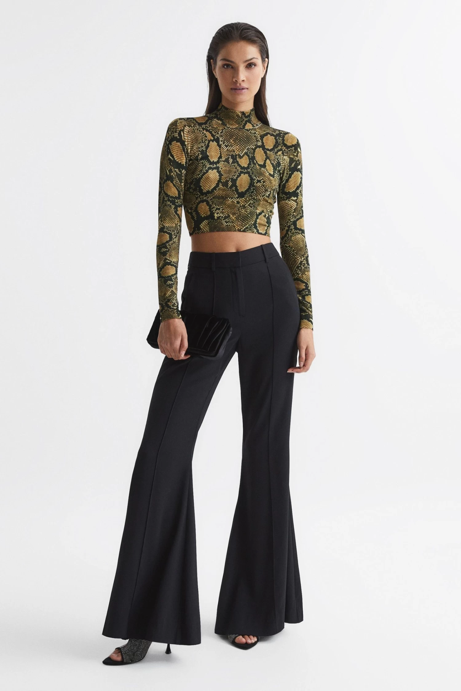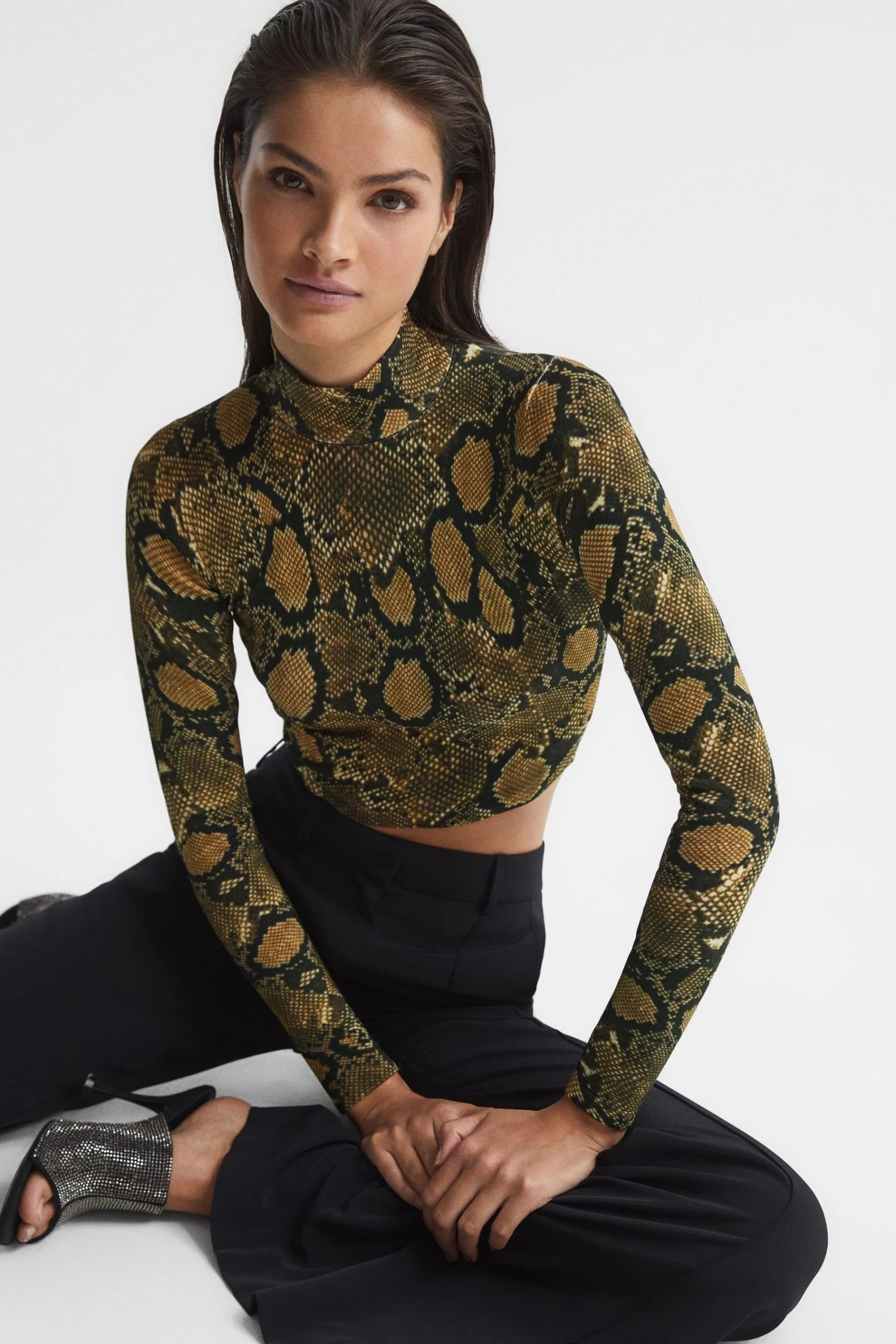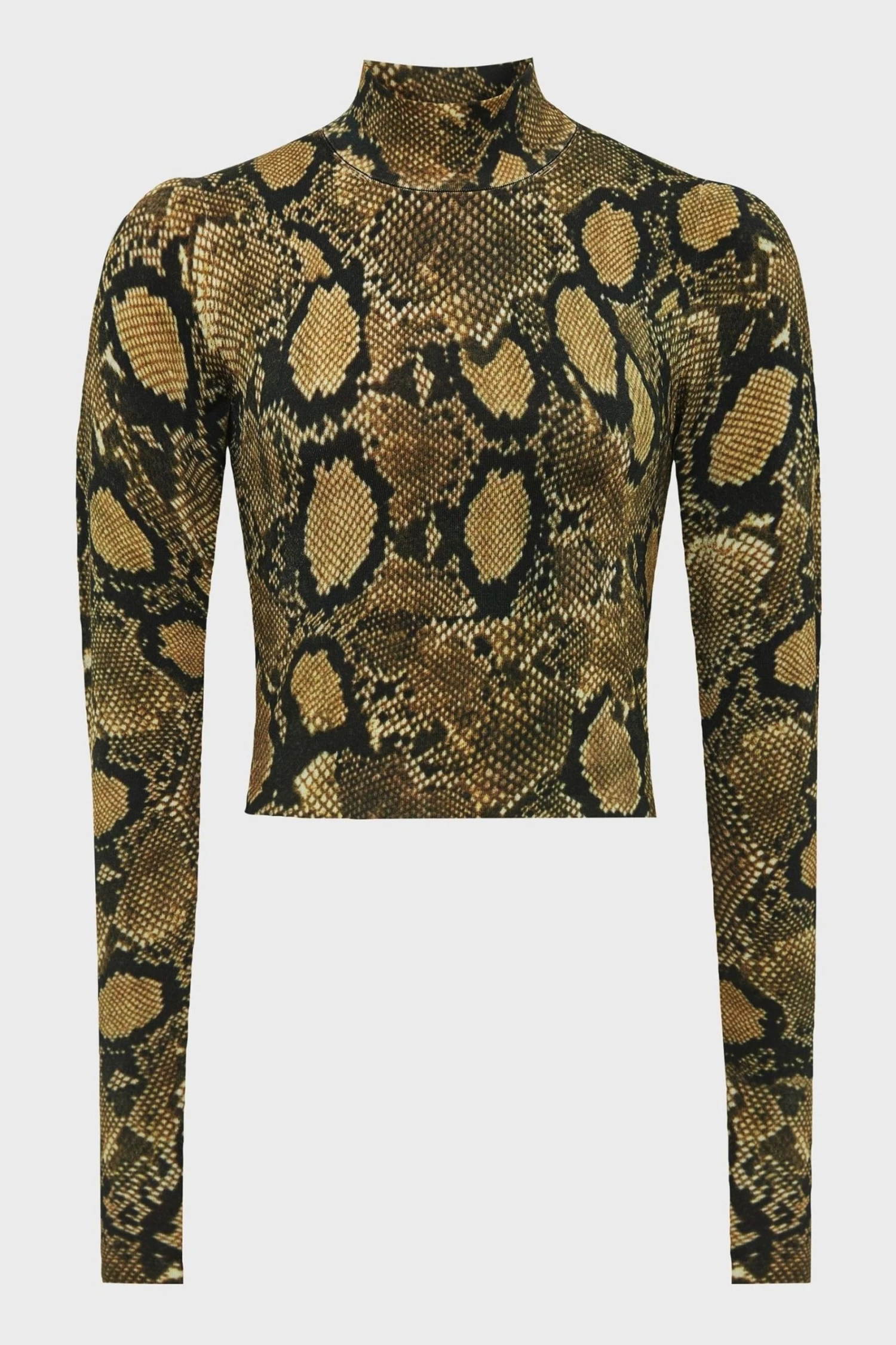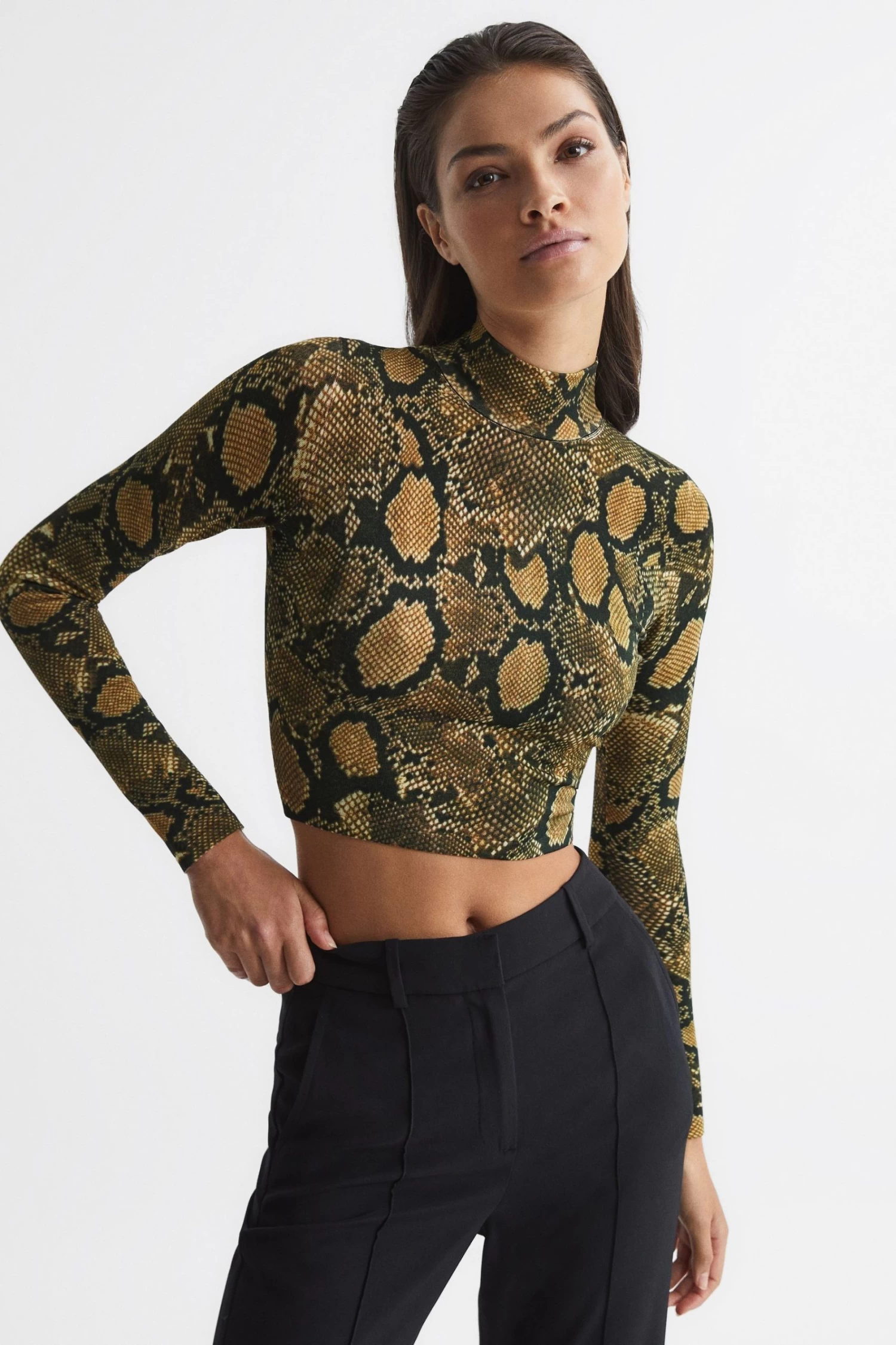 The Farah top is adorned with a snake print, lending a high-octane mood to daily ensembles. It fits close to the frame with a cropped hemline, topped with a high neck. Wear it with trousers and add heels for a desk-to-drinks edit. High neckline. Long sleeves. Snake print. Cropped. Fitted. The model is wearing a size 8 Measurements of model: 5ft 11.5″/ 181cm.