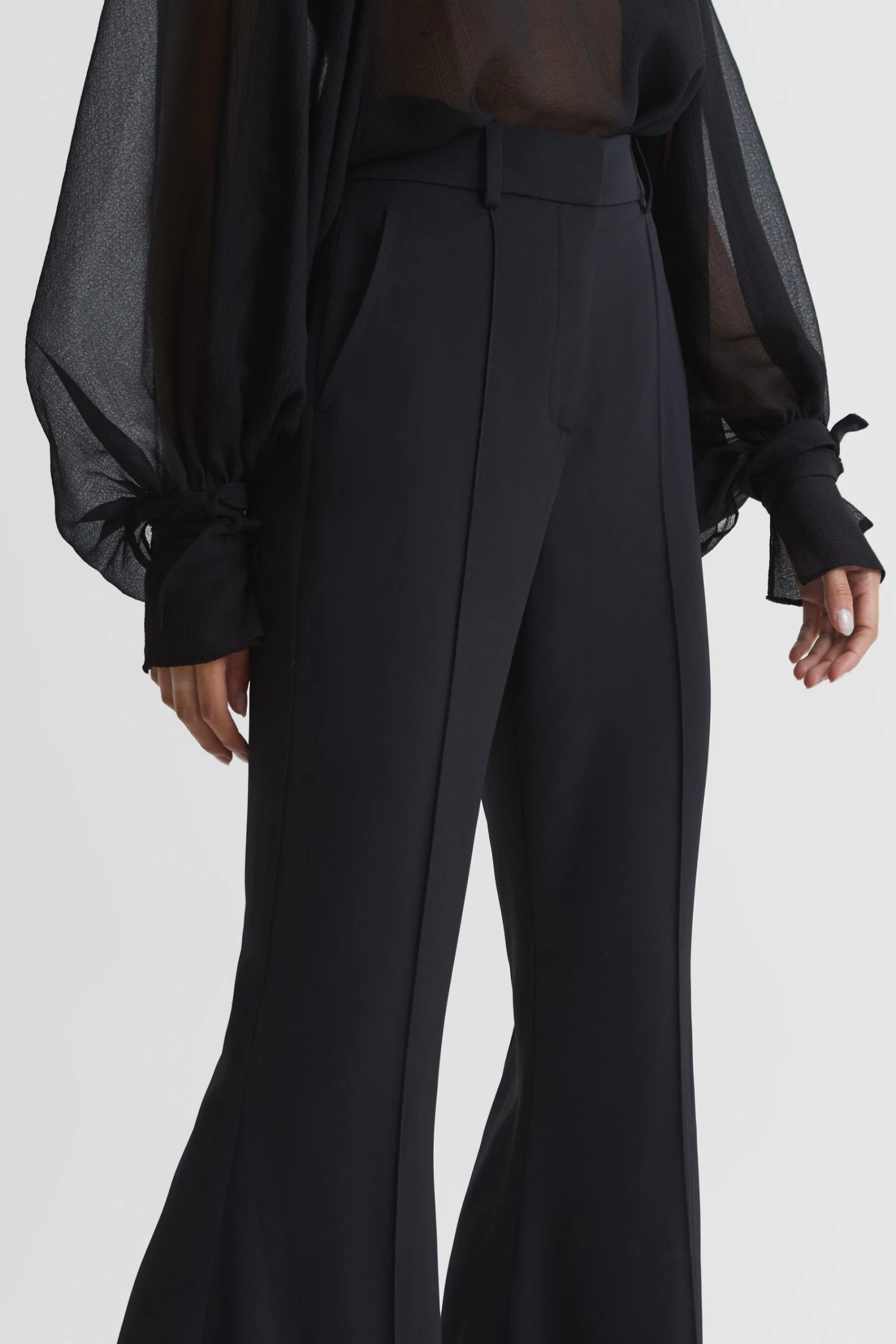 The Gabi trousers in black are a contemporary take on the classic style, with a dramatic flared shape for added impact. Cut from a satin-back crepe, they’re a flowing design that moves with more fluidity than the standard, structured flare. Style with a top from our new collection and add heels for a stand-out look. High-waisted. Belt loops. Zip fly and hook closure. Side slip pockets. Pressed creases. Dramatic flare. Satin-back crepe fabrication.