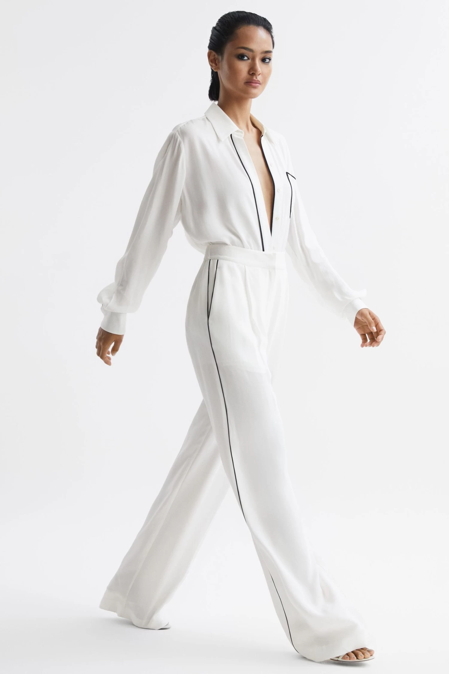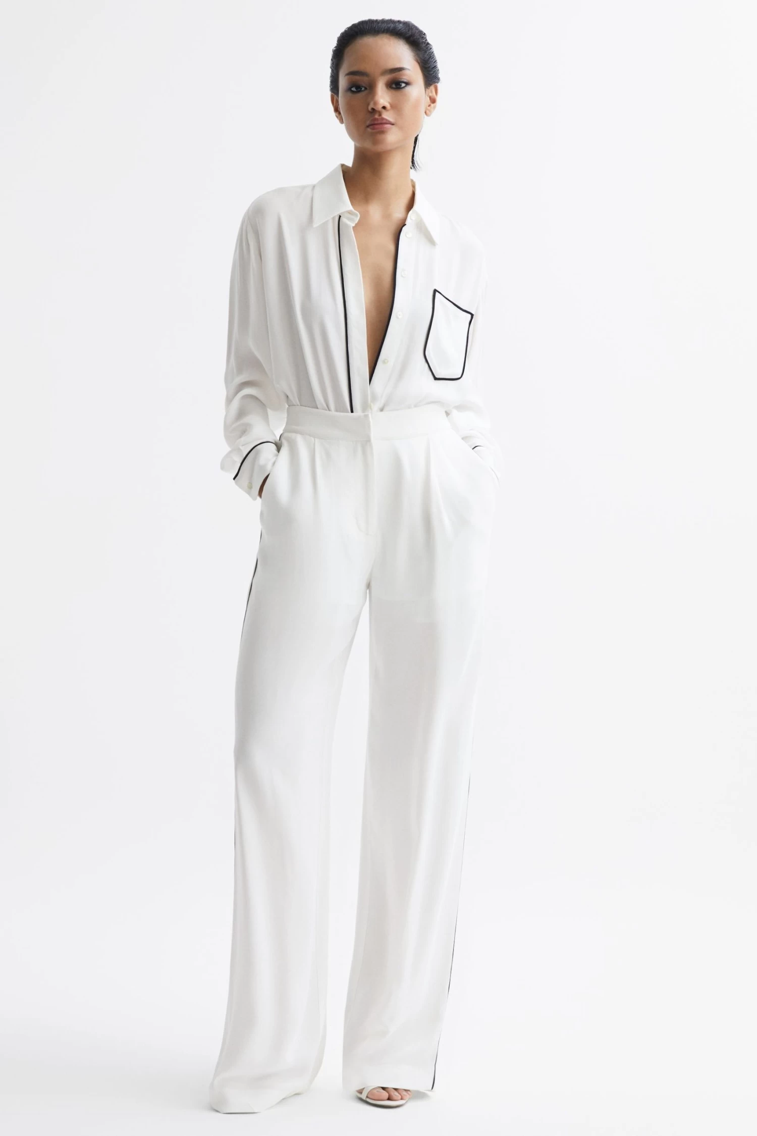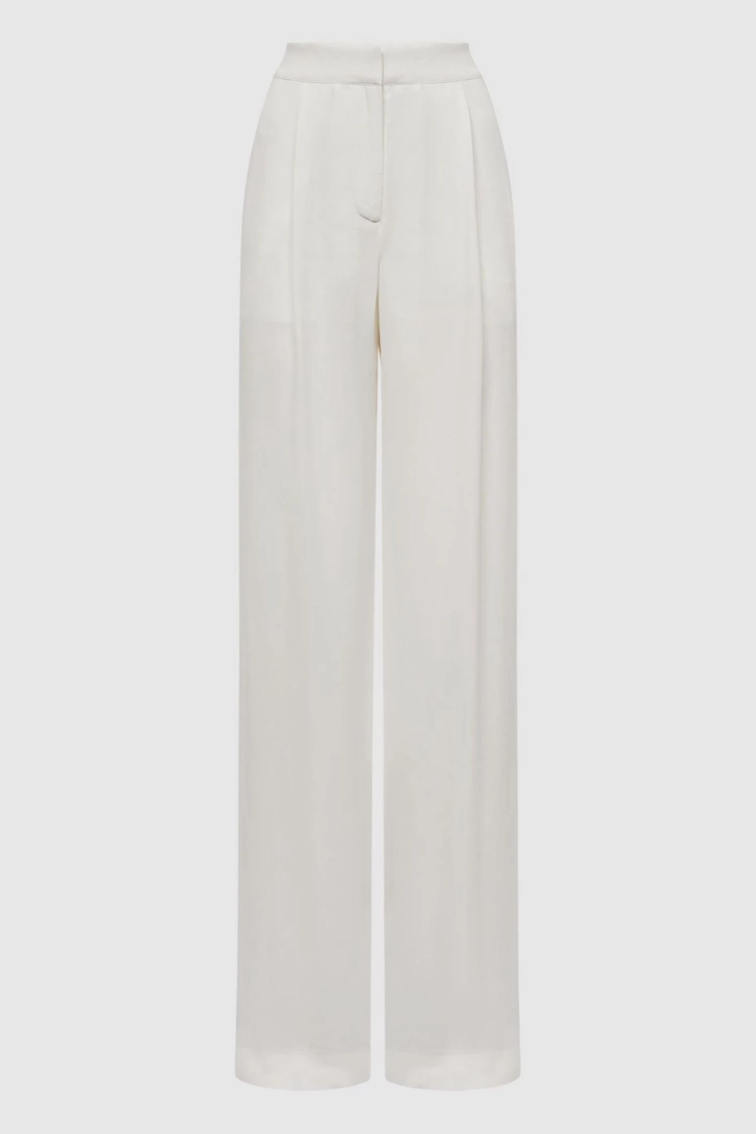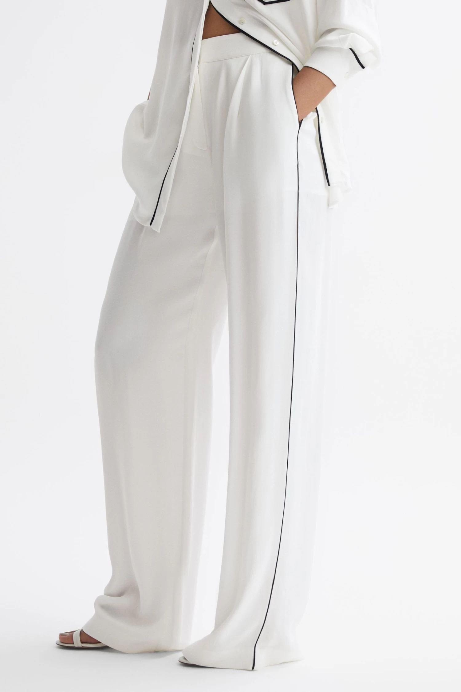 The ivory Gina trousers are cut in a mid-rise, wide-leg profile that skim effortlessly over the silhouette. Side stripe detailing is added for a sports-luxe mood. Team with the matching blouse and heels for a bold evening edit. Mid rise. Side stripe detailing. Side slip pockets. Elasticated waistband. Wide leg. The model is wearing a size 8 Measurements of model: Height 5ft 9″ / 175cm.