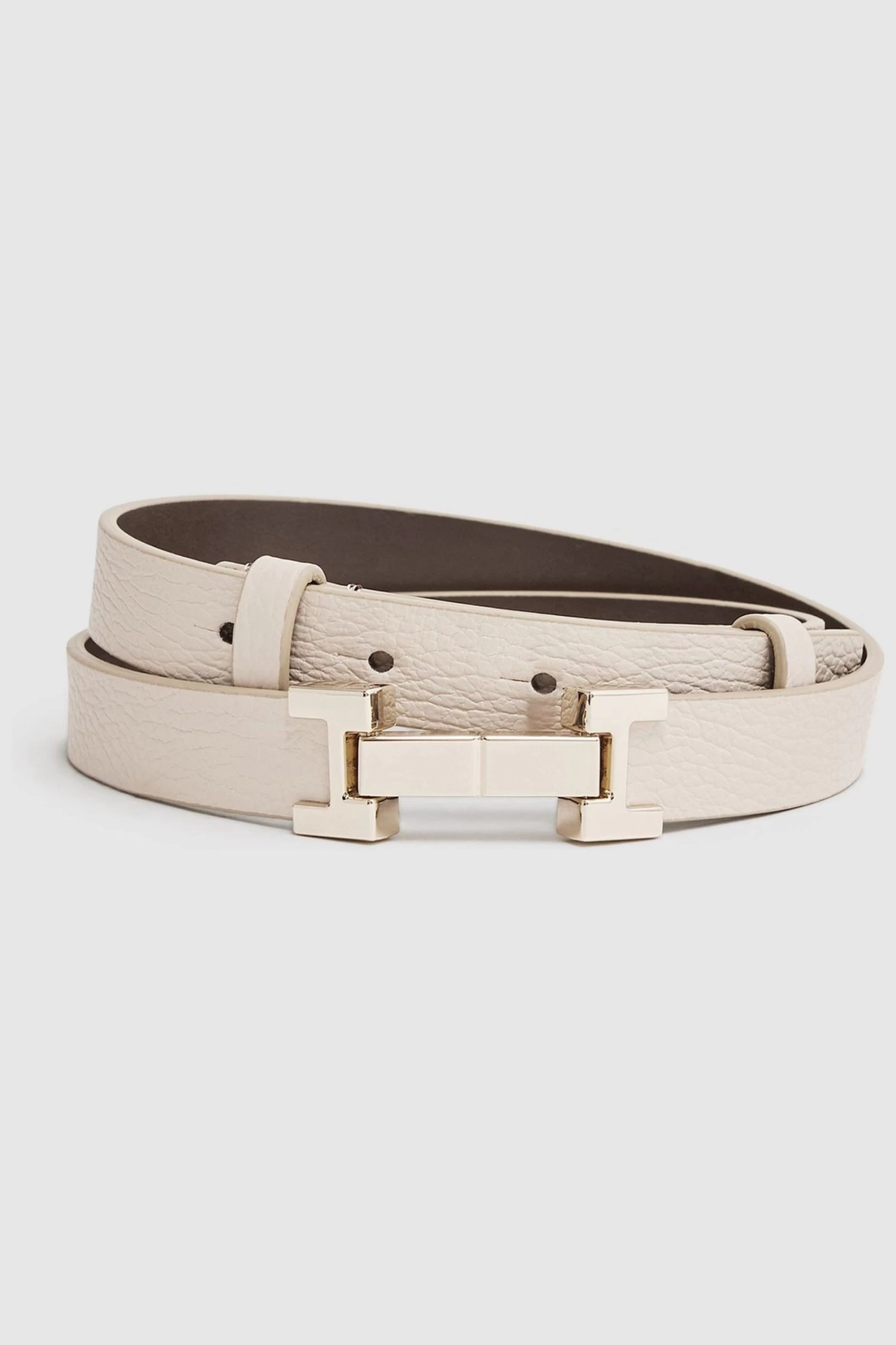 The Hayley belt in stone is crafted from premium leather and it features statement gold-tone detailing that will elevate any look. Wear it with wide leg trousers to compliment your outfit. 100% leather. Slim design. Gold-tone metal detail. Square-hinge fastening. The model is wearing a size S/M Measurements of model: Height 5ft 9″ / 175cm.