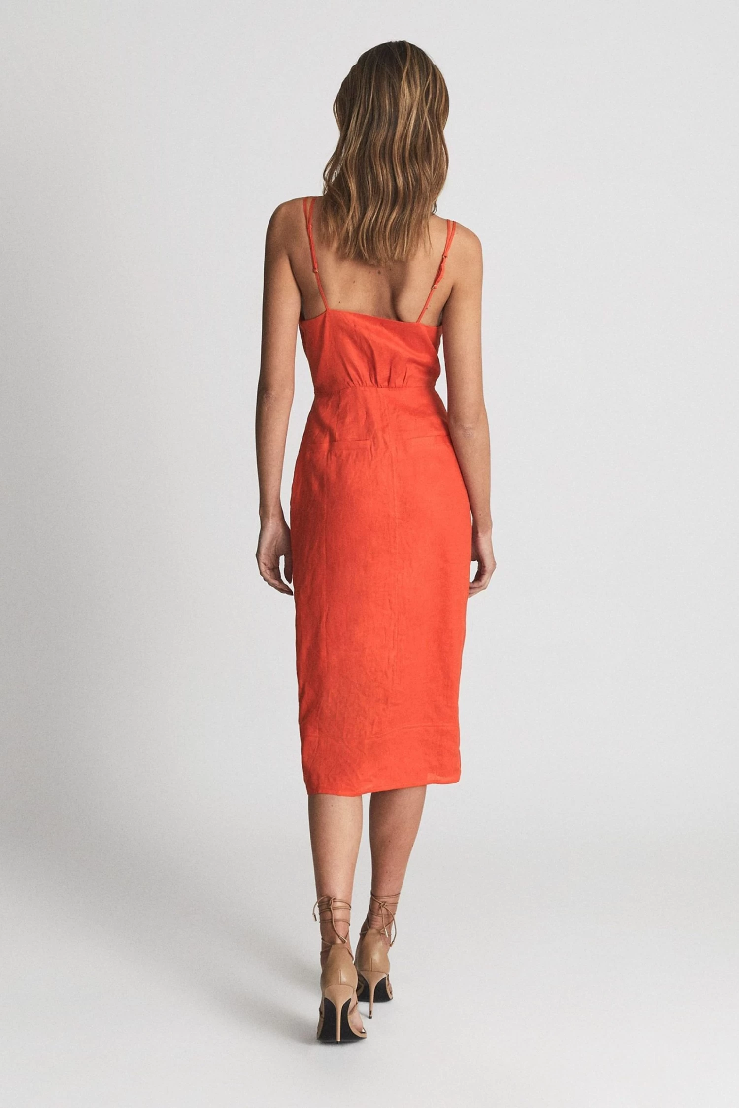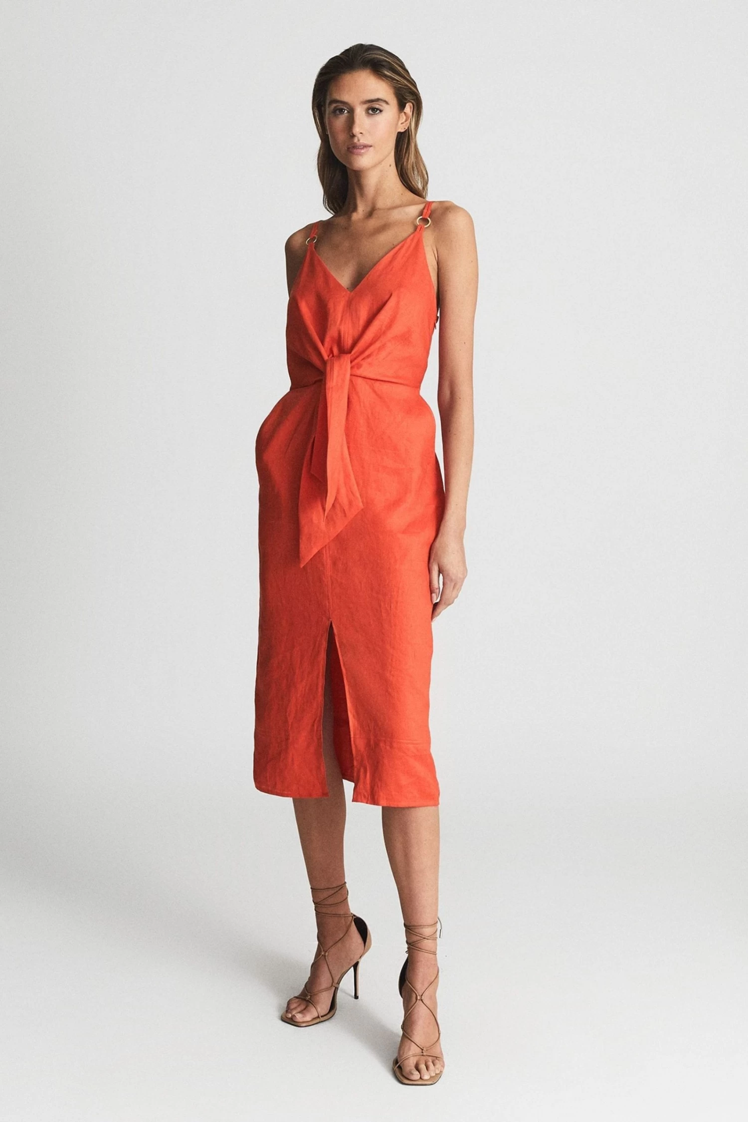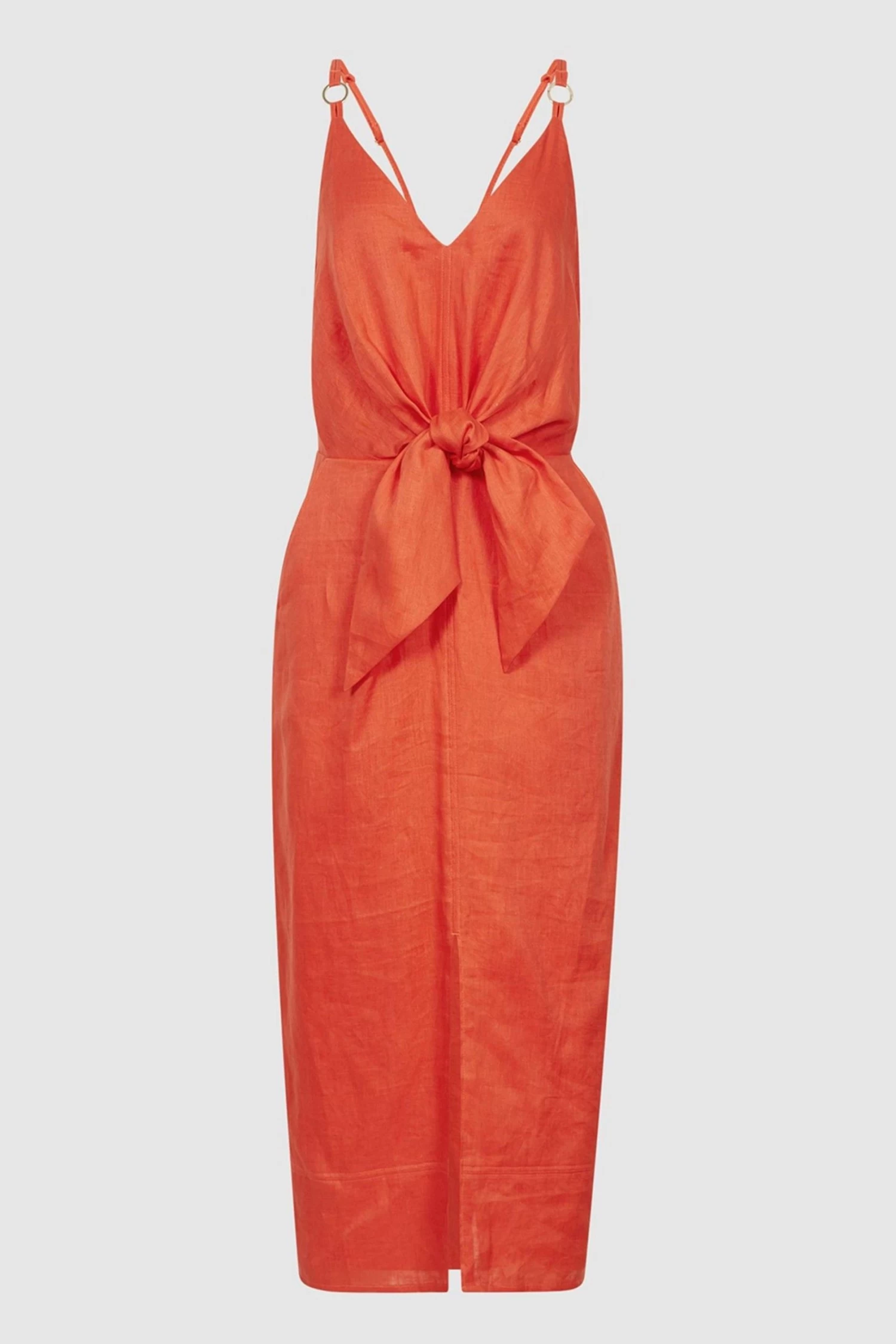 The Kay dress is the perfect dress for all manners of invites this summer. Crafted from linen, this style is detailed with a tie to the waistline and front-split. Style it with sandal heels and coordinating jewellery to complete your look. Tie front. Slim straps. Concealed zip fastening. Mid-length Front-split. Regular side neck to hem 36″ / 92cm.