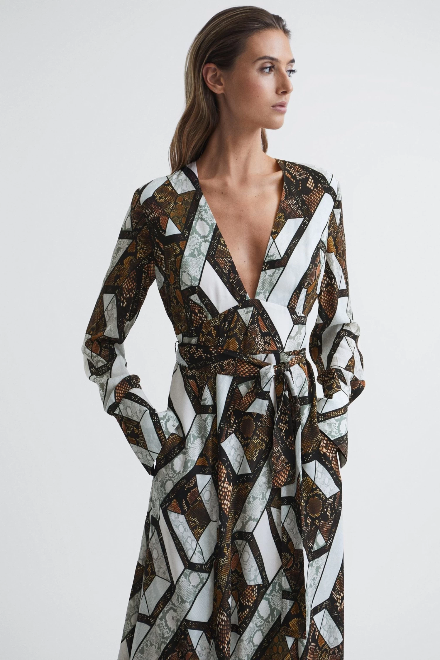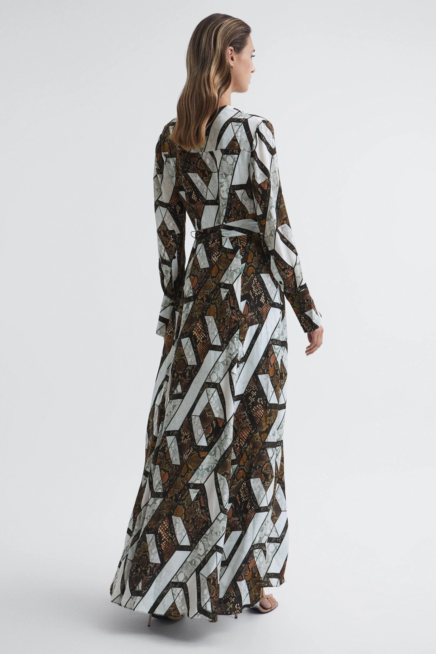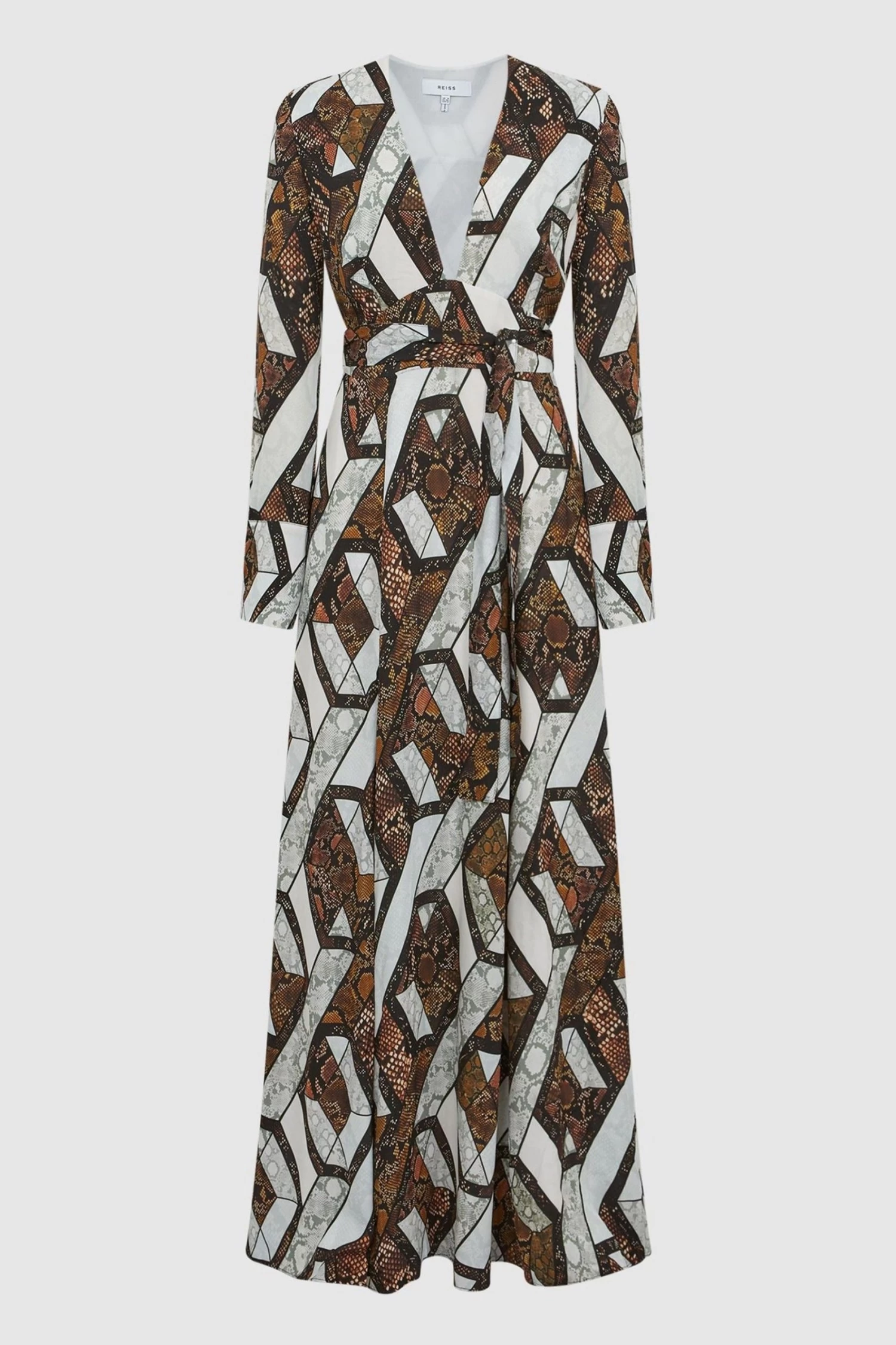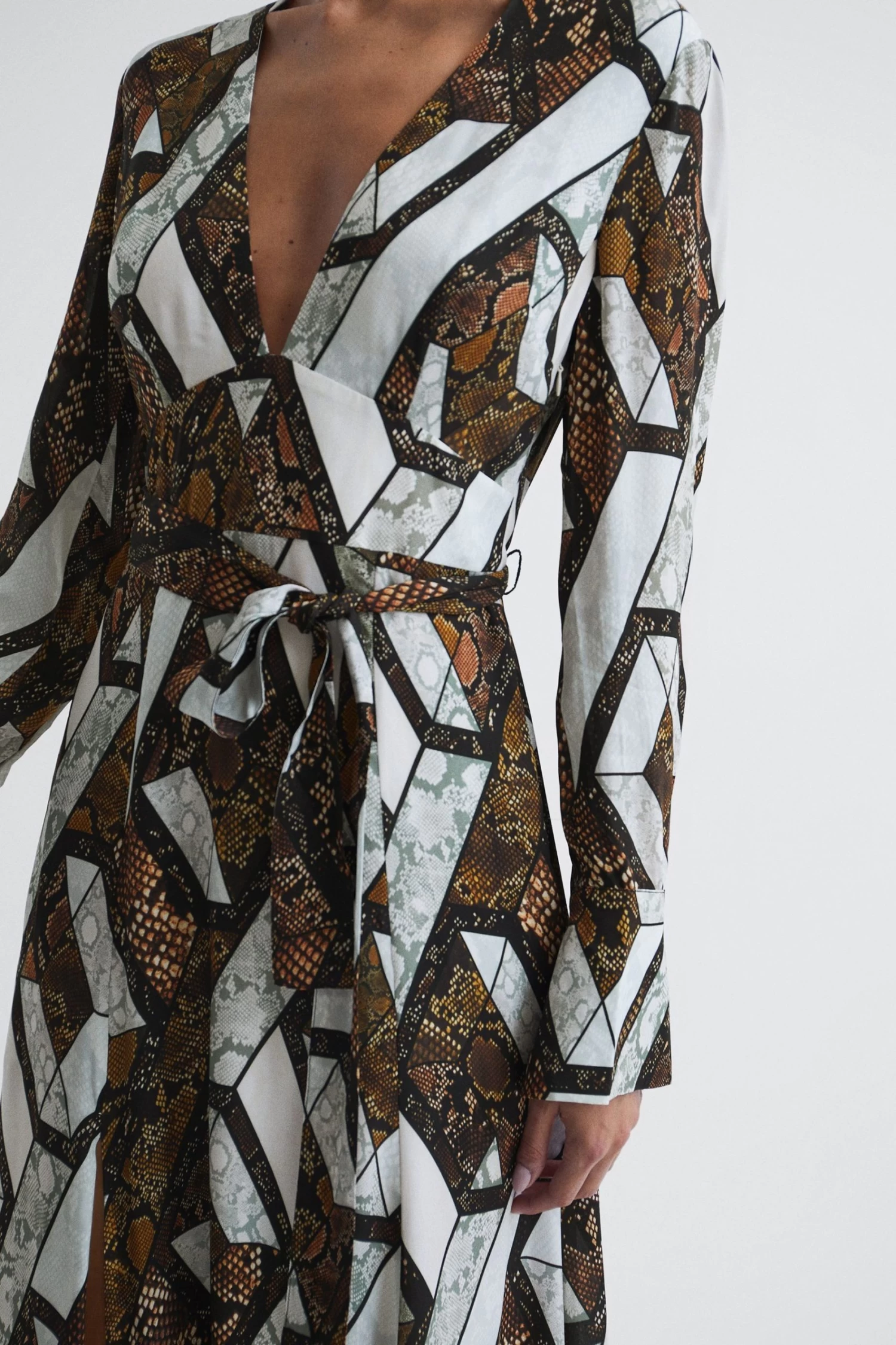Elevate occasion edits with the snake-printed Loren, crafted in a sweeping maxi silhouette with a front split that adds allure. It features long sleeves with statement extended cuffs, and a plunging V-neckline that further accentuates the profile. Add heels for a sophisticated finish. Plunging. V-neckline. Long sleeves. Statement cuffs. Self-tie waist. Front split. Zip closure to side. Printed. Lined. Maxi length.