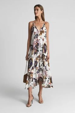 The plunging neckline of the Mabel dress accentuates the frame. It s made from viscose twill that naturally drapes over the profile, topped with slender shoulder straps then features a tie detail at the back. Wear it to special events for a confident stride and an elevated aesthetic. Narrow straps. Plunging V-neckline. Back ties. Handkerchief hemline. Maxi length. Relaxed fit. Floral print design. The model is wearing a size 8 Measurements of model: Height 5ft 10 / 178cm, Chest 32″ / 81 cm, Waist 24″ / 61cm.