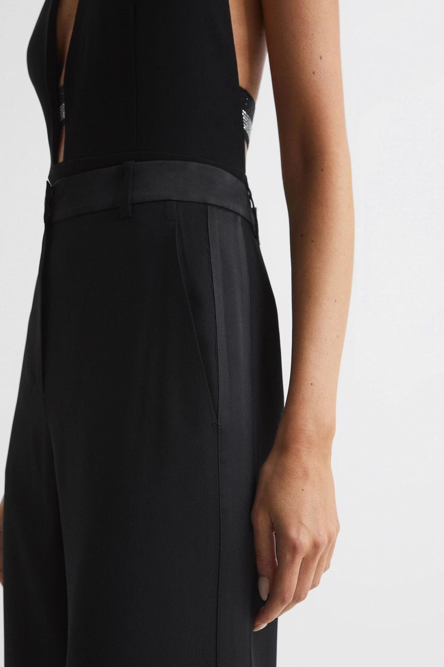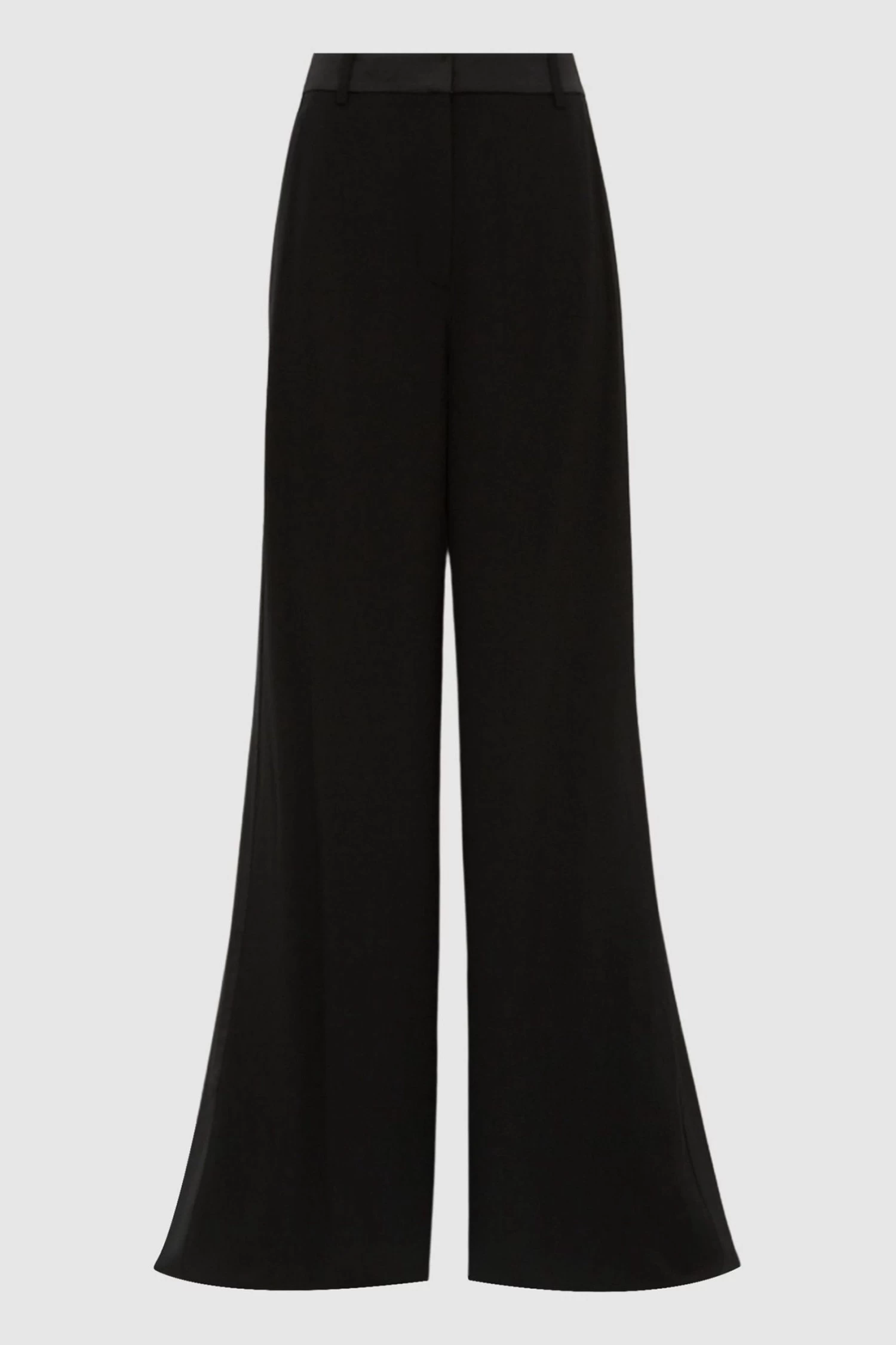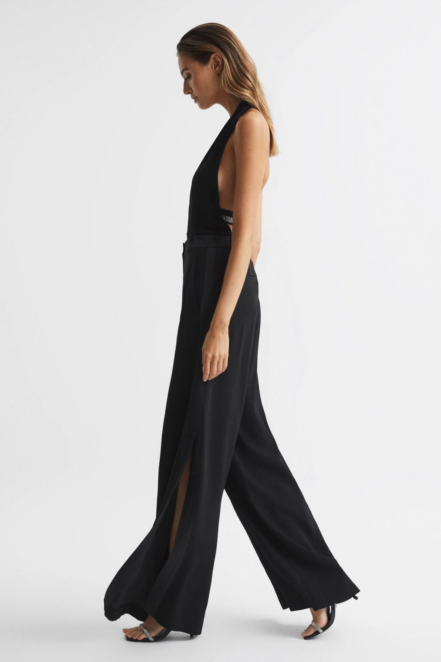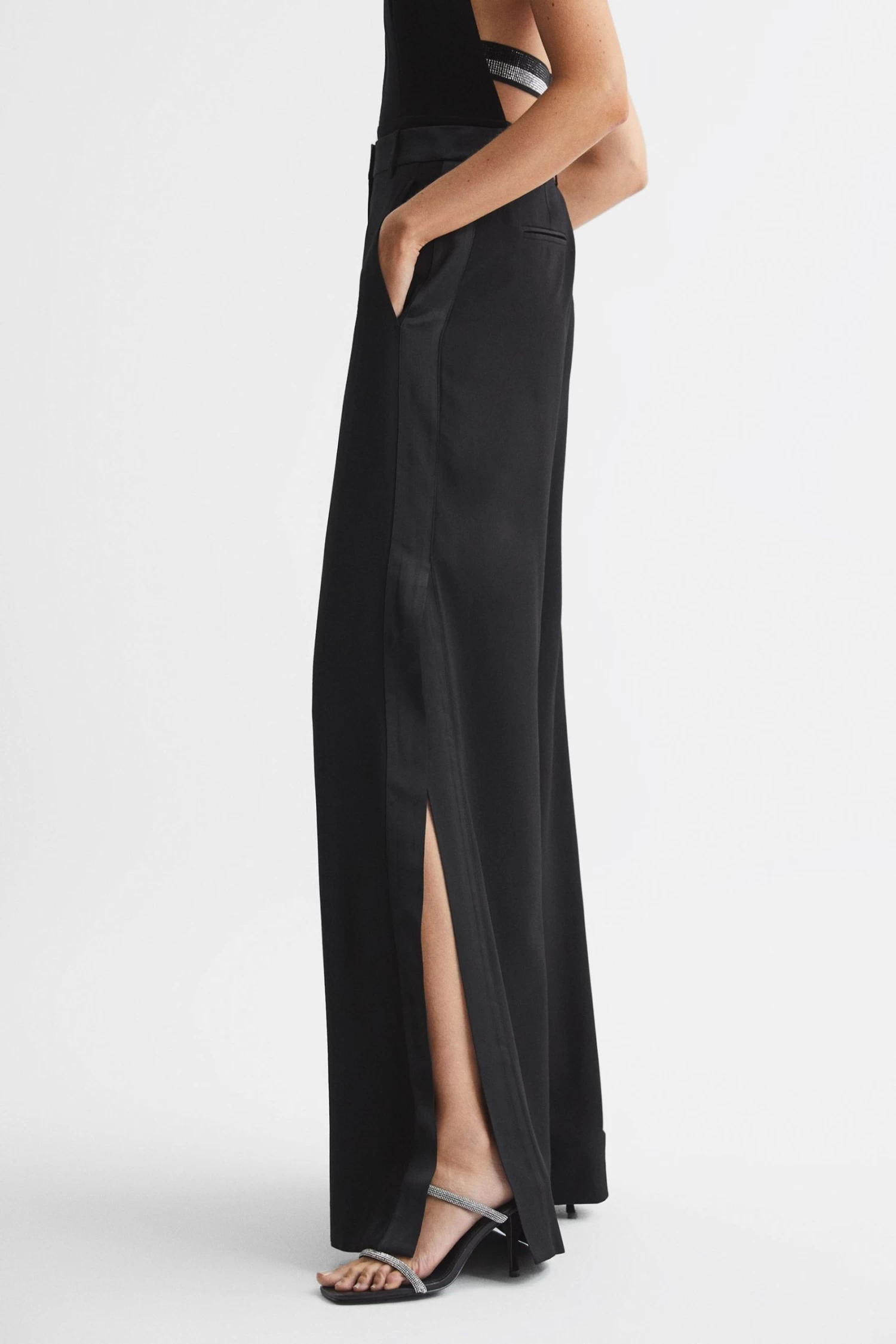 The Sienna trousers in black impart a dramatic mood, crafted with a wide leg and an extreme split to each side. They sit high on the waist for a flattering appearance. This style is finished with contrasting satin trims to further elevate the look. Add our embellished bodysuit and heels to steal the show. High rise. Zip fly and hook closure. Belt loops. Side pockets. Extreme side splits. Contrasting satin trims. Wide leg.