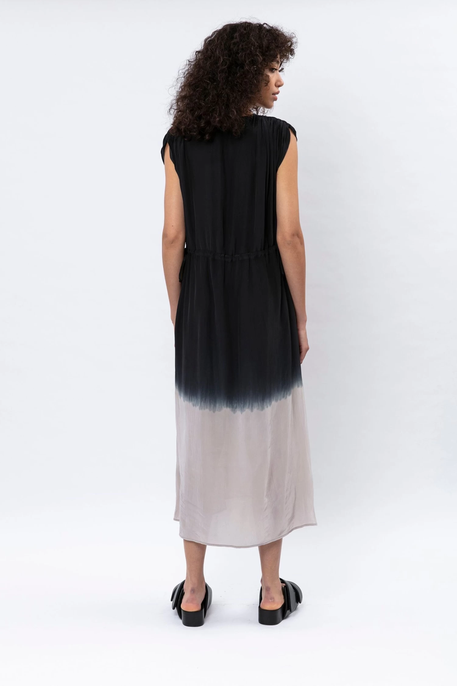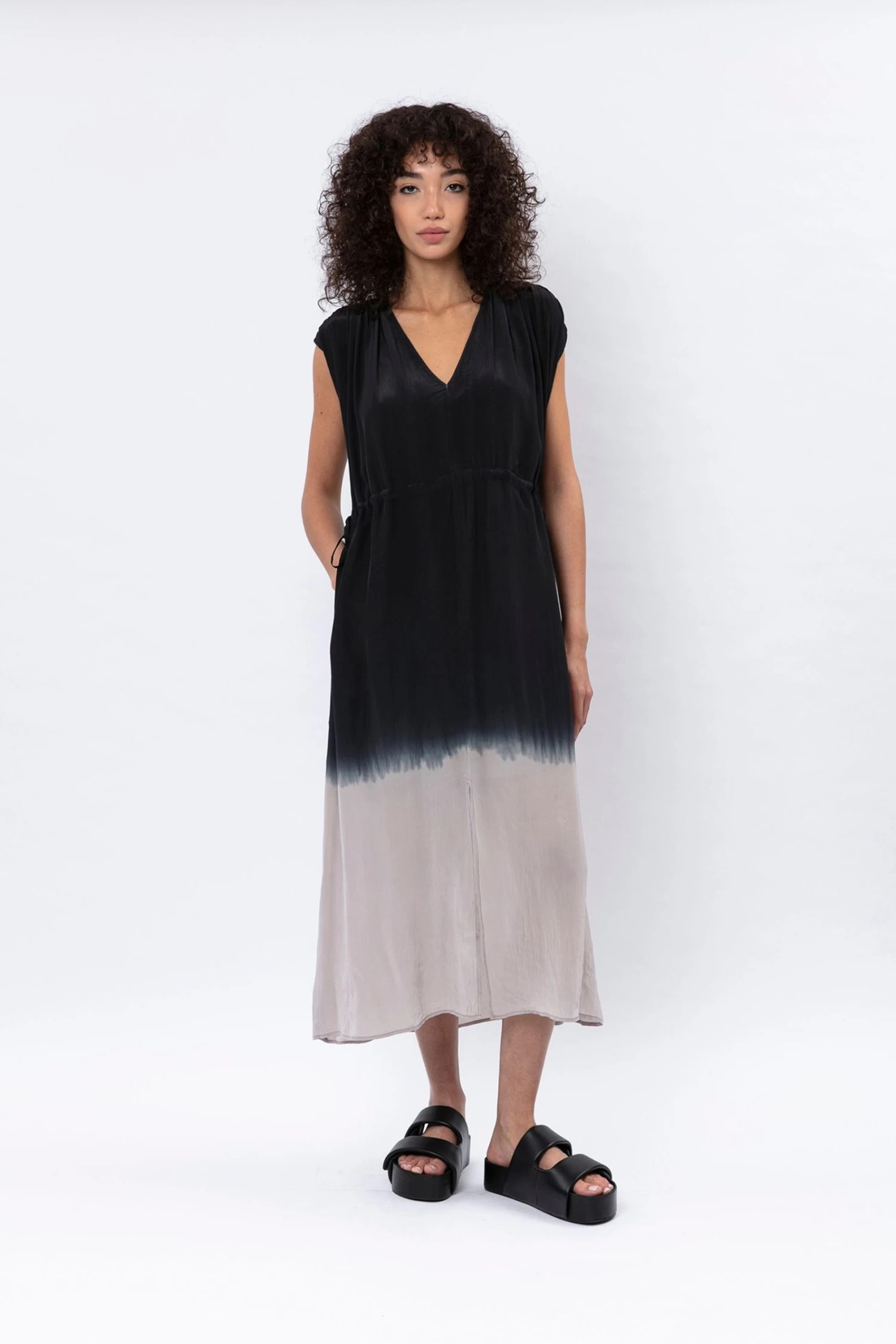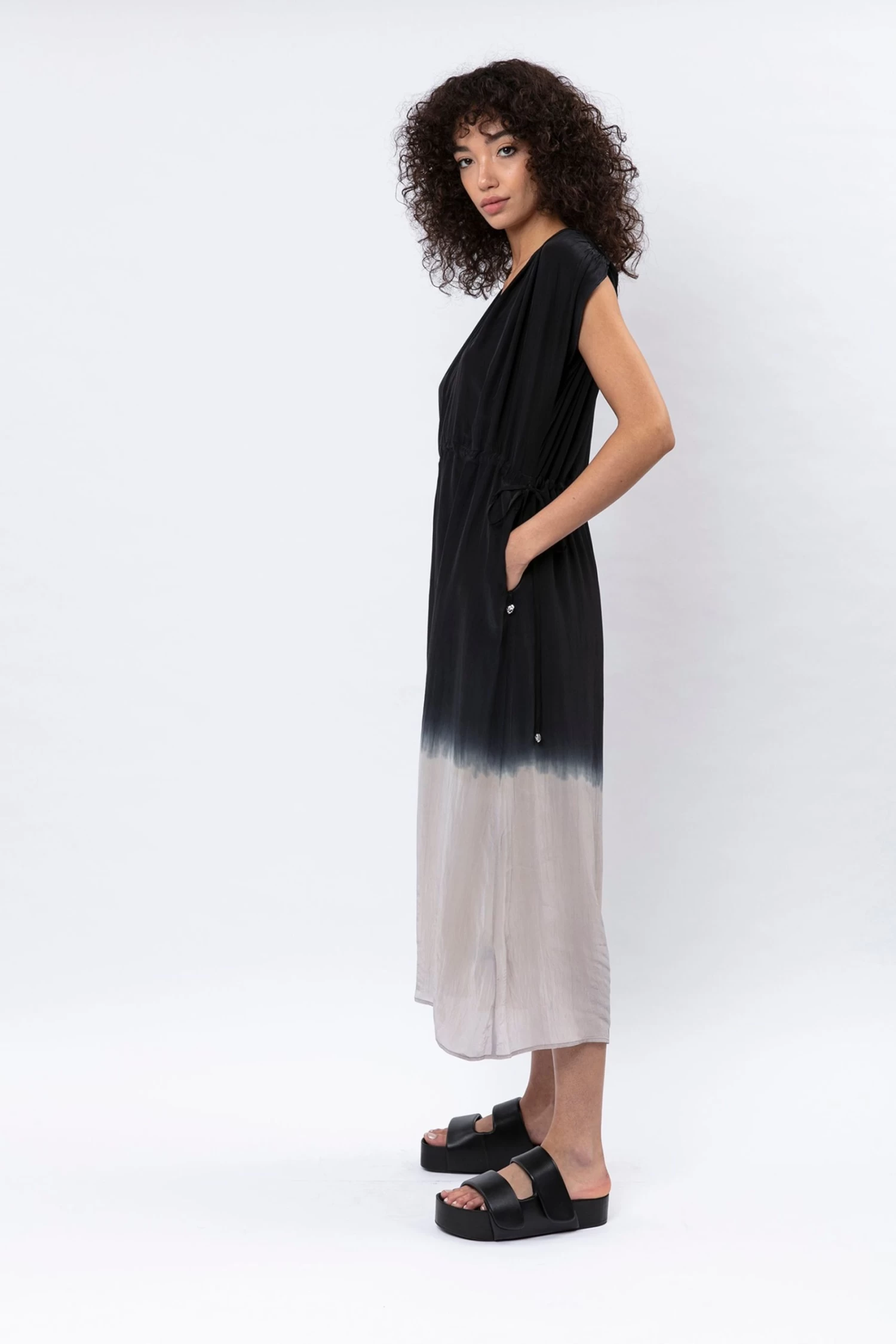 The Peridot Day dress combines relaxed femininity with great styling detail. This relaxed style with an easy V-neck, centre front slit in the skirt part, gathered shoulders with a tie detail and a drawstring waist with skull cord ends, can be worn cinched in or loose and boxy. This midi dress has pockets and comes in a selection of dip dyes and hand painted prints. Its made from our Vegan silk; bear in mind this luxurious fabric does need a quick steam or light iron to look and feel its best. The model wears a size S equivalent to a UK size 10, the outer layer is loose and boxy, but bear in mind the detachable camisole lining with adjustable straps is more fitted, should you decide to go a size down. Perfect for every day or beach holidays.