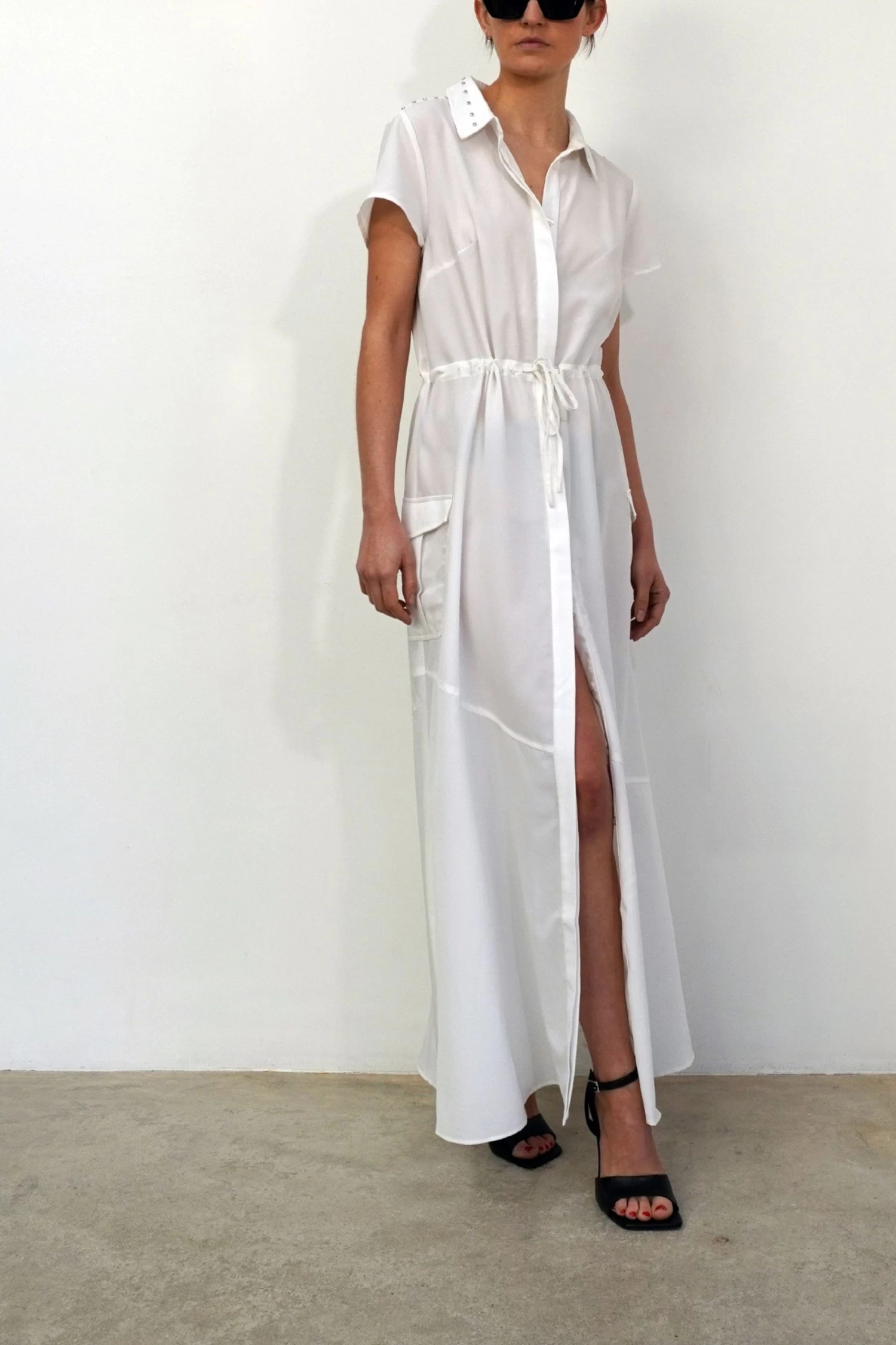The Vital Maxi dress is a great workwear option with utility style patch pockets detailing and shoulder stud detailing. Our soft crepe cap sleeve empire maxi shirt dress hits all the smart style notes just right. Designed in a flattering and light fabric with shirt style button through front, short sleeves, a fluted empire skirt and a drawstring waist this is so easy to wear from desk to dinner, dressed up or down. Pair with heels or boots, whichever way it oozes effortless elegance. The model wears a size 8.