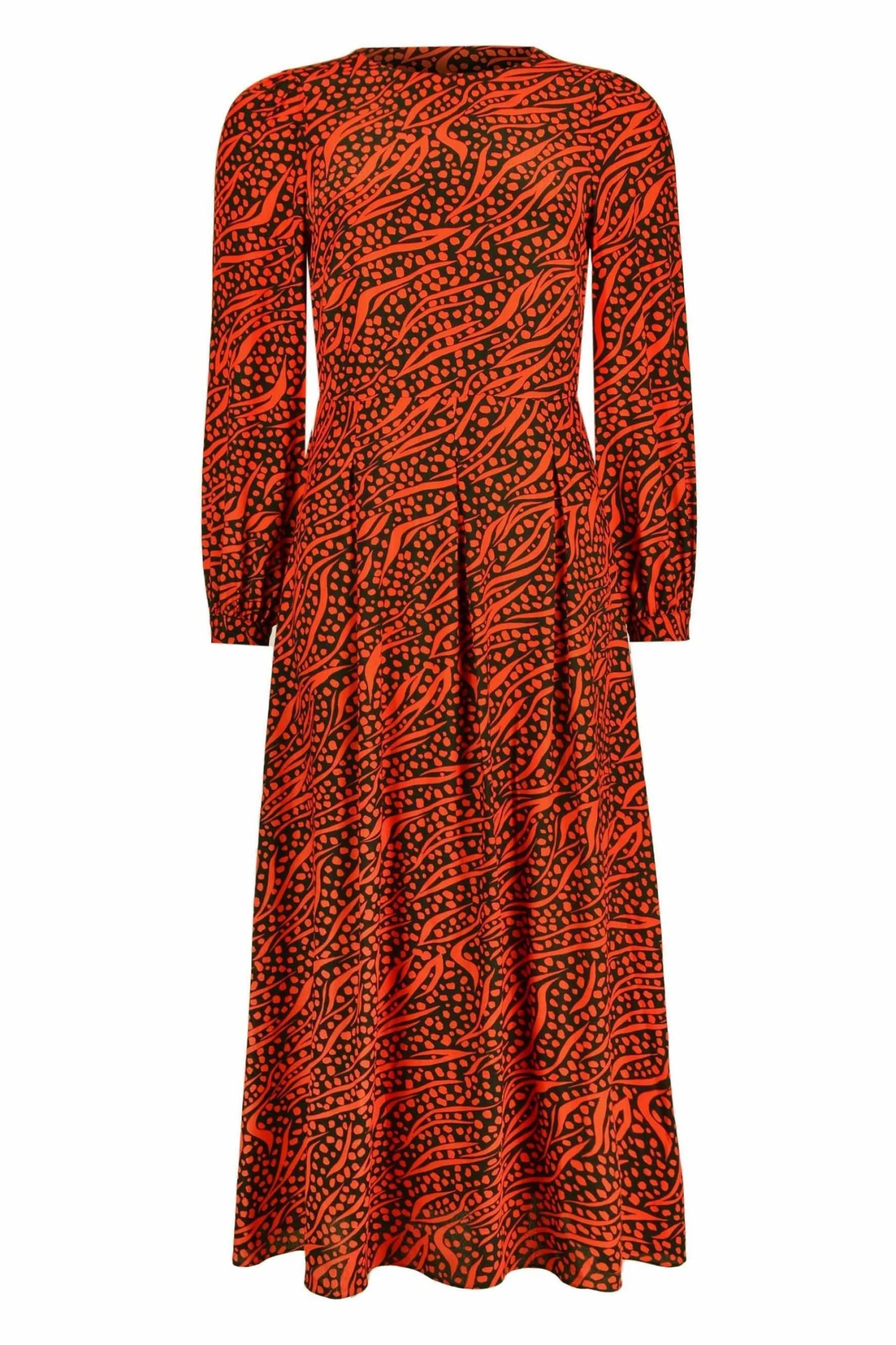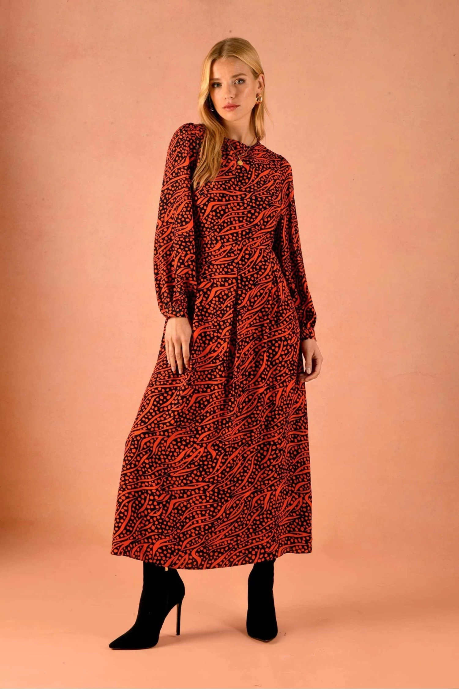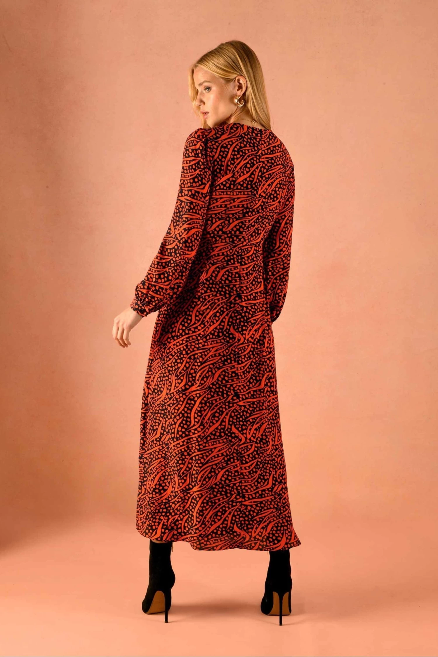 Designed in a midi silhouette, this black grounded round-neck dress is printed all-over with a bold, abstract red pattern. It features beautiful pleat details on the front skirt to give a flowing form with long, blouson sleeves with shirt cuffs for an elegant feel. Cut from a 100% ECOVERO™ viscose Morrocaine that has a textured crepey hand feel, makes for an elevated day dress. Style yours with boots or trainers for chic everyday dressing.