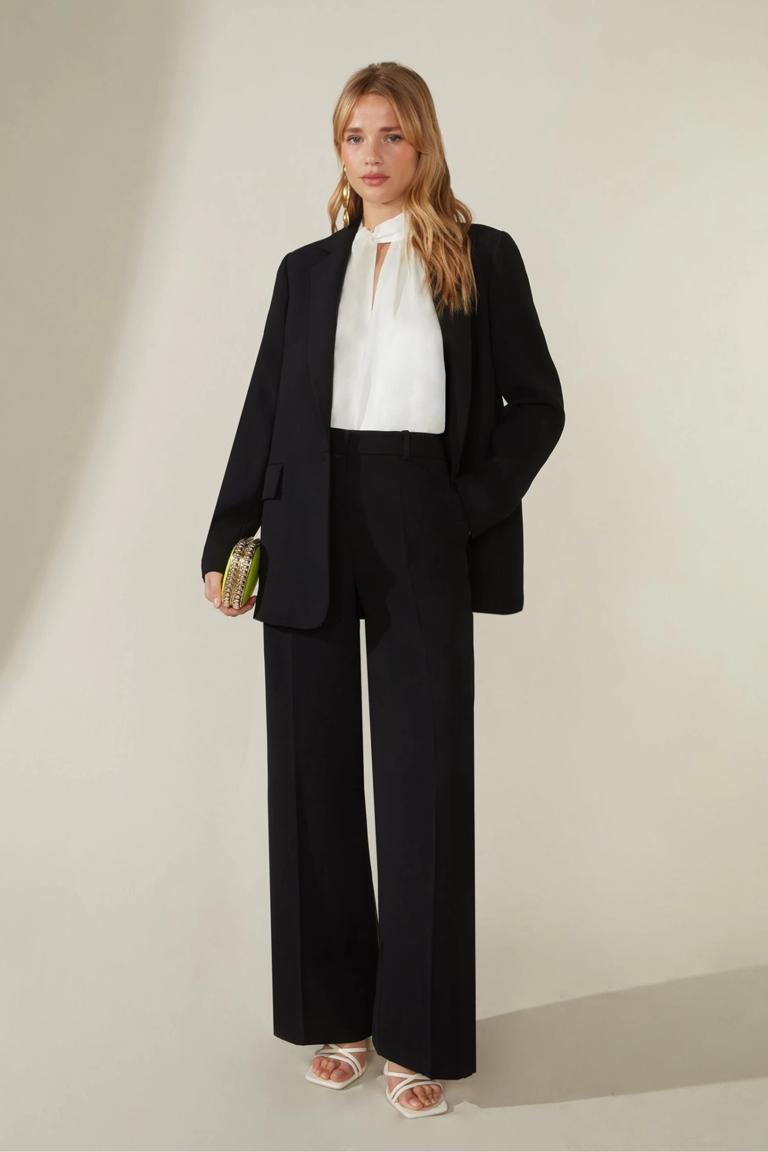 Our Wide leg trousers in black are a bold and feminine style. Paired with the matching blazer making it the perfect suit for a special event. This style will certainly be a head turning look for any event, style with strappy heels to finish the look.