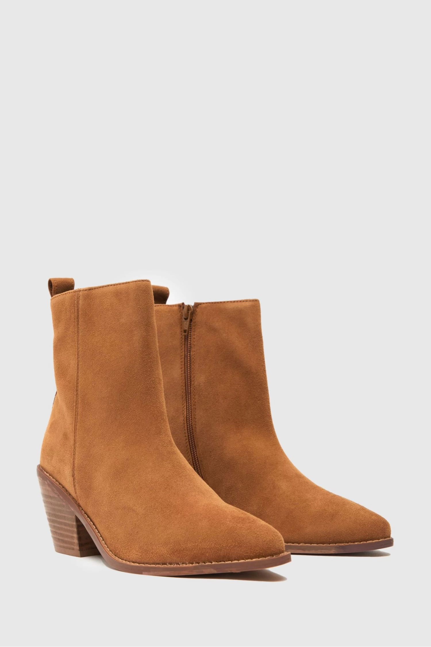 The tan Callie Suede Western Boot arrives from schuh! Here for the new season, featuring a suede upper with a pointed toe and angled block heel. This versatile western ankle boot is perfect for dressing up or down, you decide!