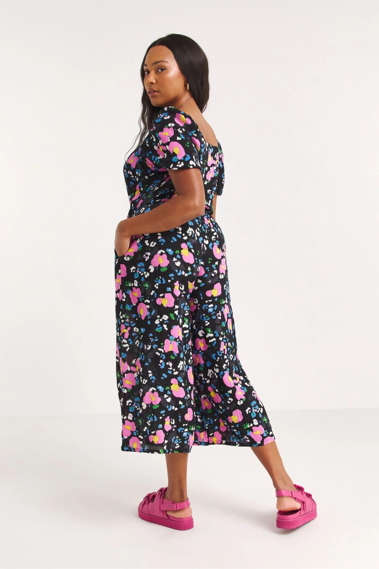 Invest in a jumpsuit this spring! Our sweetheart jumpsuit is the perfect piece. A fun animal print and a culotte shape, all in our seasons favourite crinkle fabric. Pair with some chunky black trainers for a comfy but cool look.