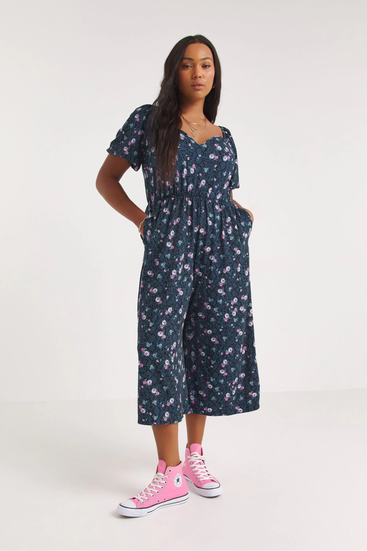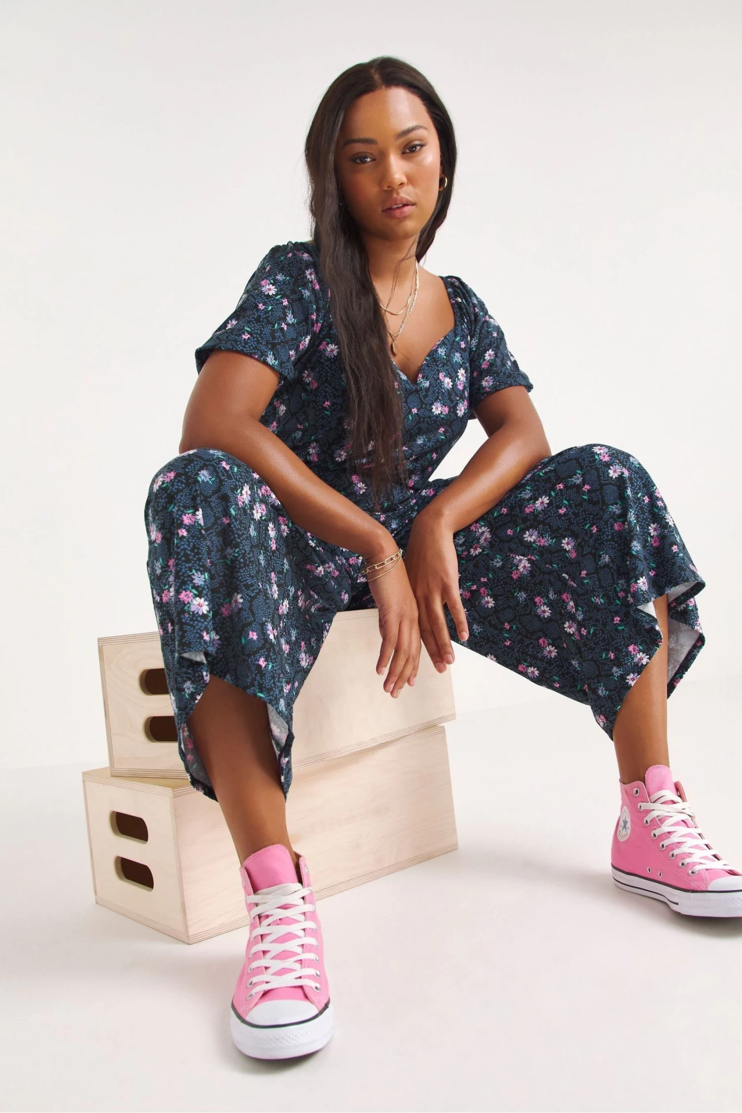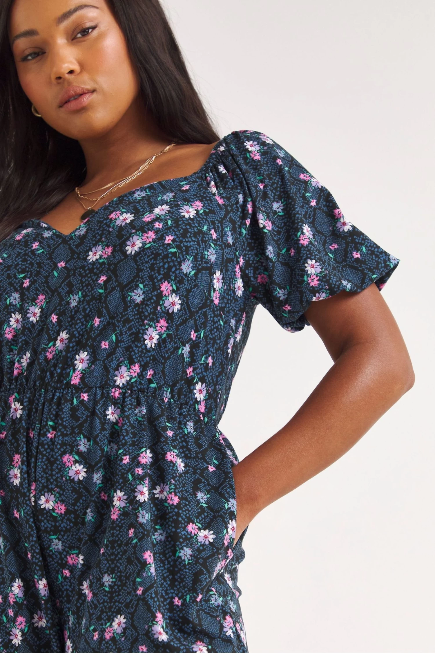 Be bold this season with our mixed floral and snake skin print. All feautred on a supersoft wide leg jumpsuit. With an elasticated waist and a slight puff sleeve, you will feel super comfy and look amazing at the same time. Chuck on with your favourite pair of chunky trainers.