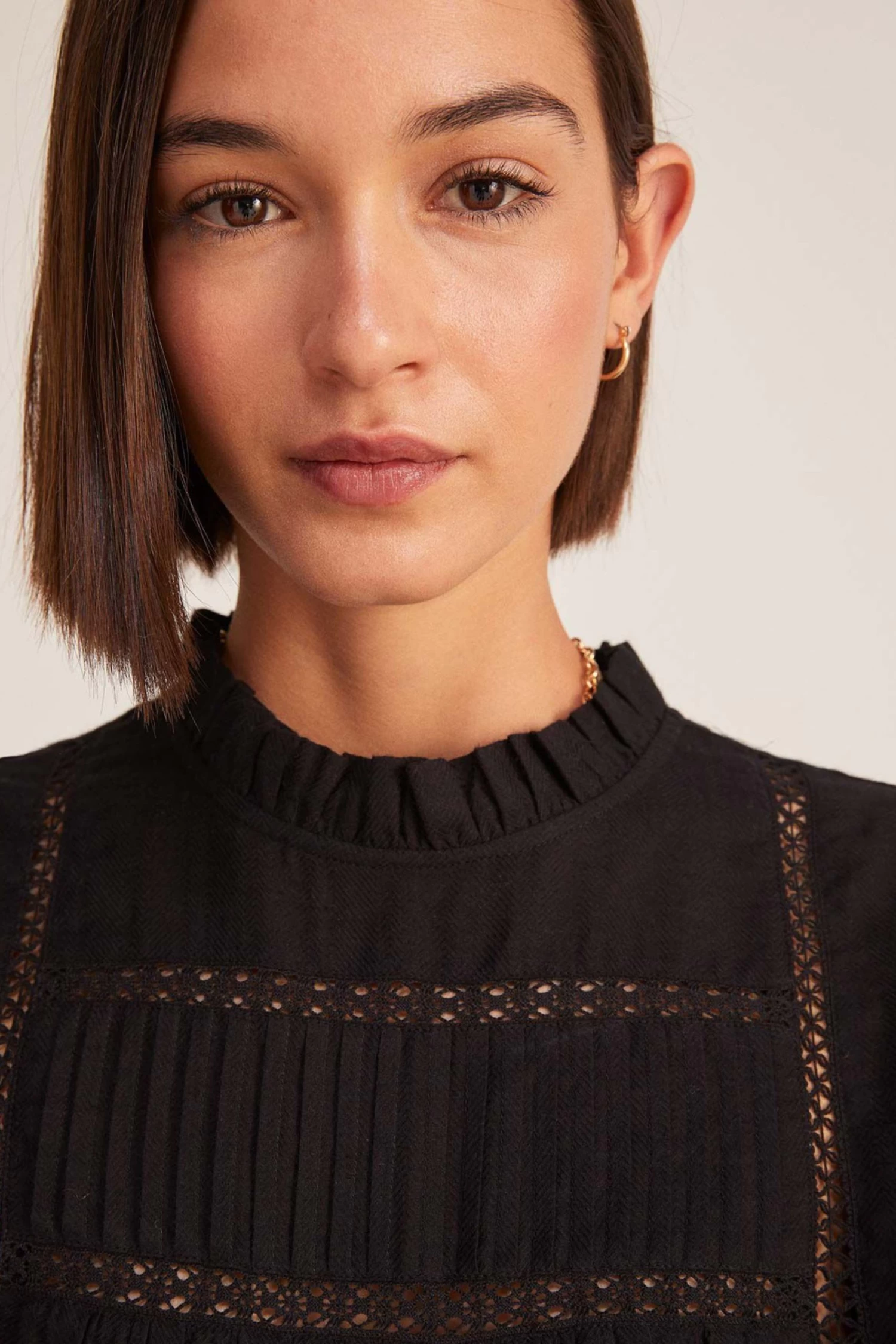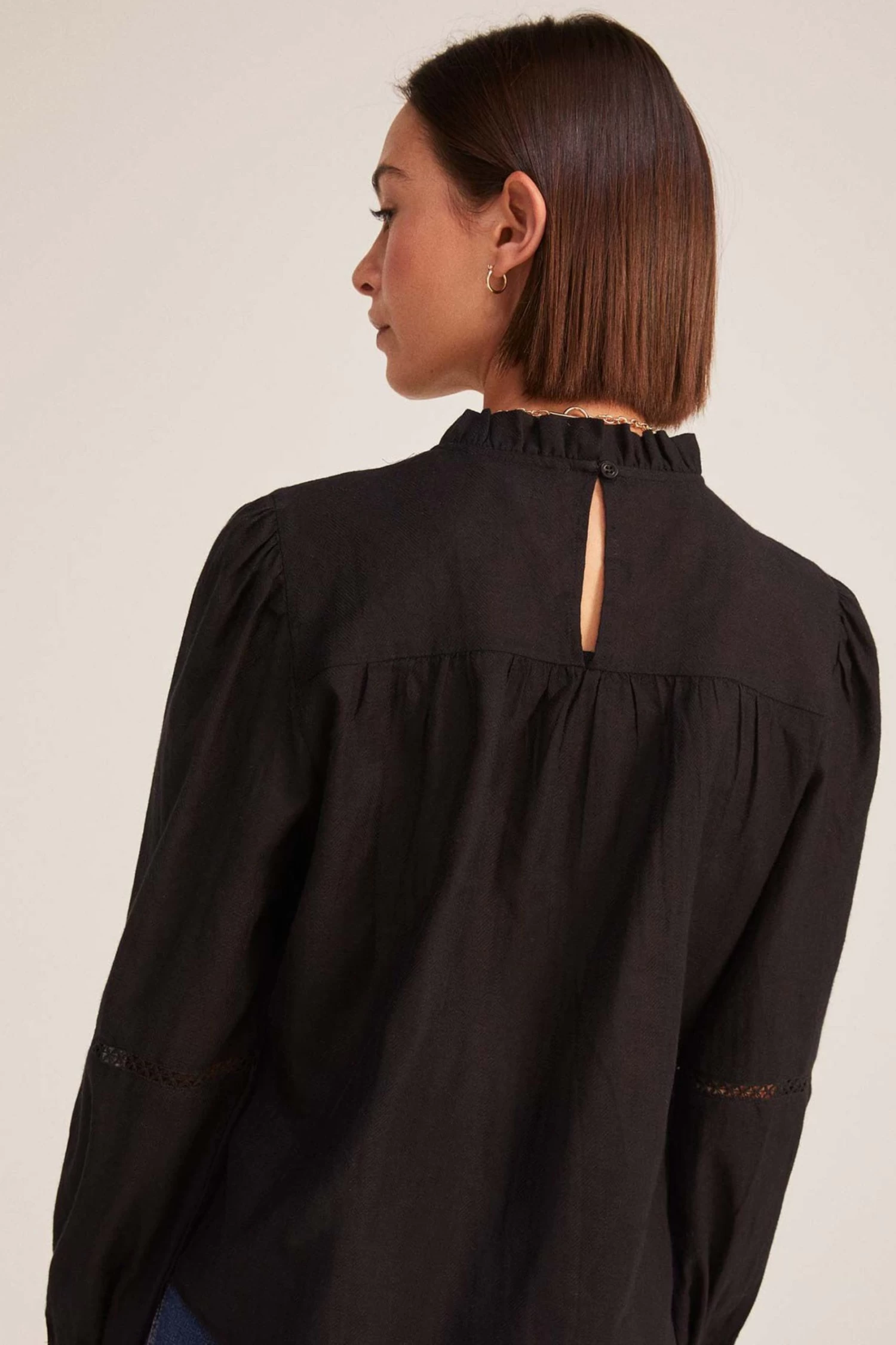 Blouse with long voluminous sleeves, round neck with mini frill, buttoned opening at the back, lace and pleats at the front, with buttons on the cuffs.